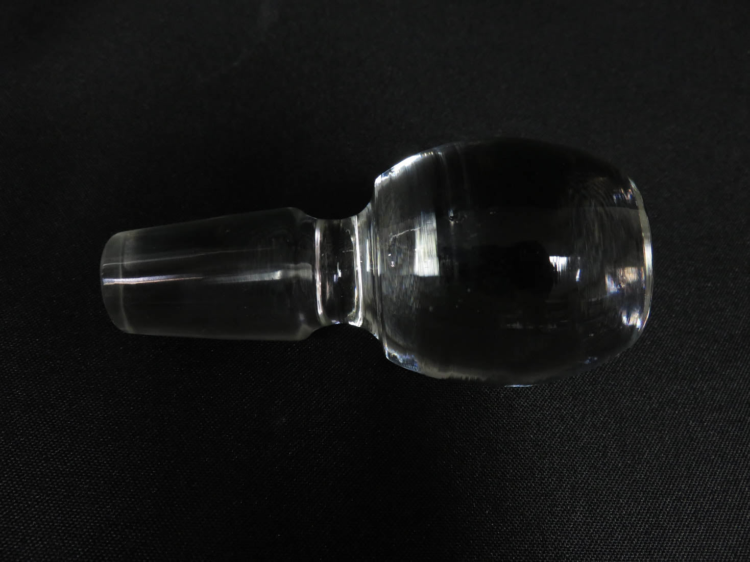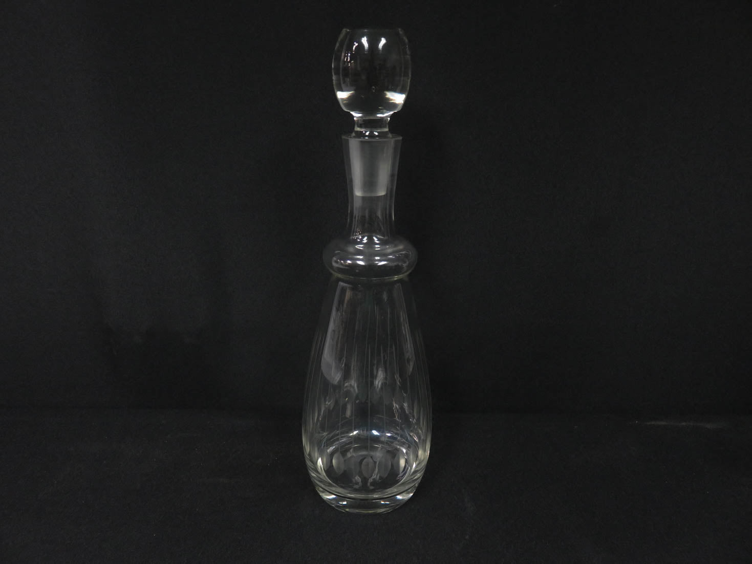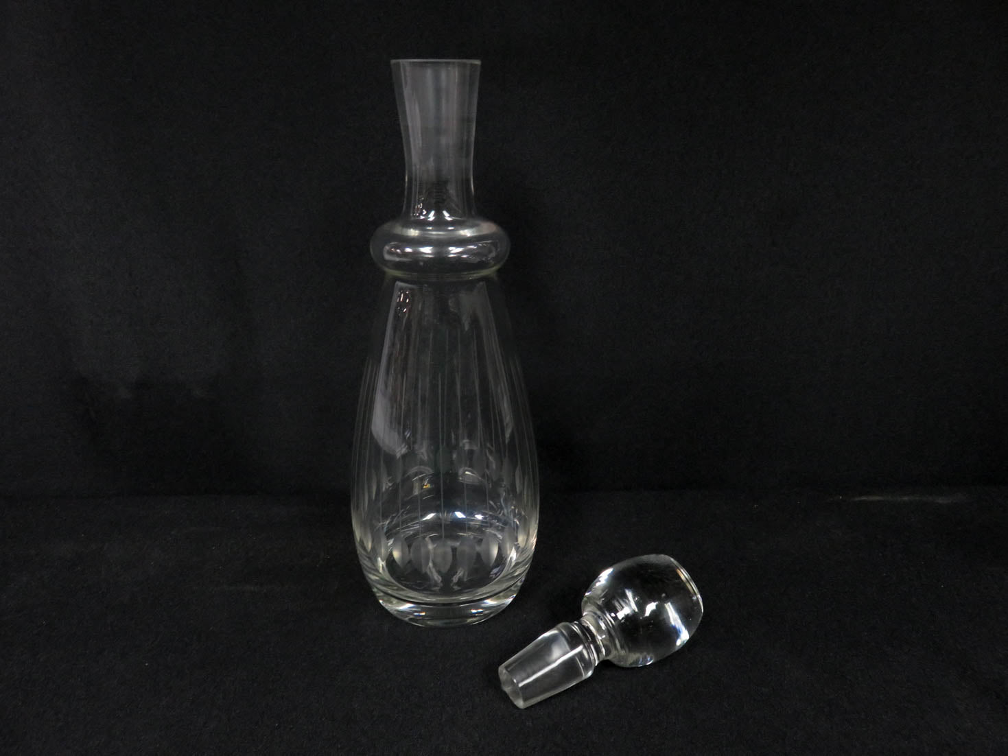 Hand blown with etched stripe & leaf pattern, flat topped stopper.