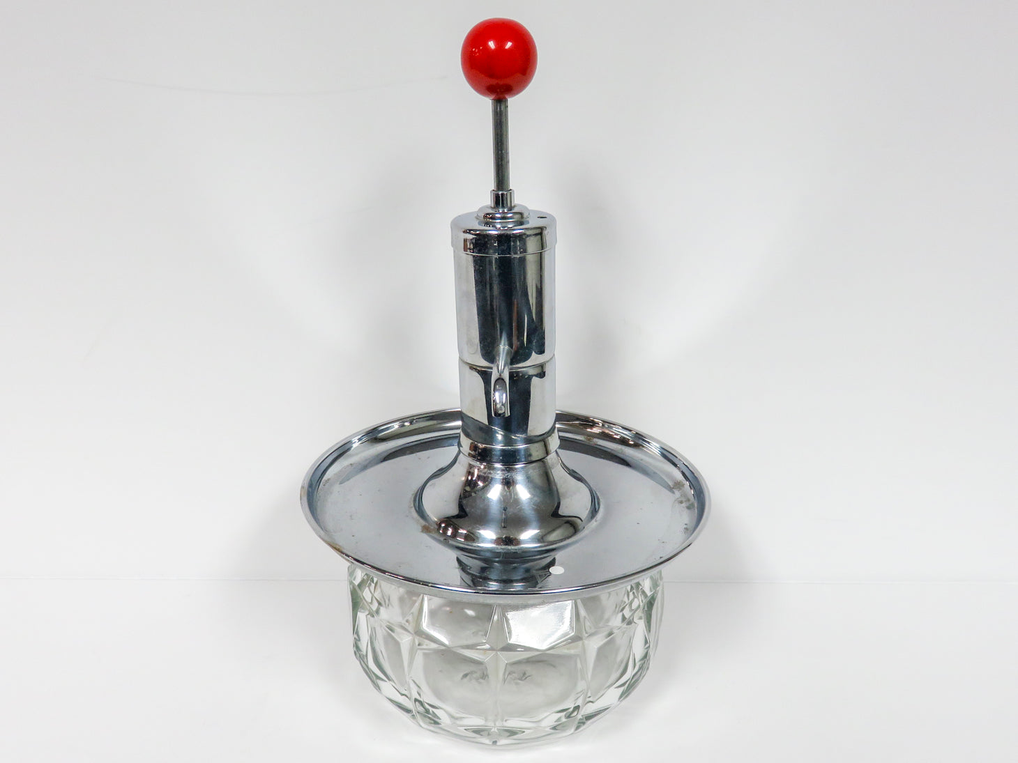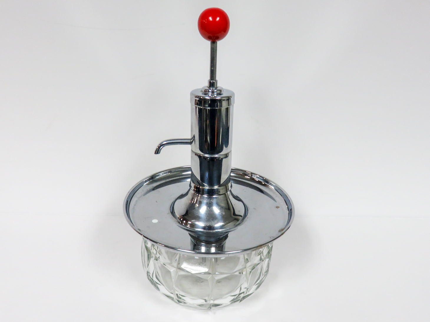 Item Number: 5100-222 Chrome pump with red knob. The glass base is globe shape with diamond pattern. Revolving tray holds your shot glasses. 7" x 12"