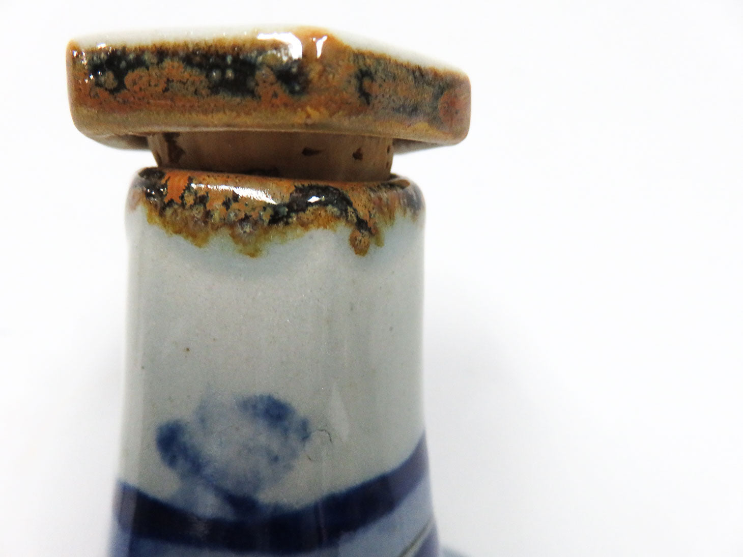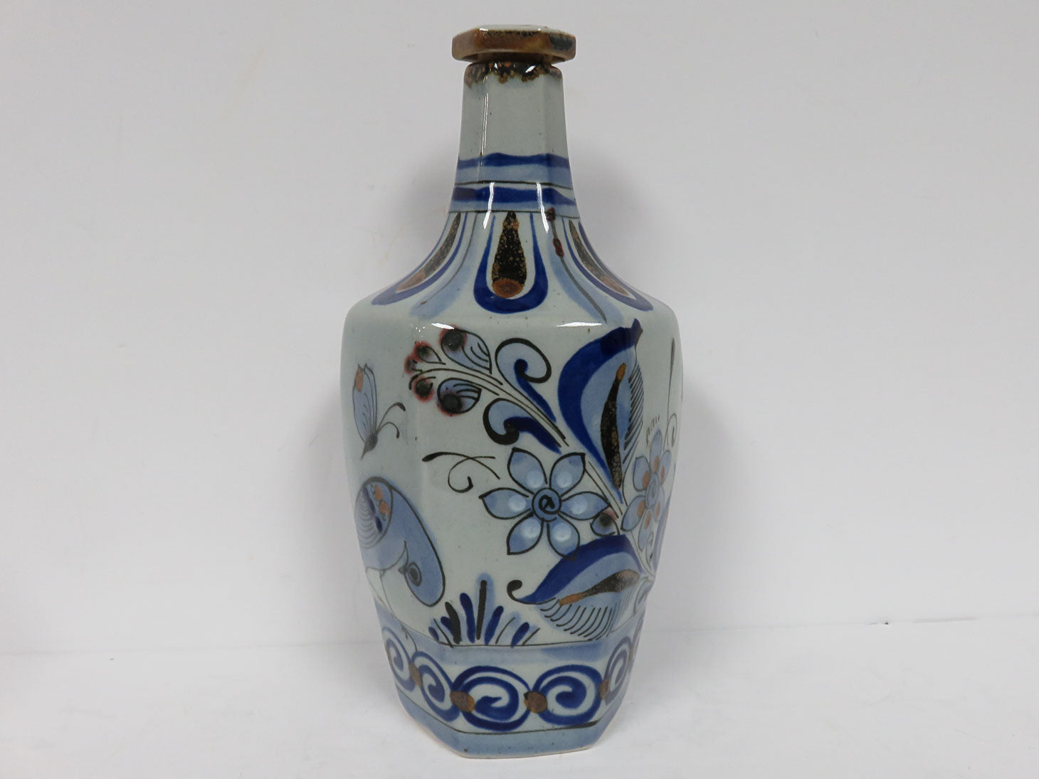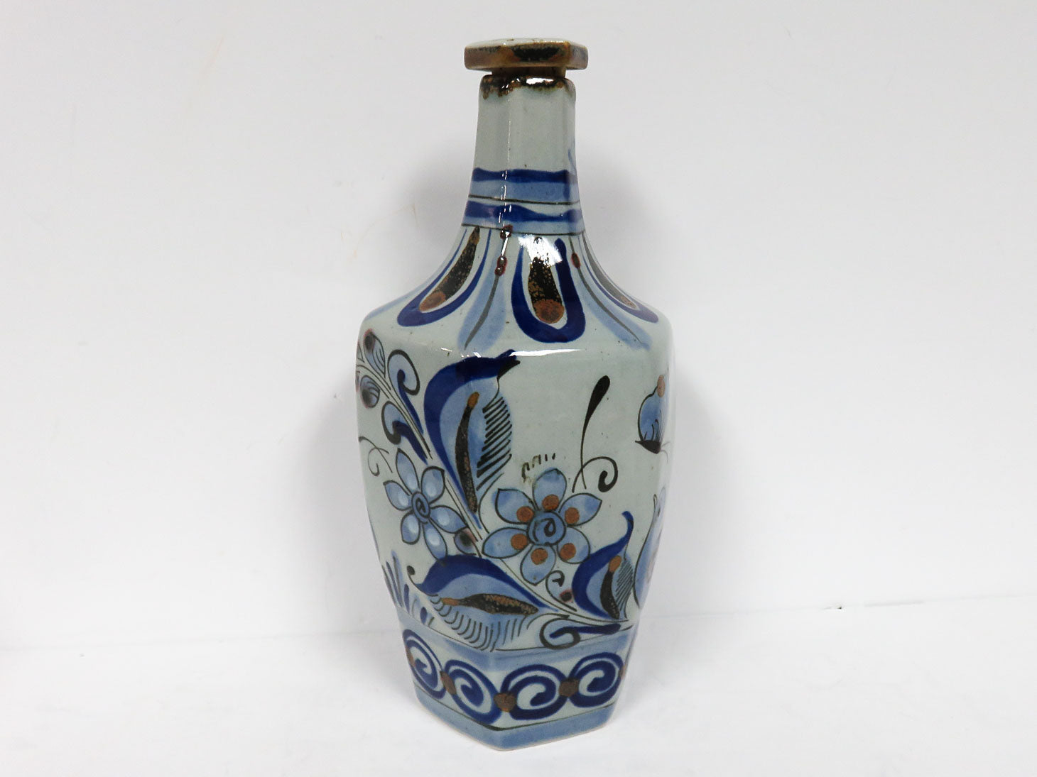 Tonala pottery in gray and cobalt, brown bird and floral design, cork stopper, 2 pcs. 9.5" H