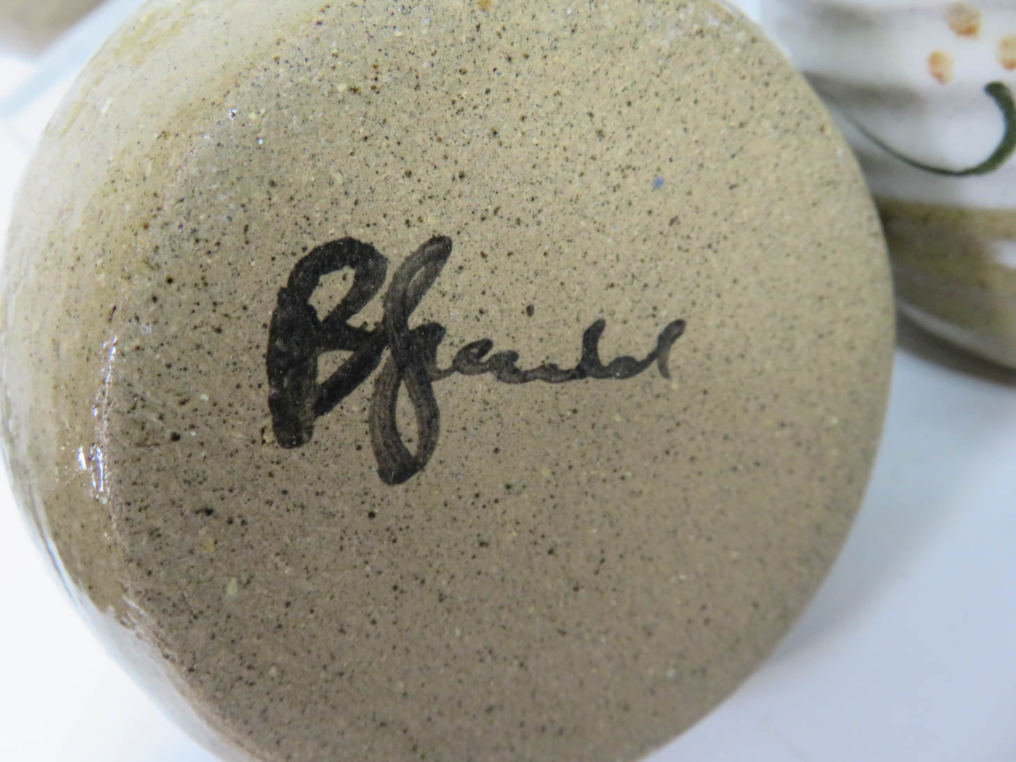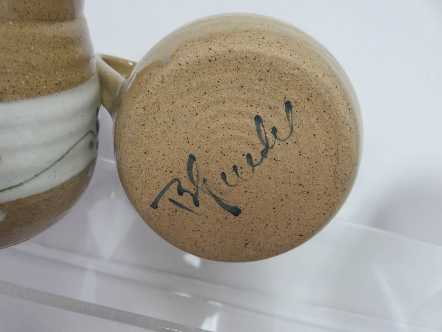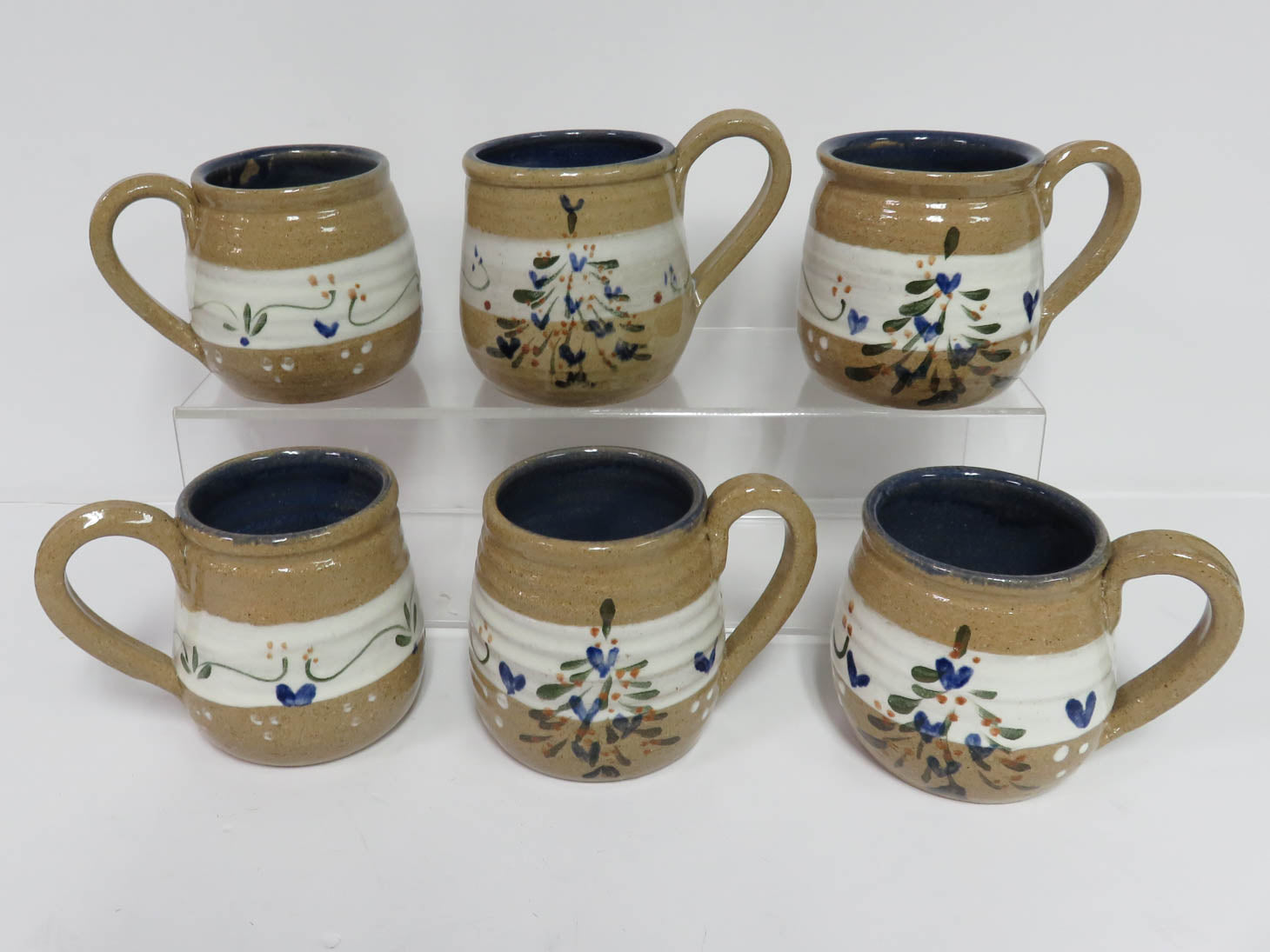 Set of 6 pottery mugs tan with white stripe and floral design, blue interior.
