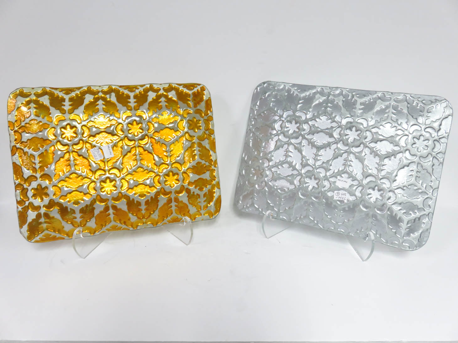 Set of Rectangular platters, one silver, one gold, rounded corners, filigree leaf design 12" x 9" x 1"