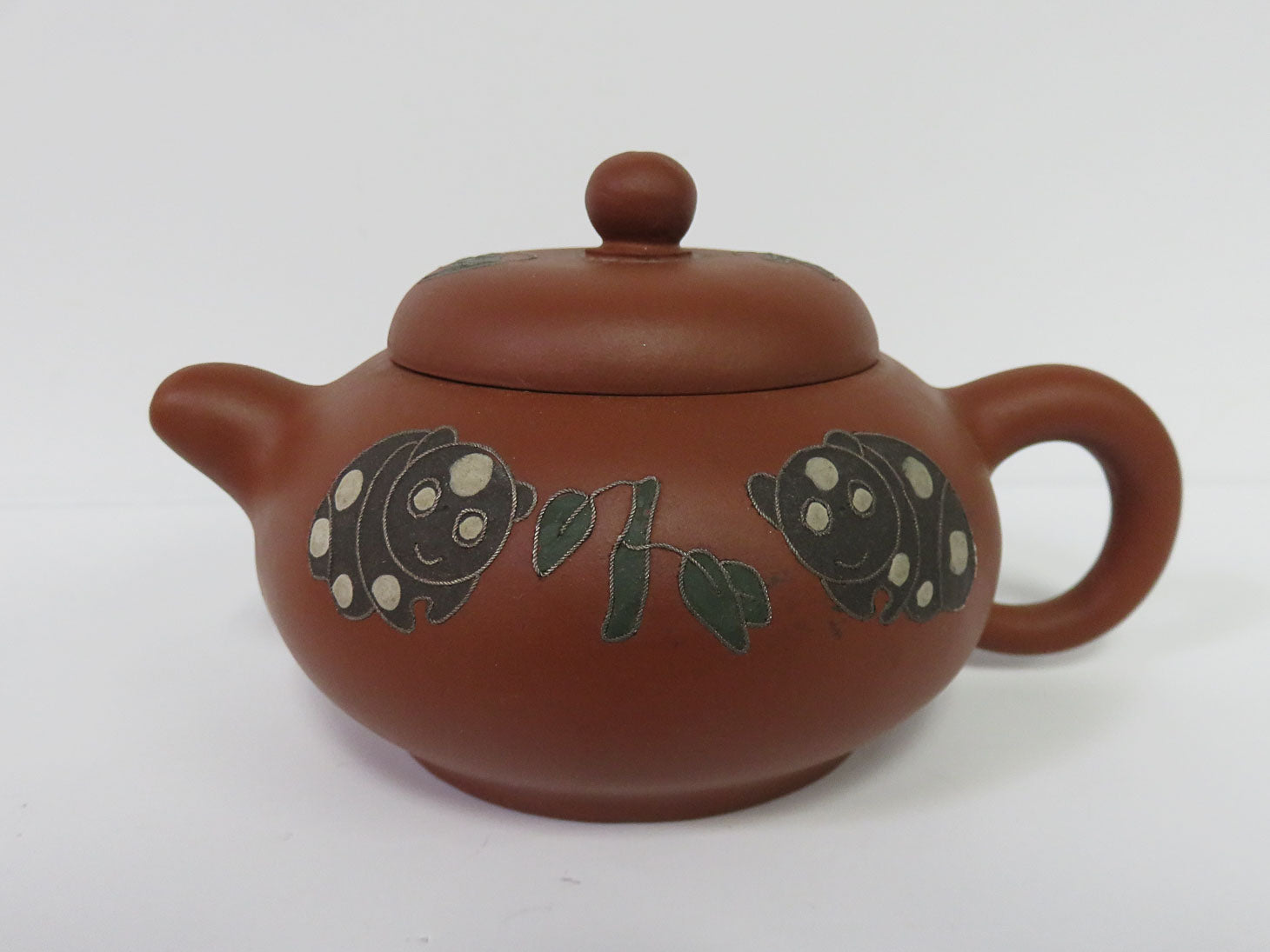 Clay teapot with 4 small teacups, whimsical etched panda design and bamboo leaves. 6 pcs