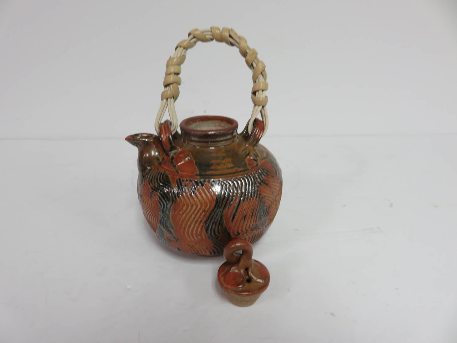 Iridescent orange glaze with textured finish and a ratan handle.