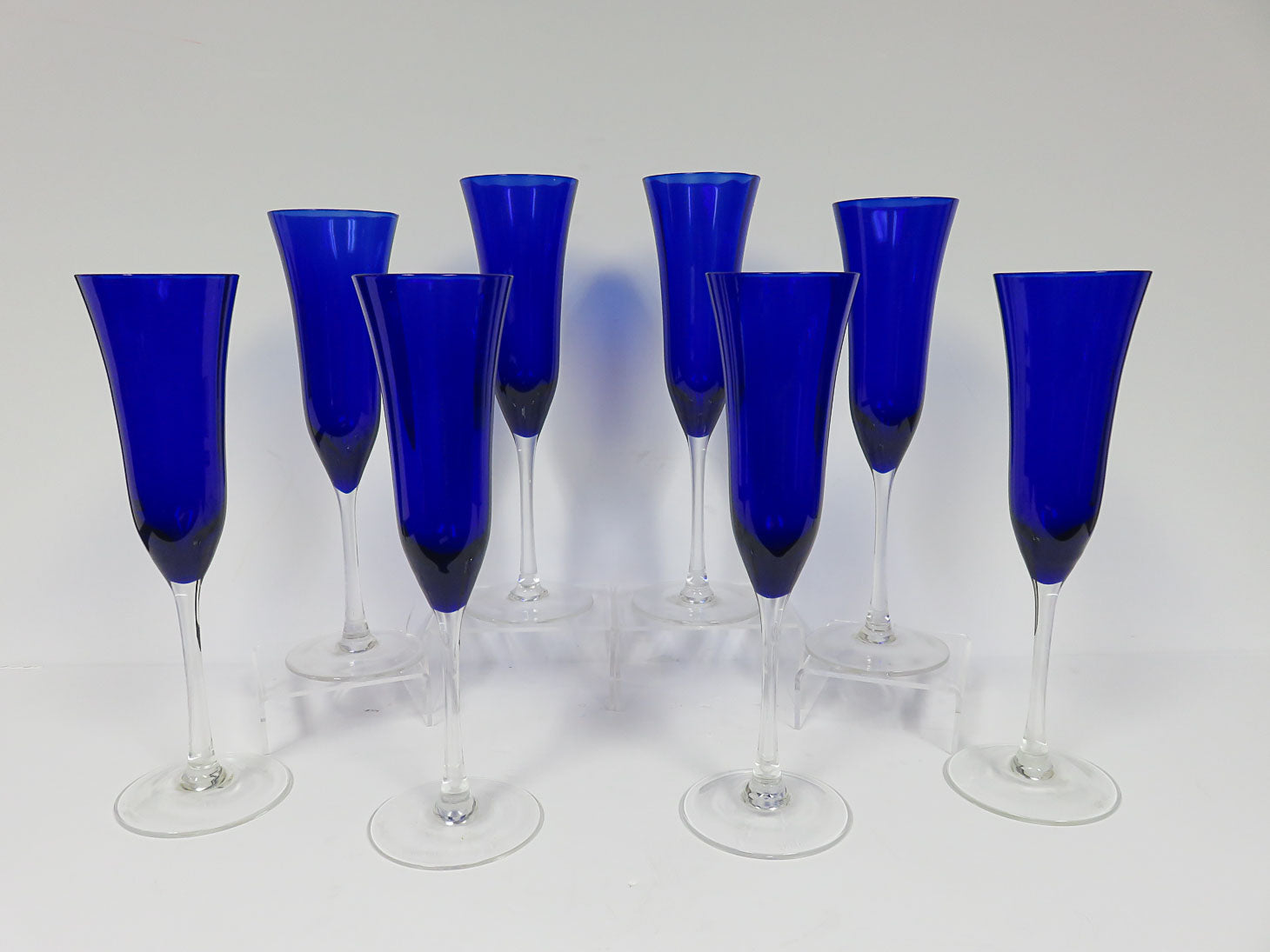 Set of 8, cobalt blue, flared, clear stem on round base 10"h