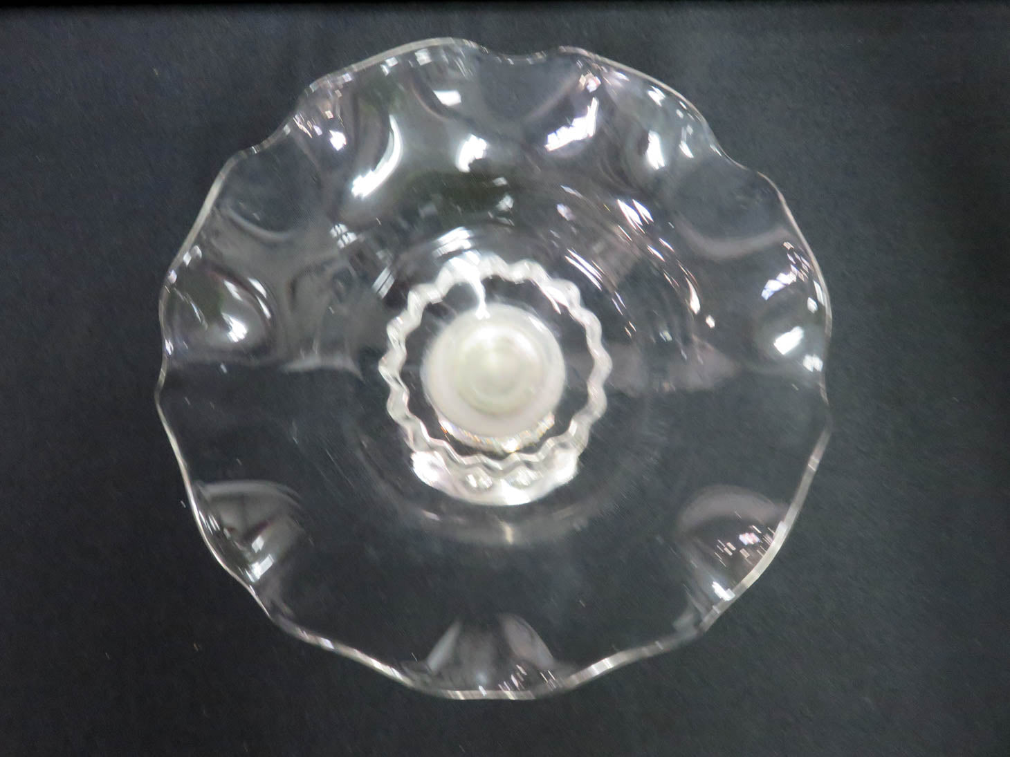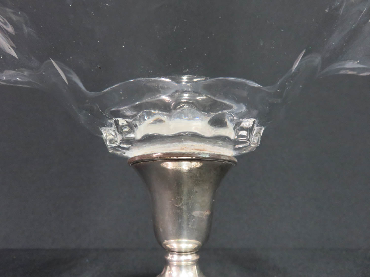 Glass ruffled bowl, weighted sterling base with small dent #201