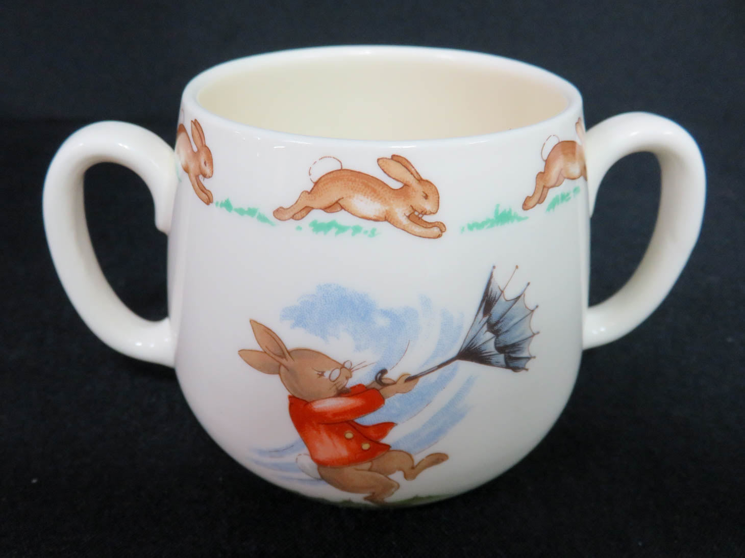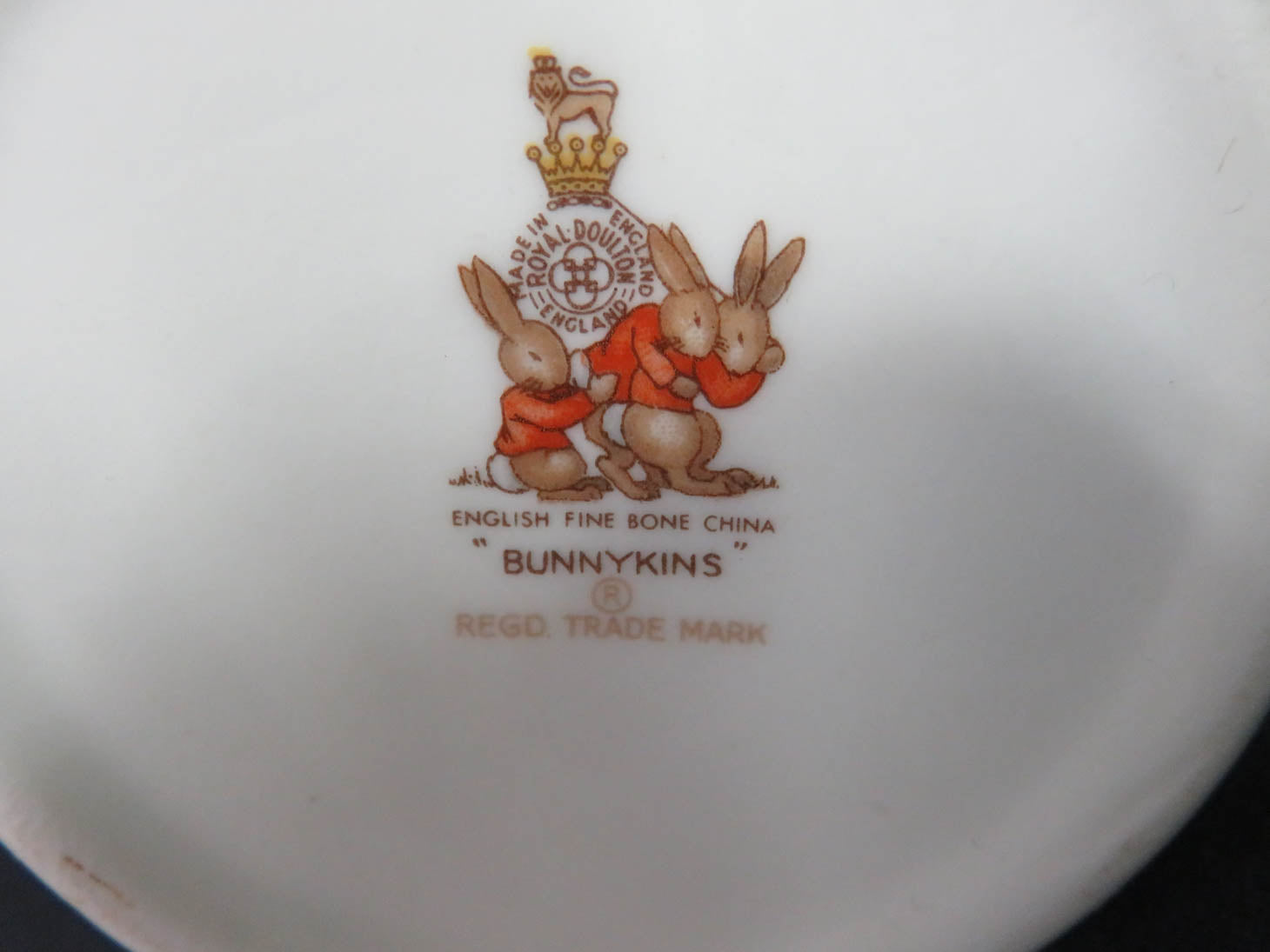 Item Number: 3552-117 2 pieces, "Bunnykins", cream with bunny family scene, bowl and cup. Slight scratches.