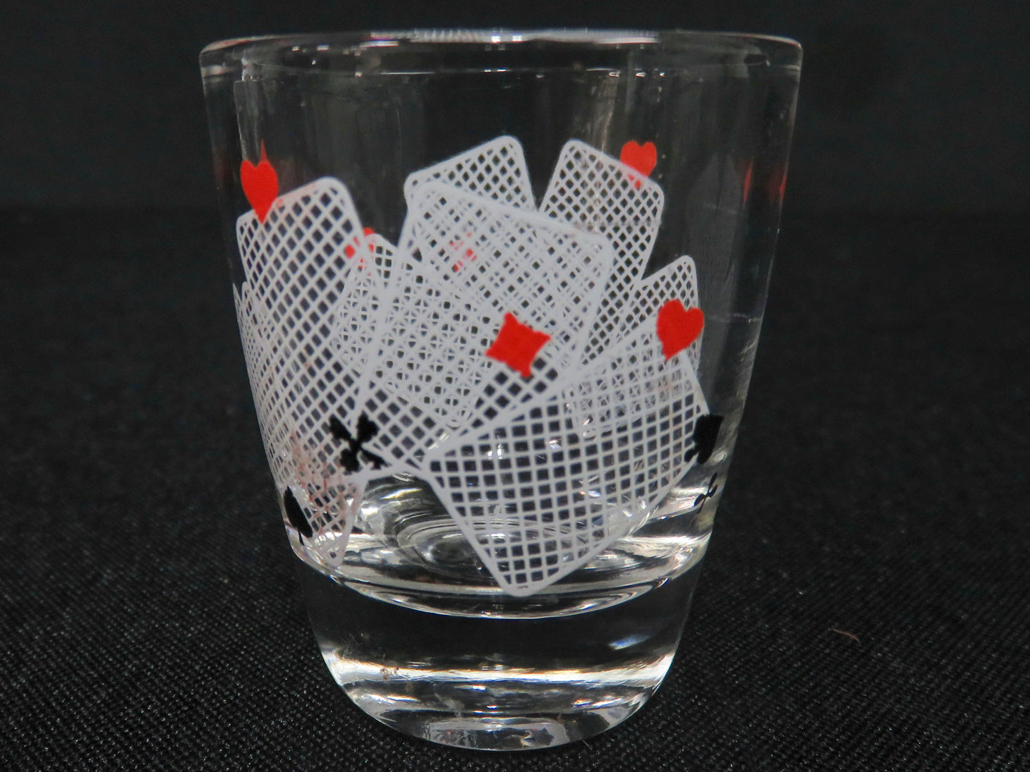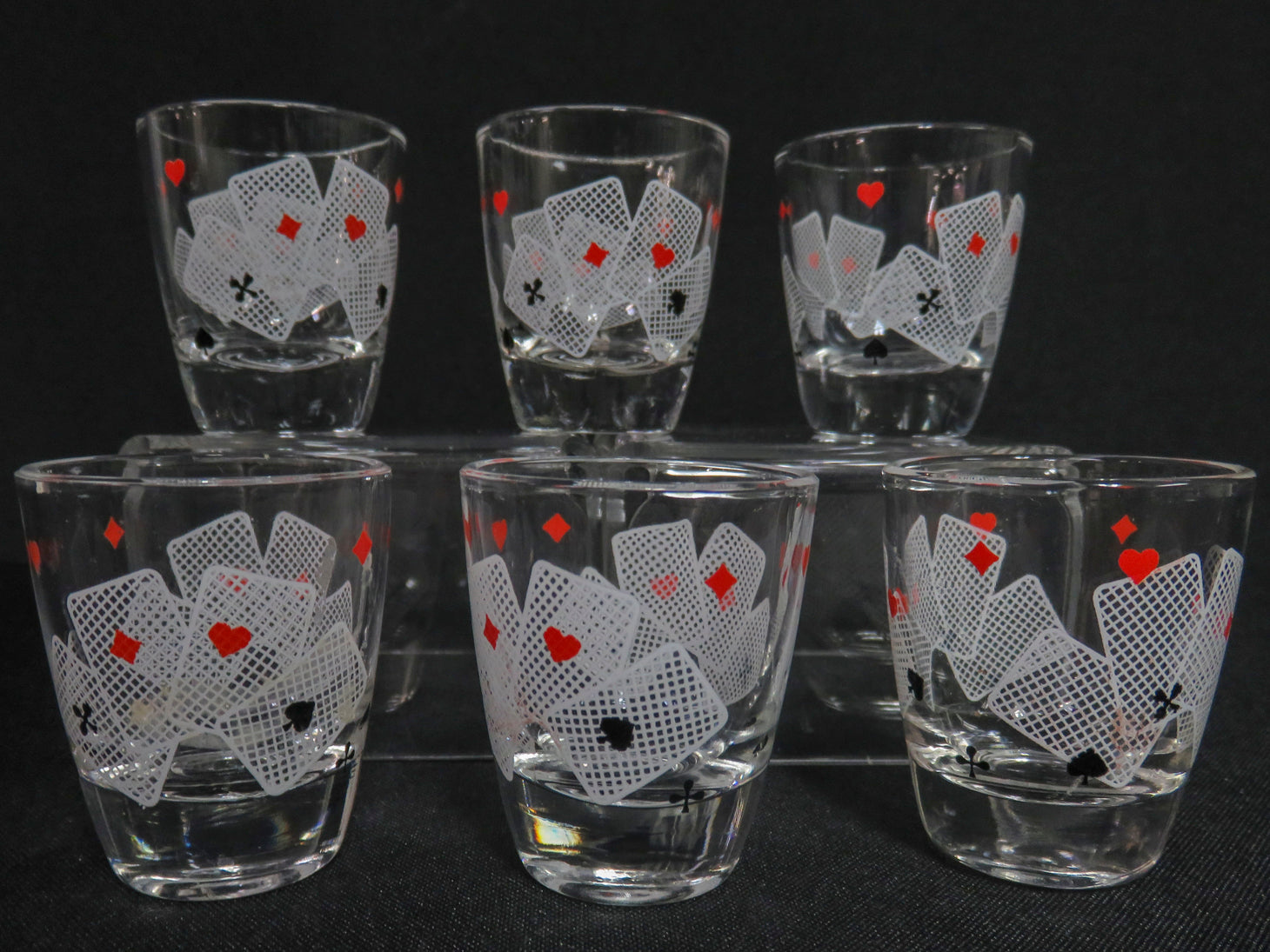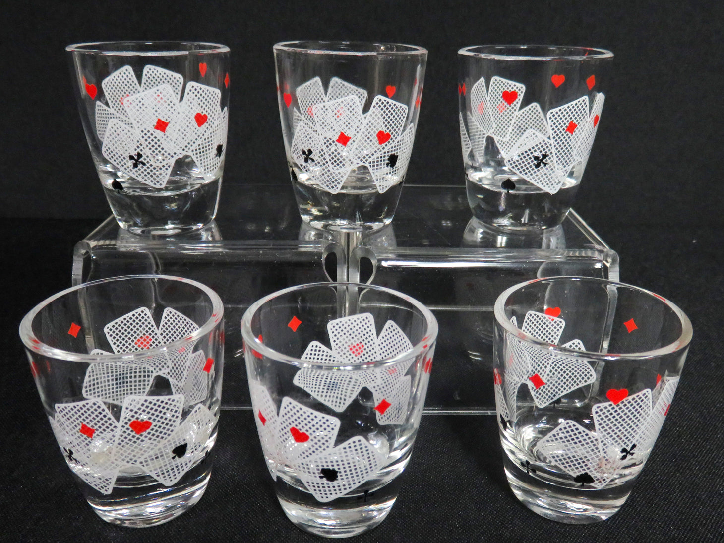 Item Number: 26191-32 Set of 6, playing cards motif, clear with red, black and white playing card suits. 2"H
