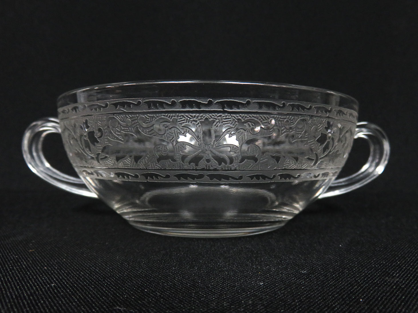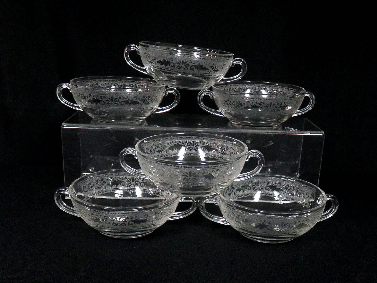 Set of 6, double handled, shallow bottom bowls, etched glass