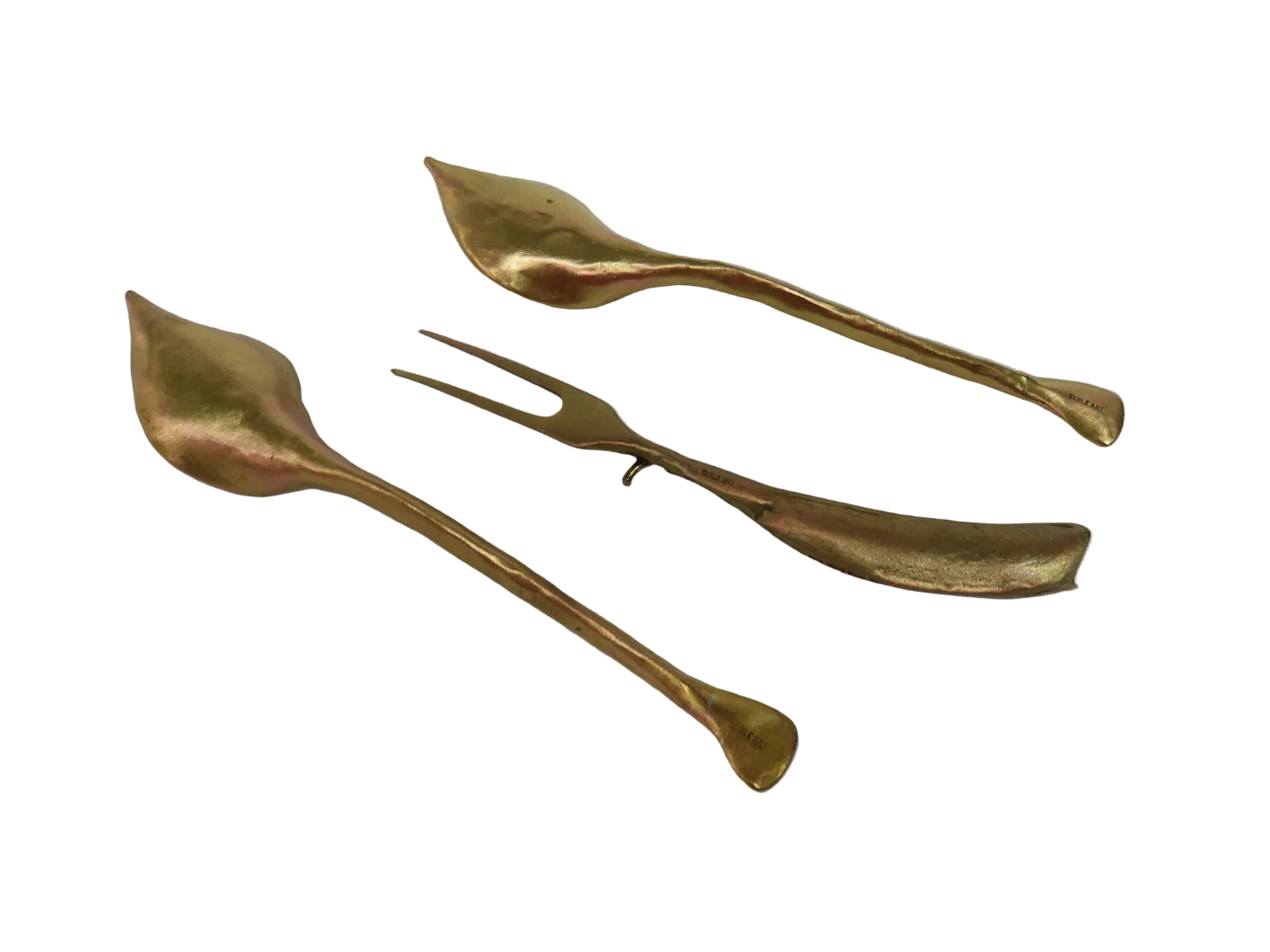 Set of 3, Michael Michaud designs. Pea pod fork & Hosta spoons. Rustic gold finish.