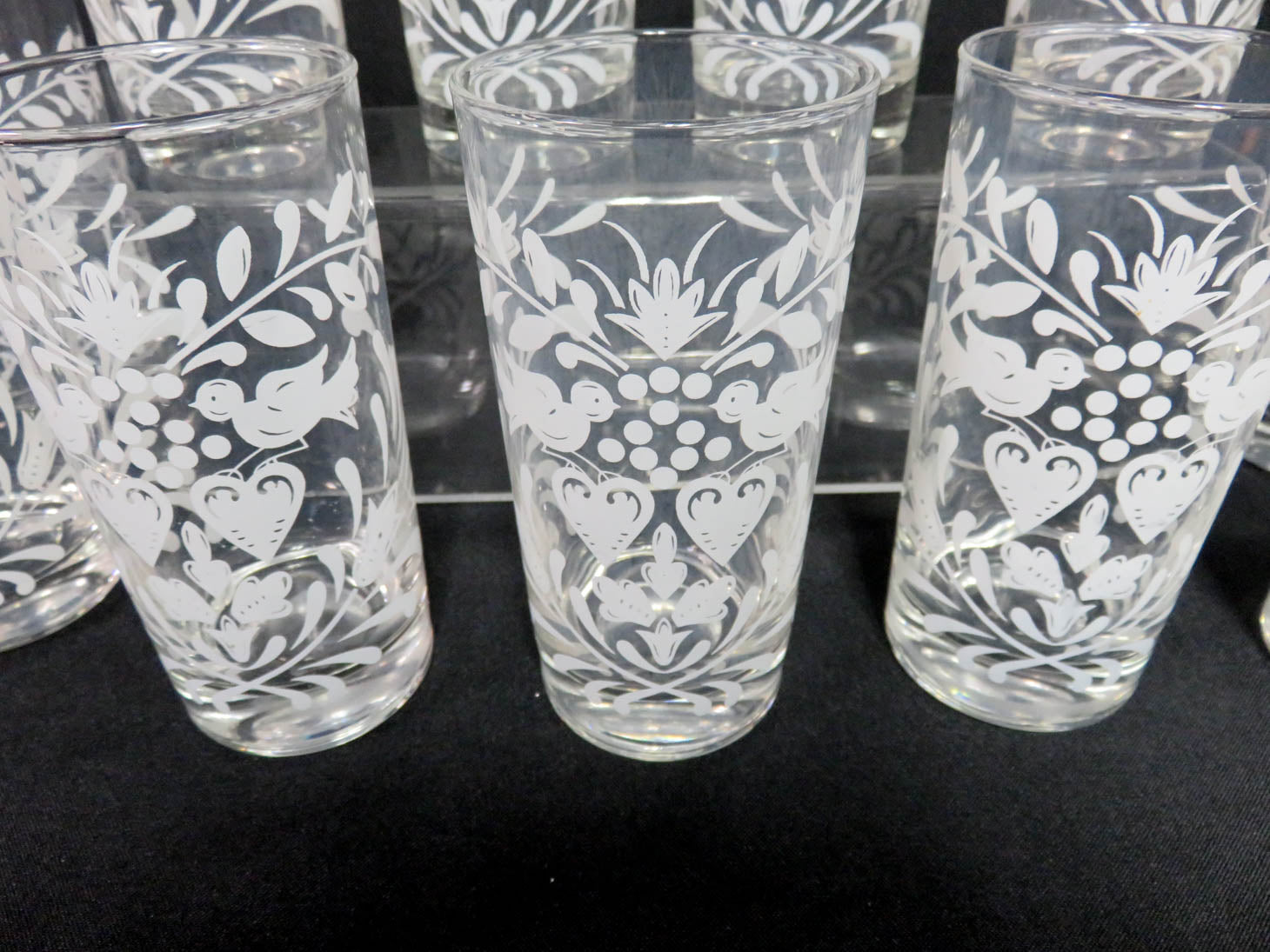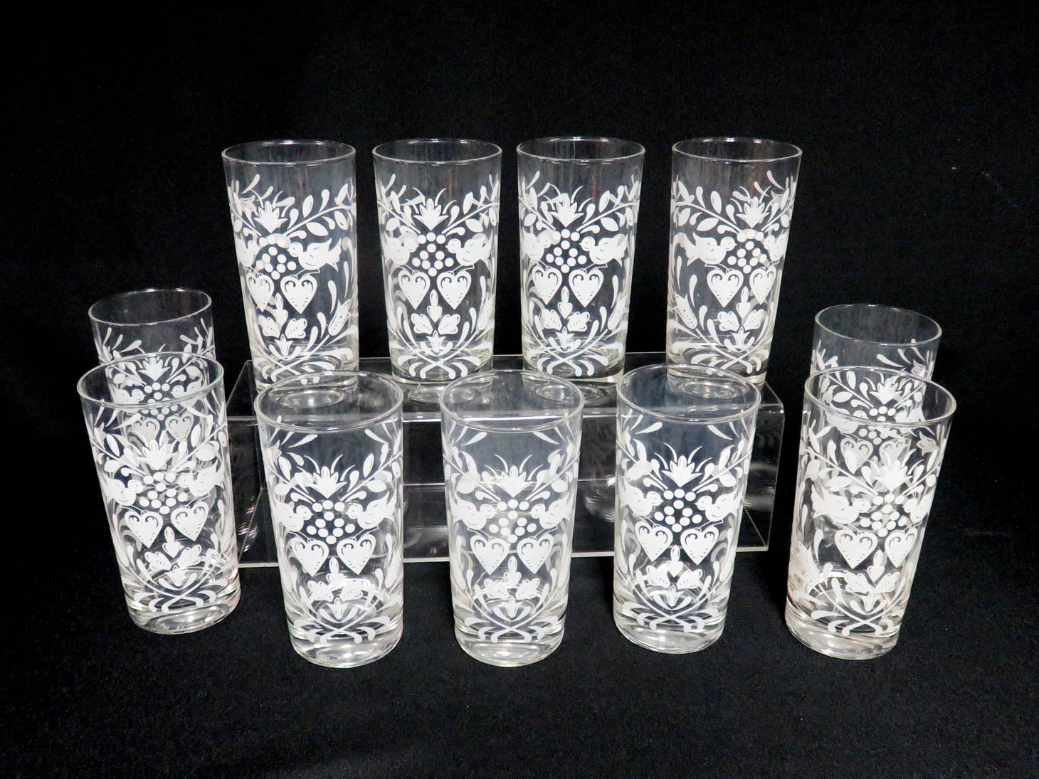 Set of 11, " Hearts and Flowers" pattern. Clear glass with white design