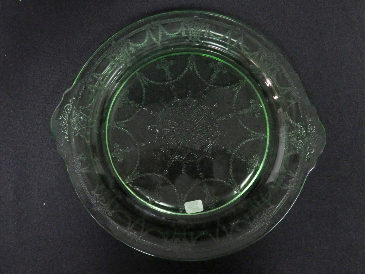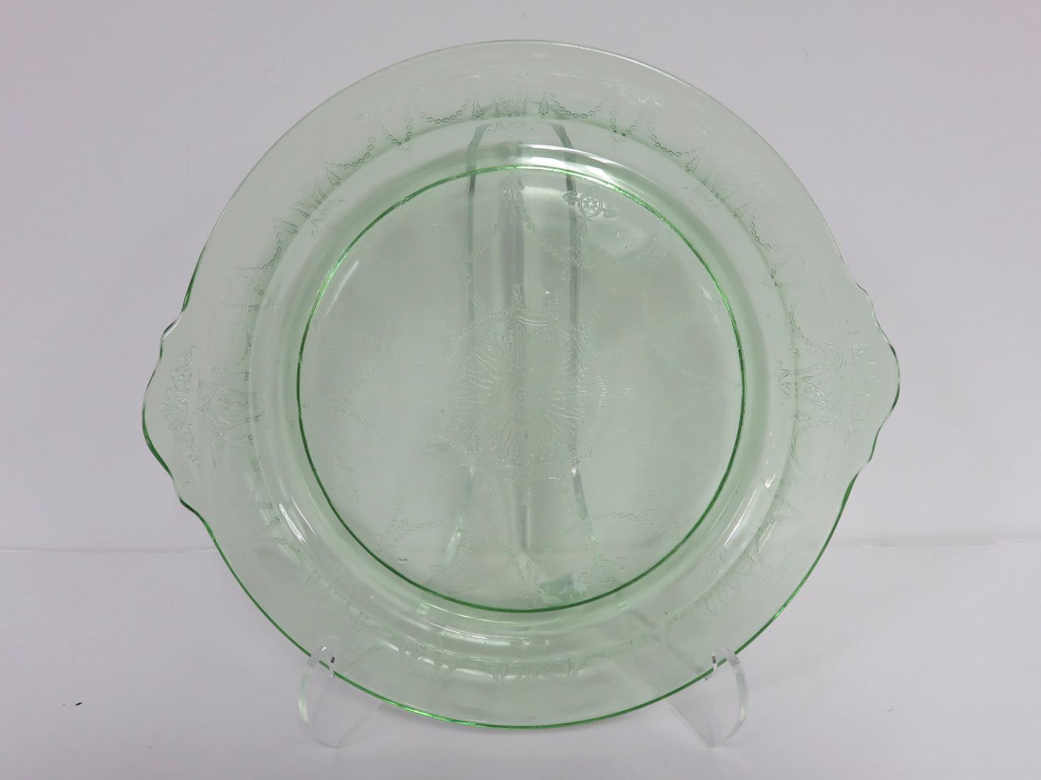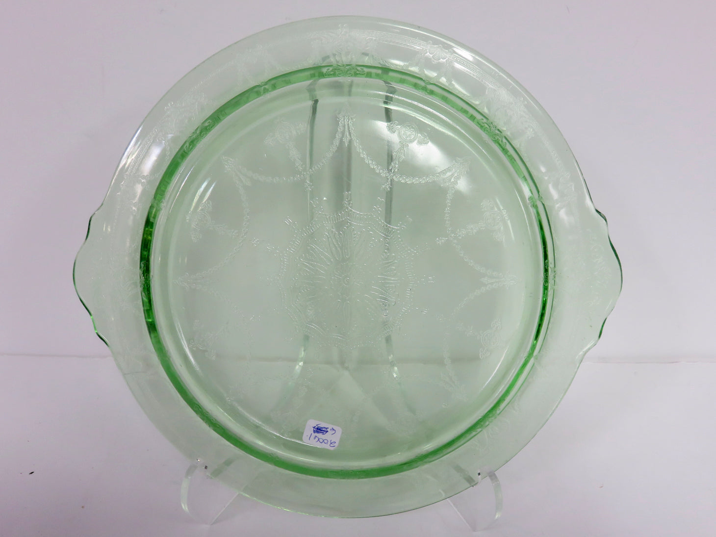 "Ballerina Cameo" pattern. Round with green hue and handles. Detailed etched design.