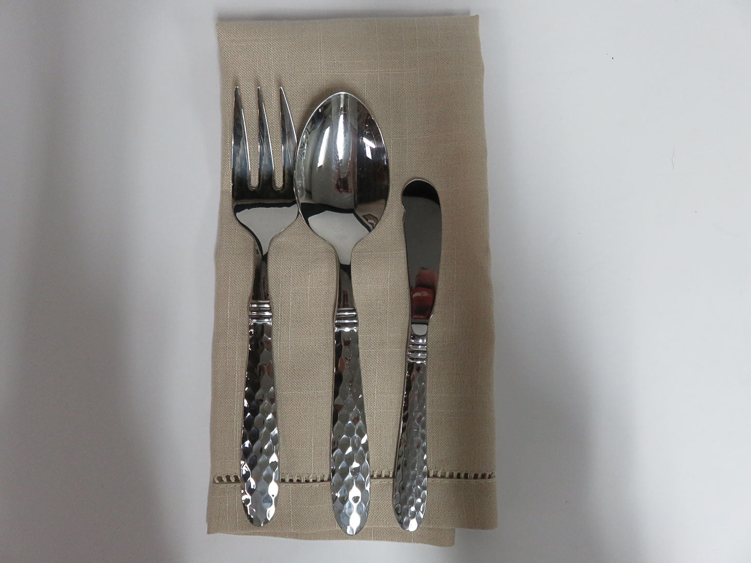 8-5 piece place settings plus 3 serving pieces. Hand forged hammered detail.