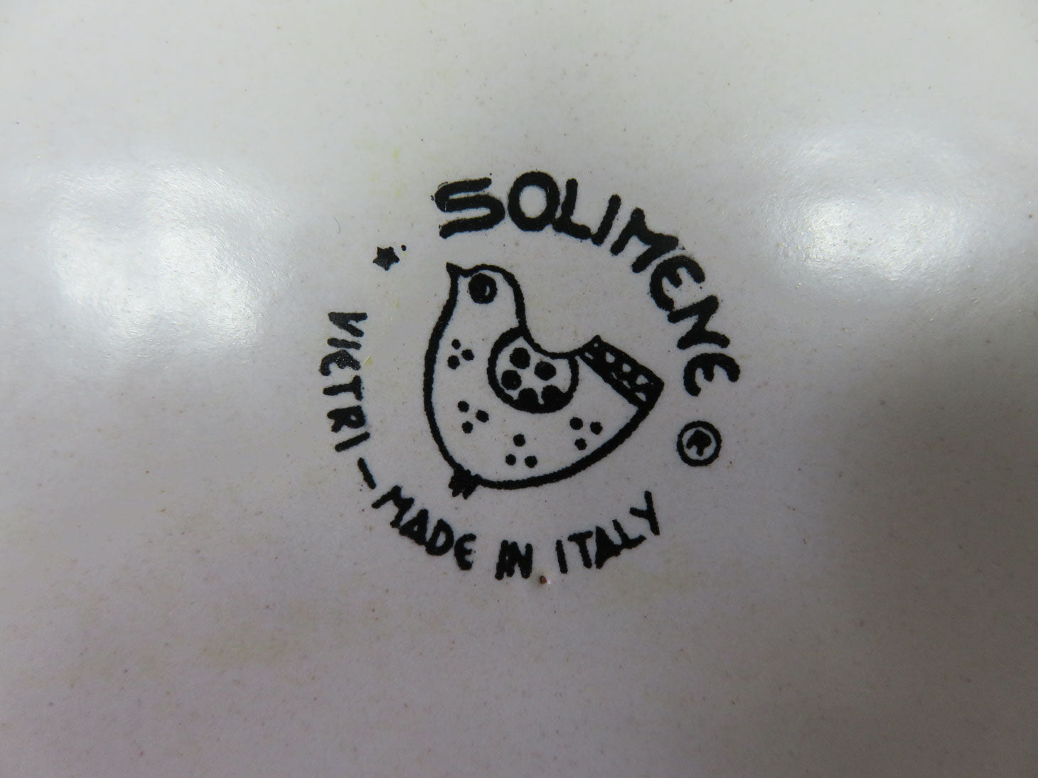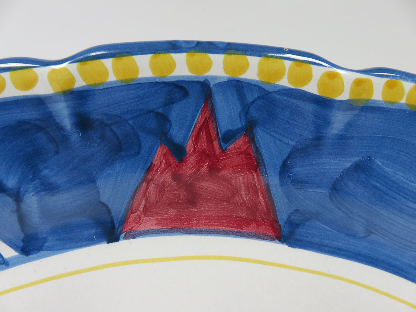 Item Number: 28290-4 White, blue scalloped rim with white horses and red mountains. Solimene. 16.5" x 14.5"