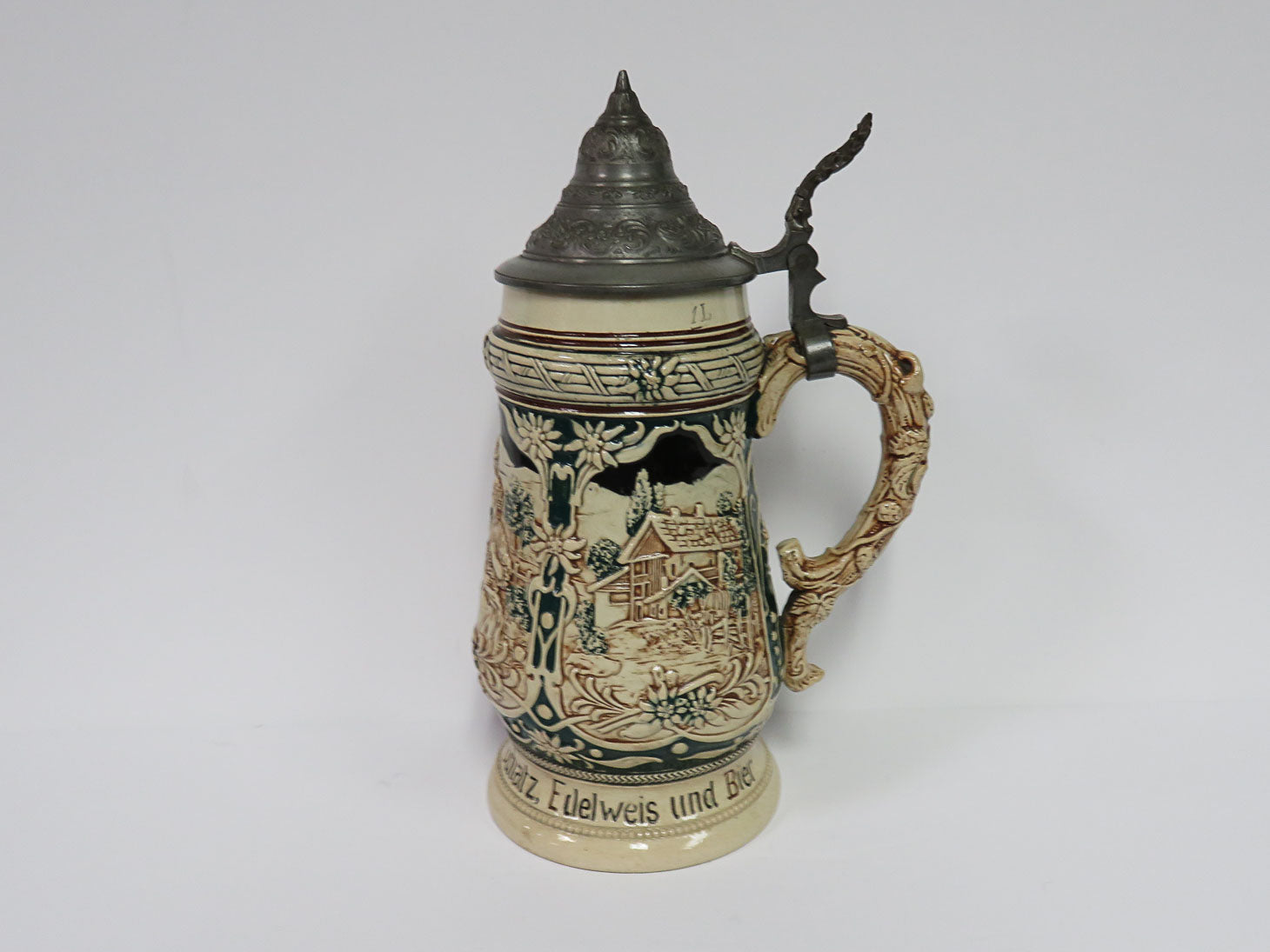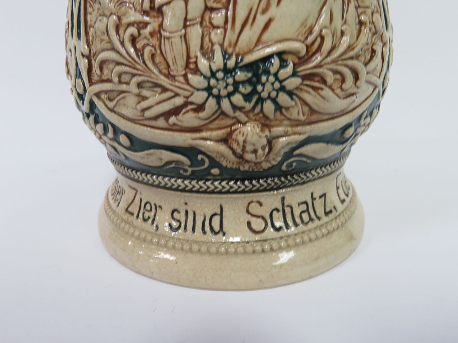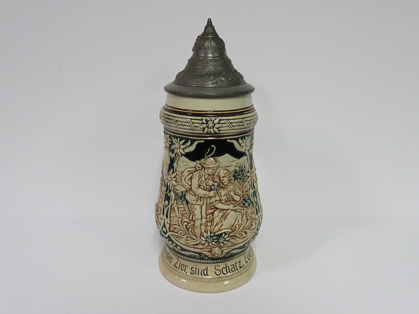 "The Wedding Stein" raised relief pastoral scene with ornate pewter lid, 1 Liter