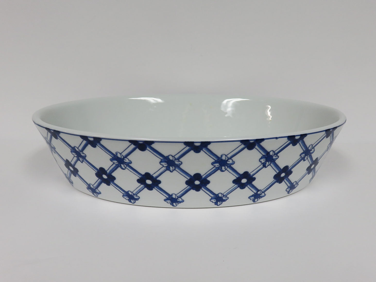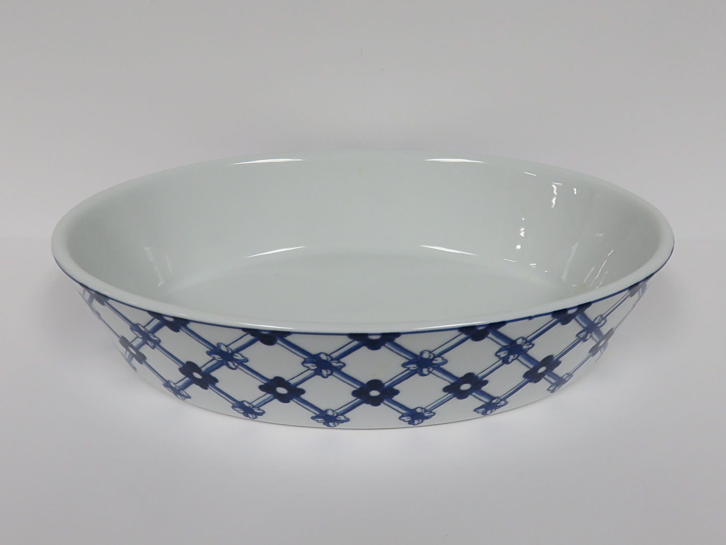 Oval, blue lattice design with floral medallions.