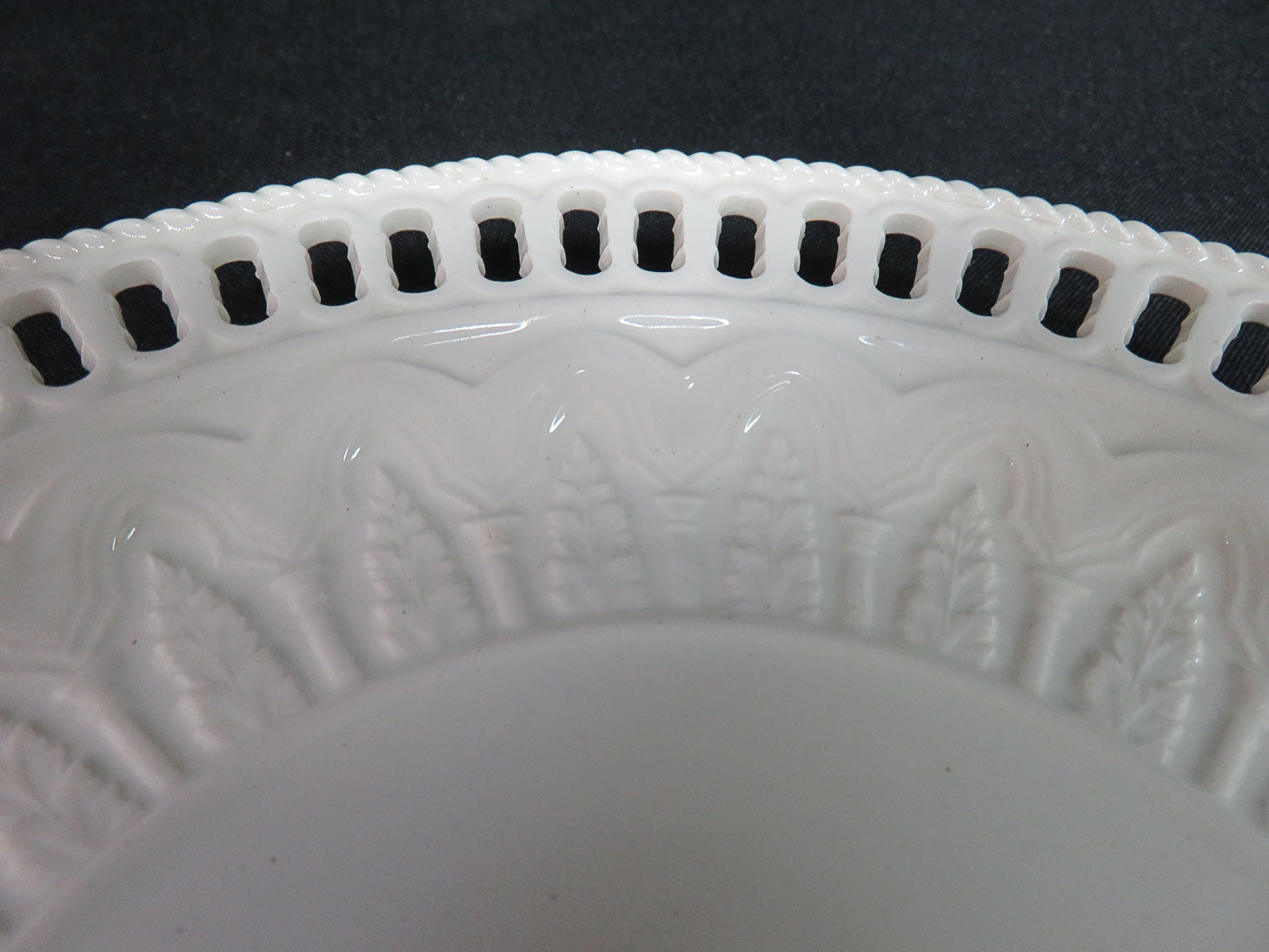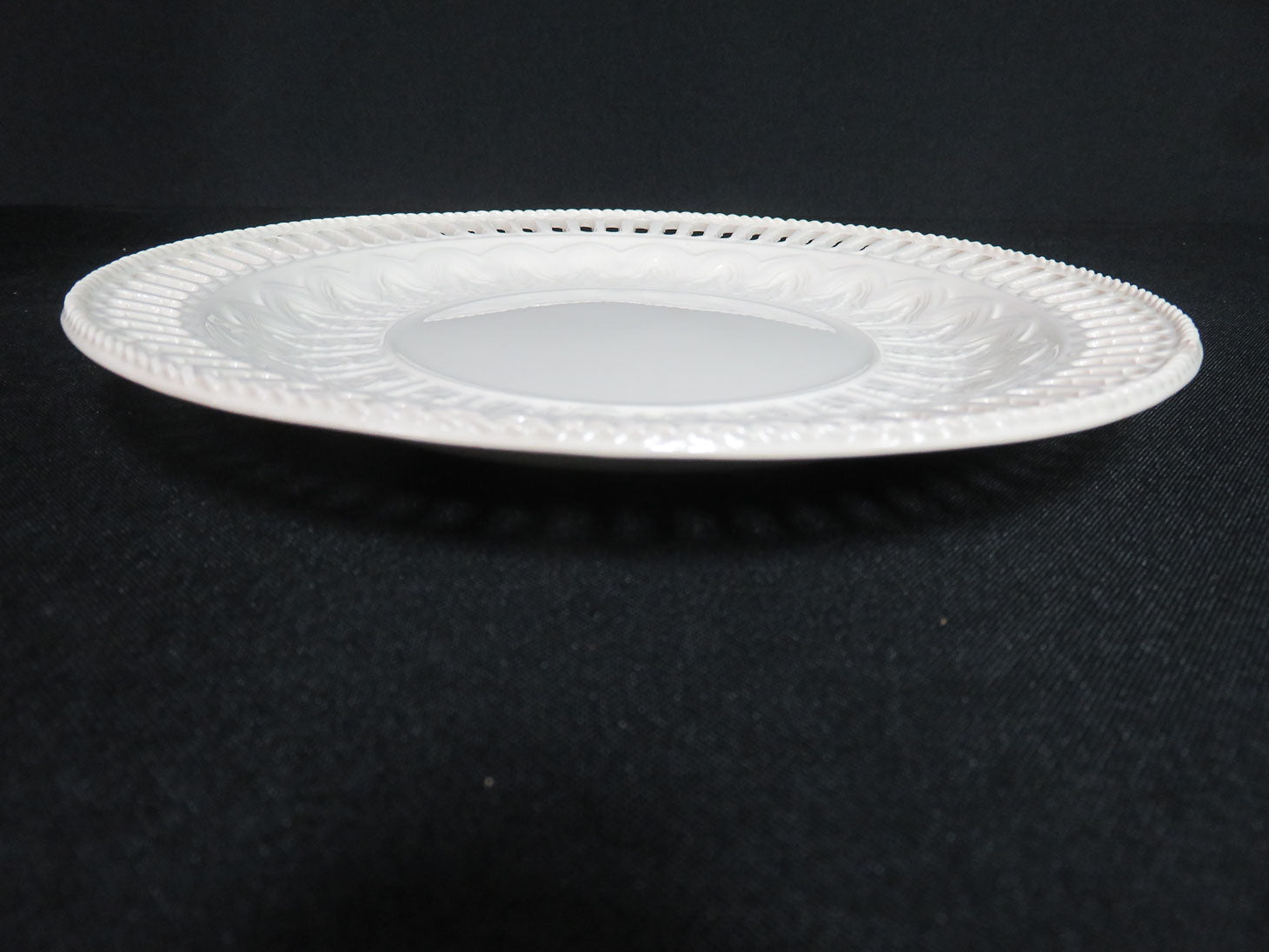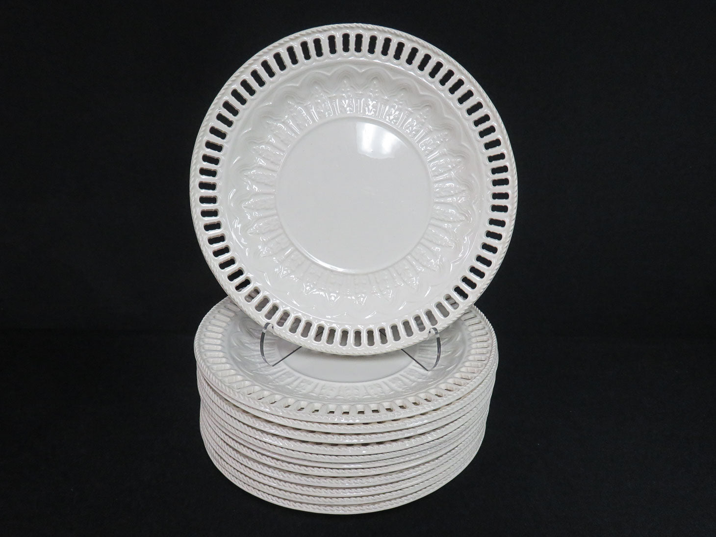 Set of 12, Ivory, reticulated pattern with delicate rope edge, one plate has a small chip on rim.