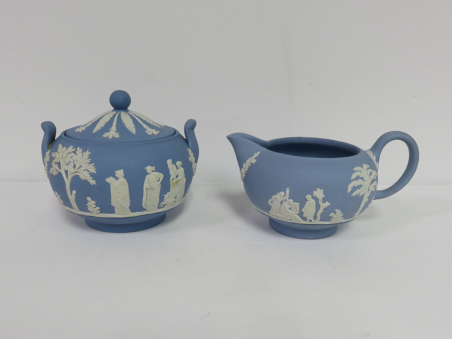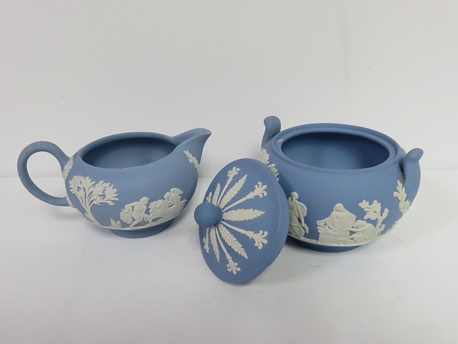 Item Number: 1268-51 Blue with embossed white, round, lidded sugar, open creamer, 3 pc Sugar: 4.25" x 4", Creamer: 2.5" H
