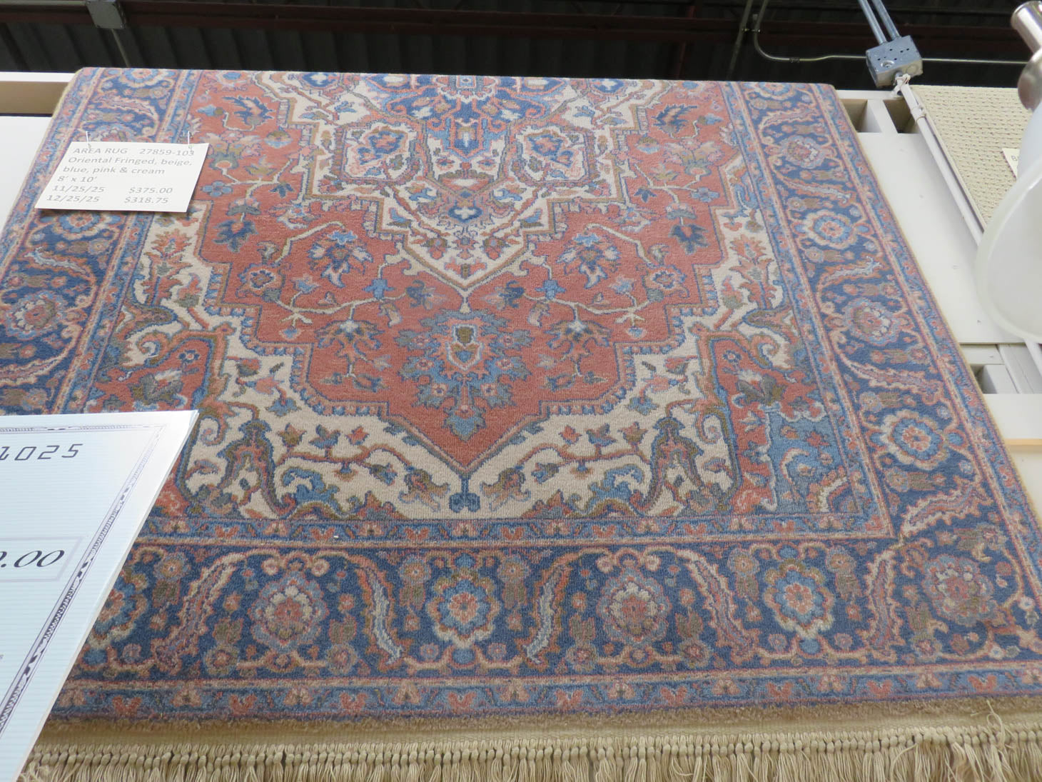 Item Number: 27859-103 "Antique Serapi" pattern. Design #744. Rectangular blue, pink & tan with center medallion and fringe. 5'9" x 9'