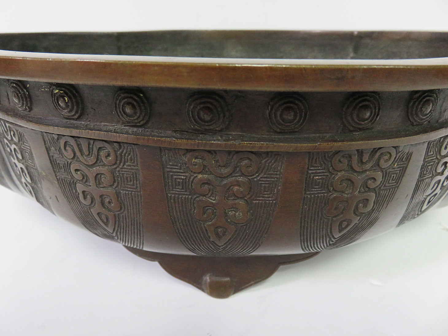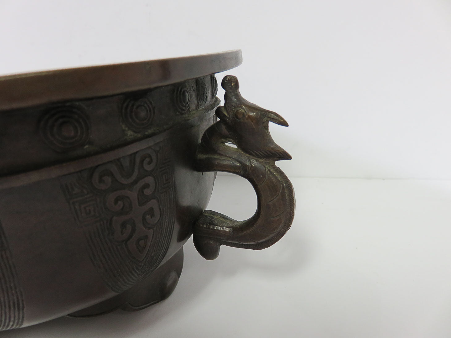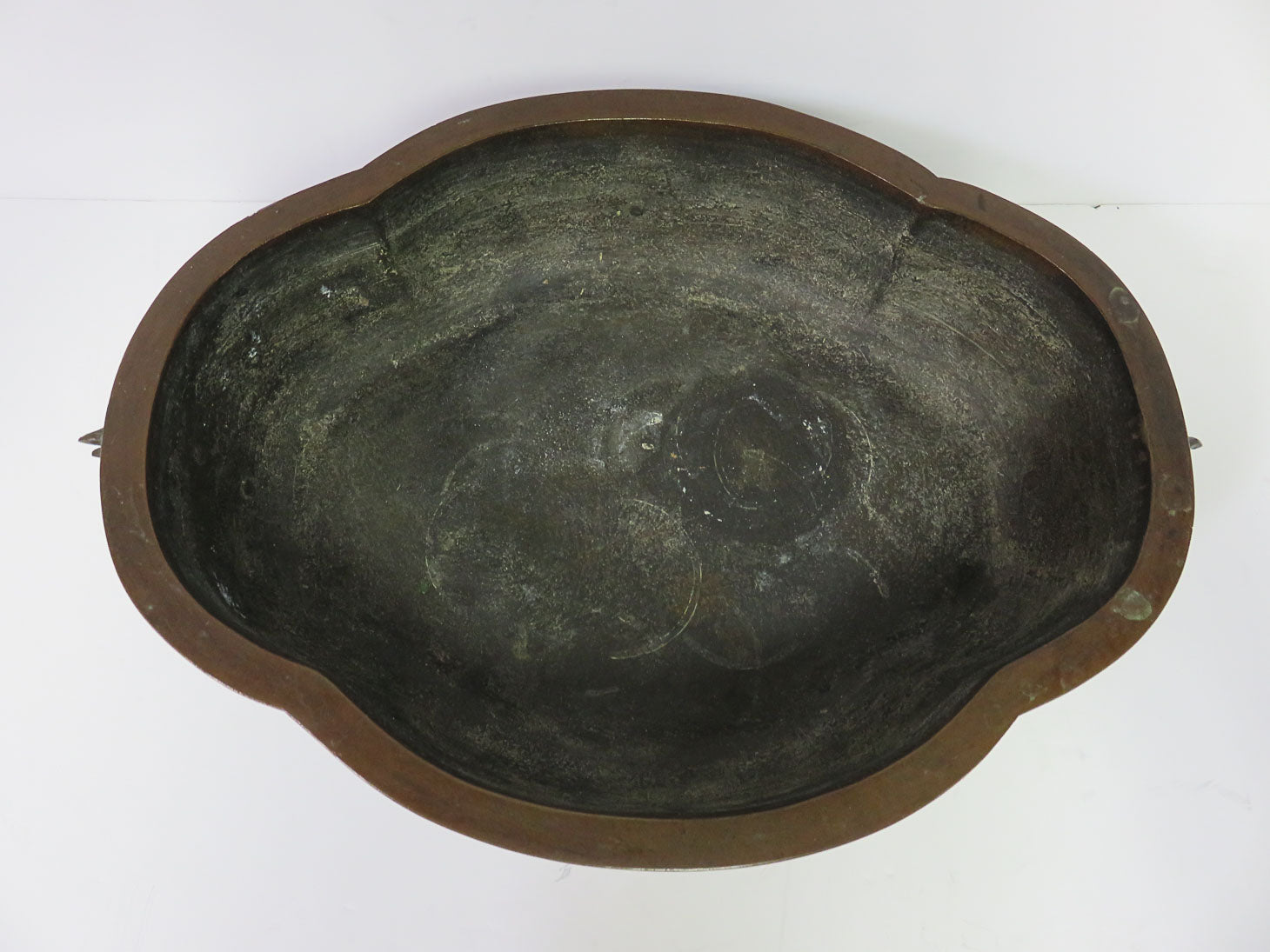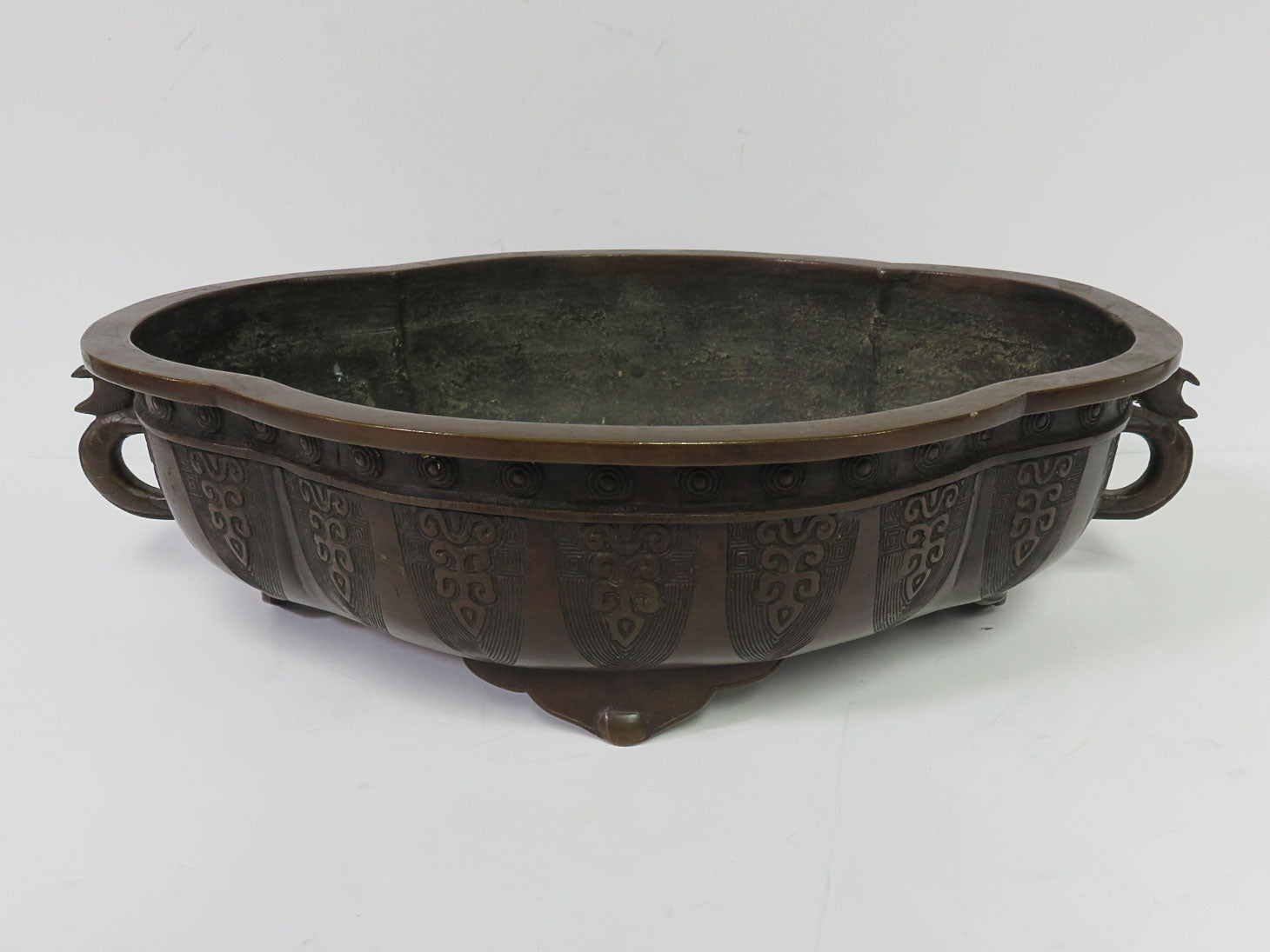 Dragon handles, footed, scalloped oval shape, Asian design, brown