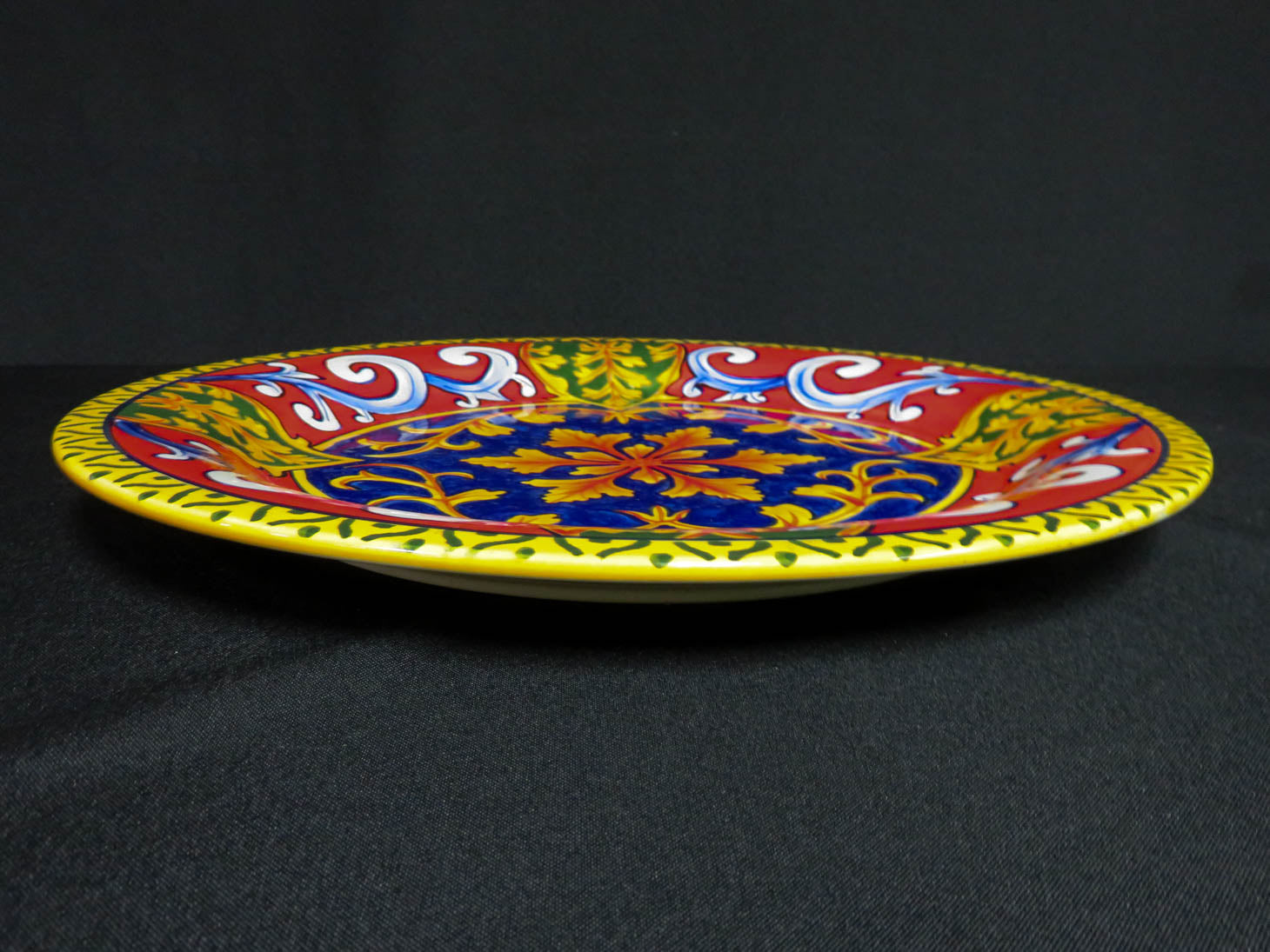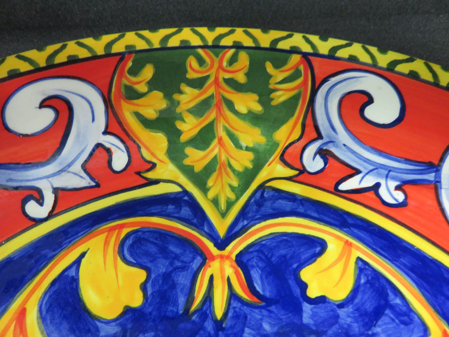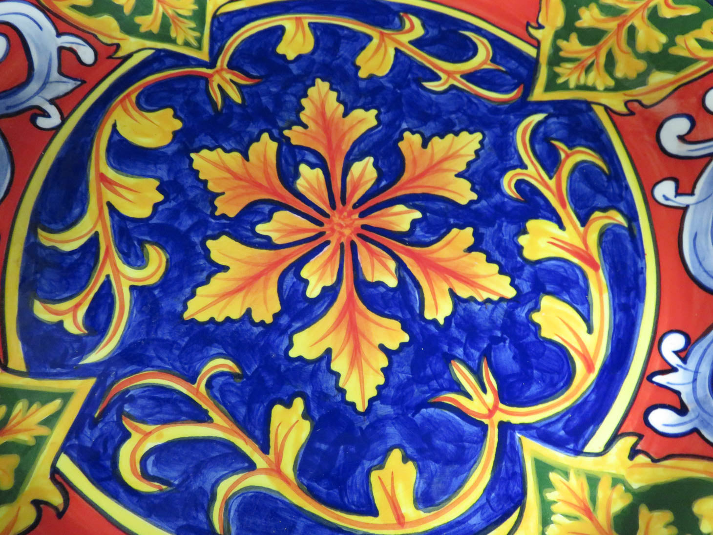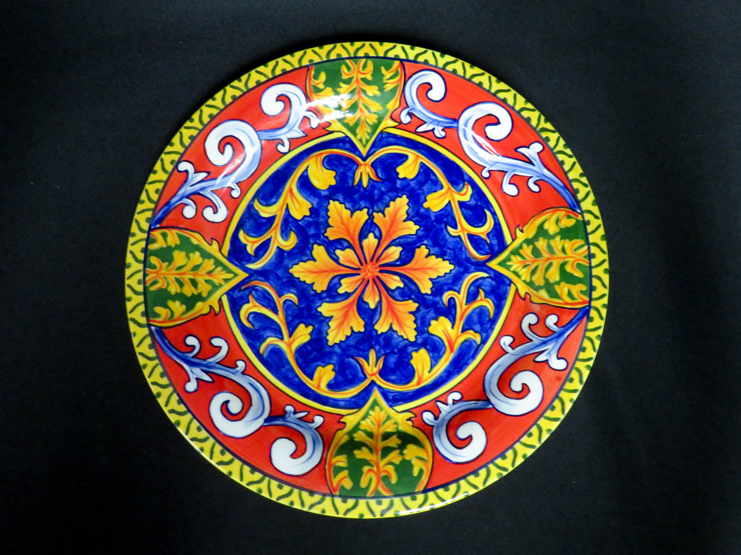 Vibrant blue center with orange and red leaves, yellow and green border, food grade safe
