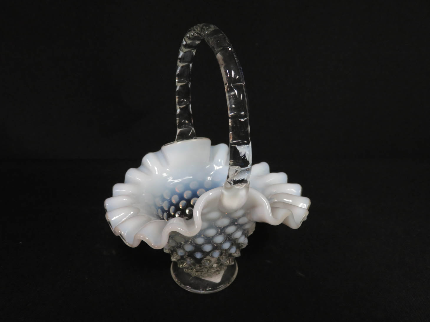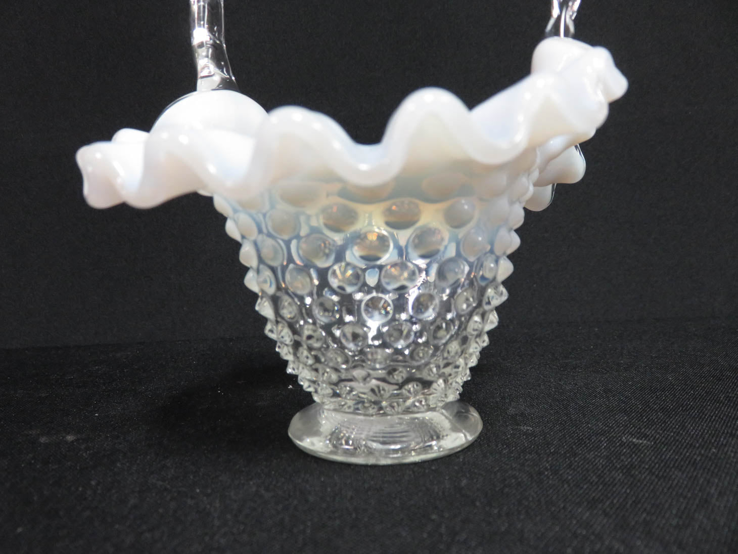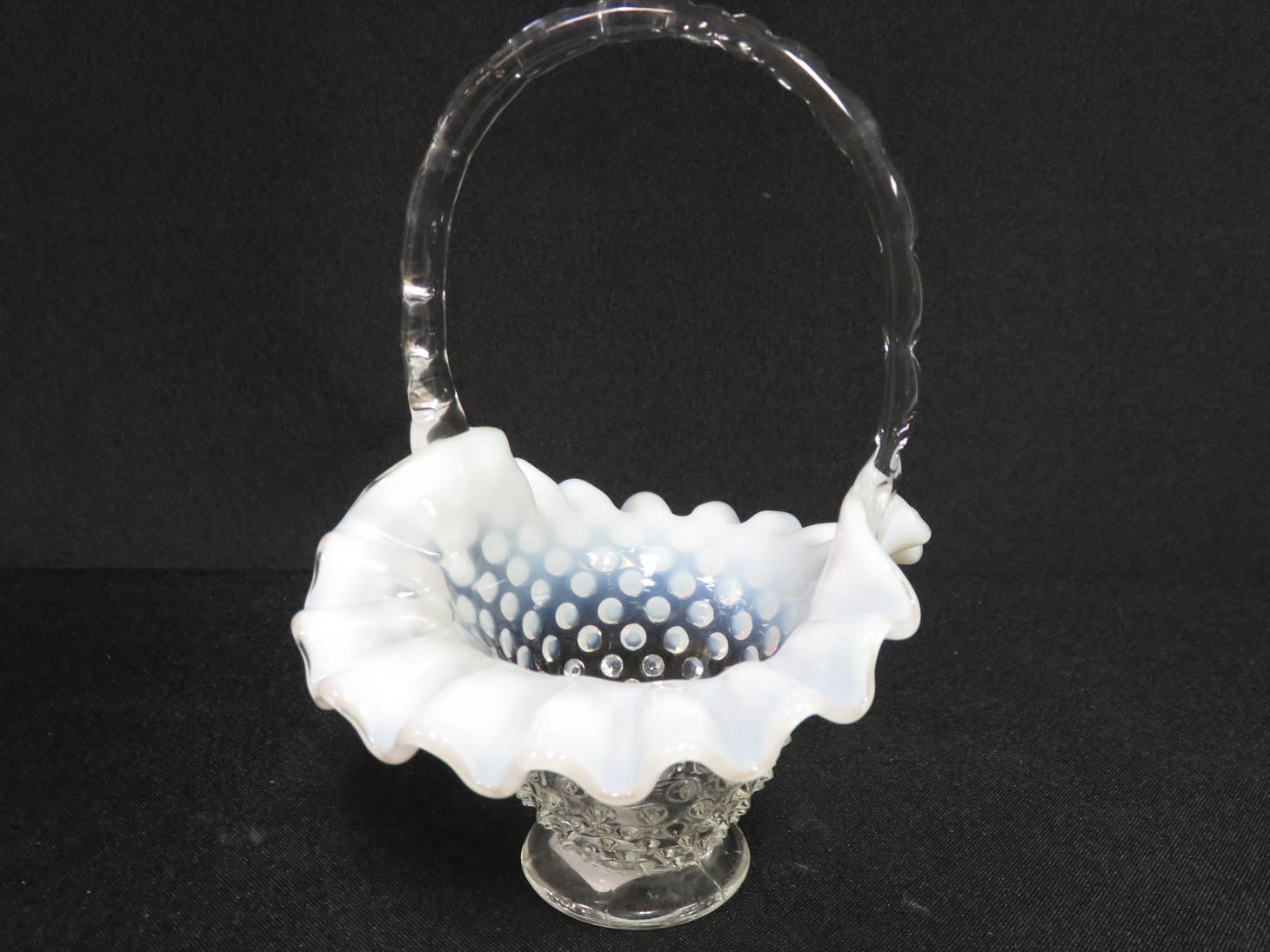 Ombre hob nail, white and clear, ruffled rim, notched handle