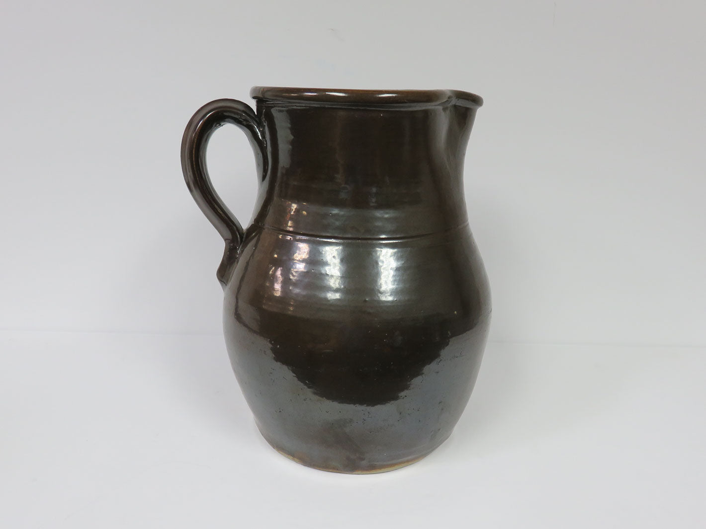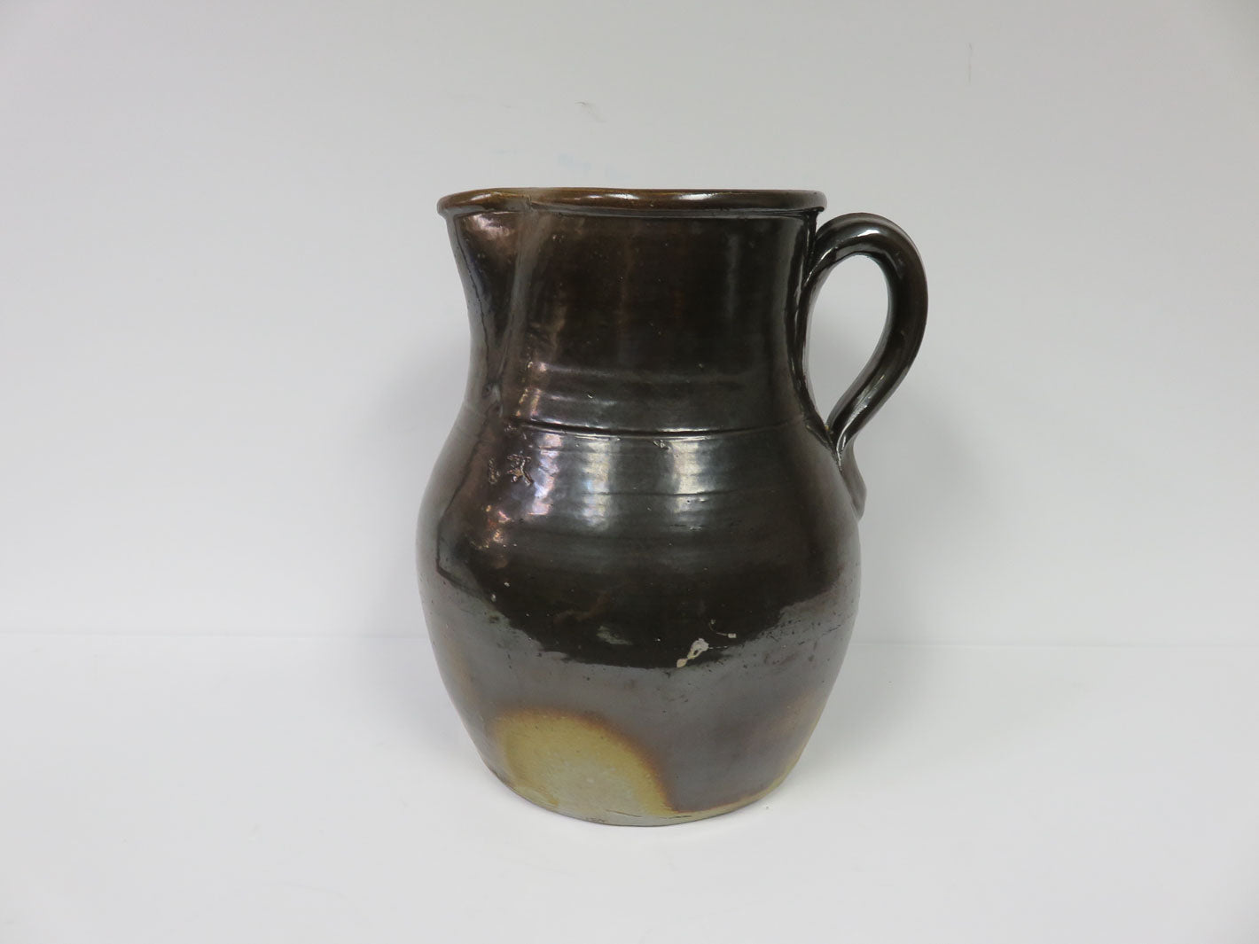 Large hand made in NY 1800's. Ombre brown glaze with applied handle. Chip at base.