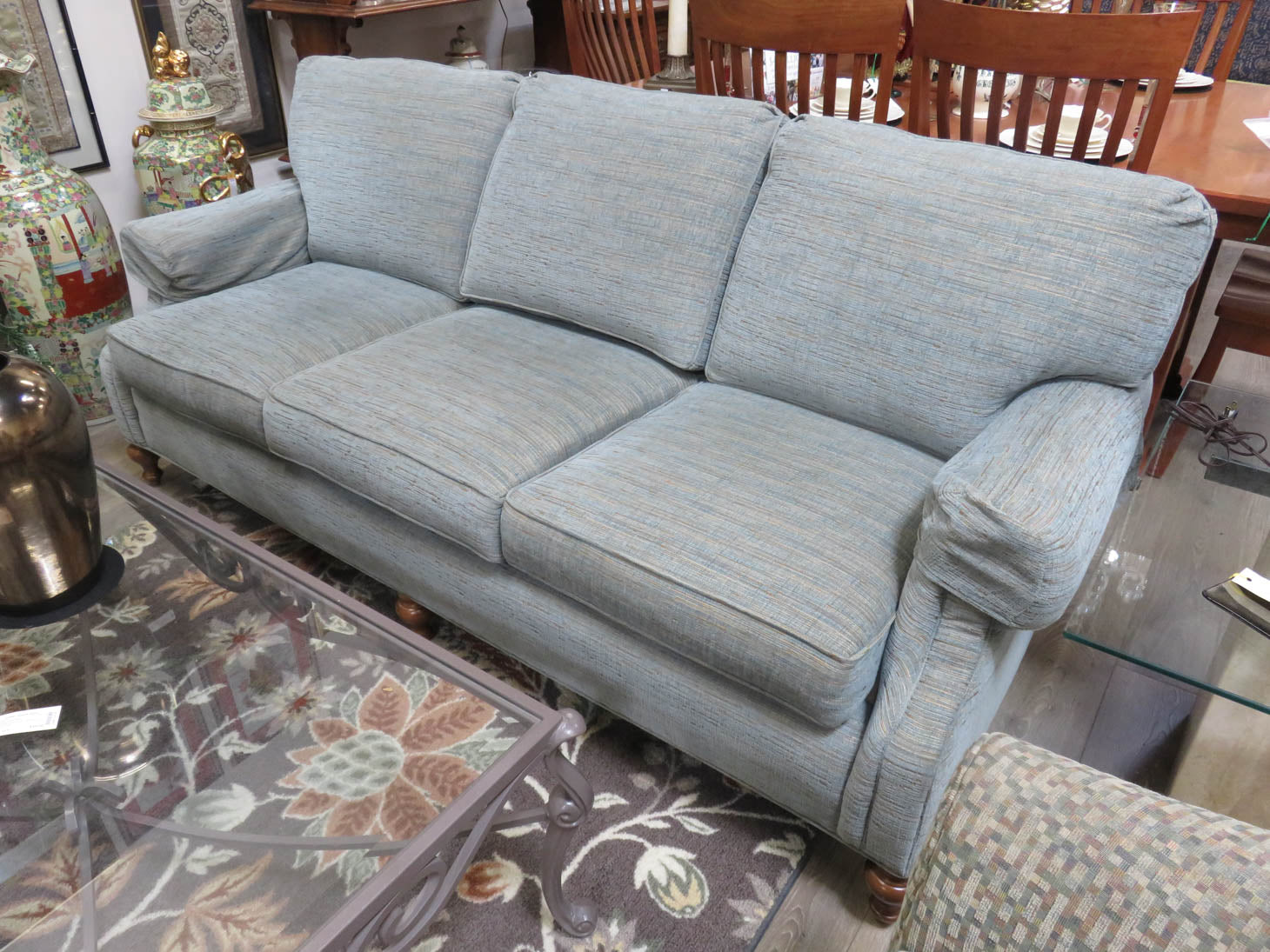 Item Number: 29692-1 Blue & gold tweed with rolled arms, structured with wooden feet. 3 seat & 3 back cushions. Includes arm covers. Crafted for Toms Price. 80" x 36" x 35"