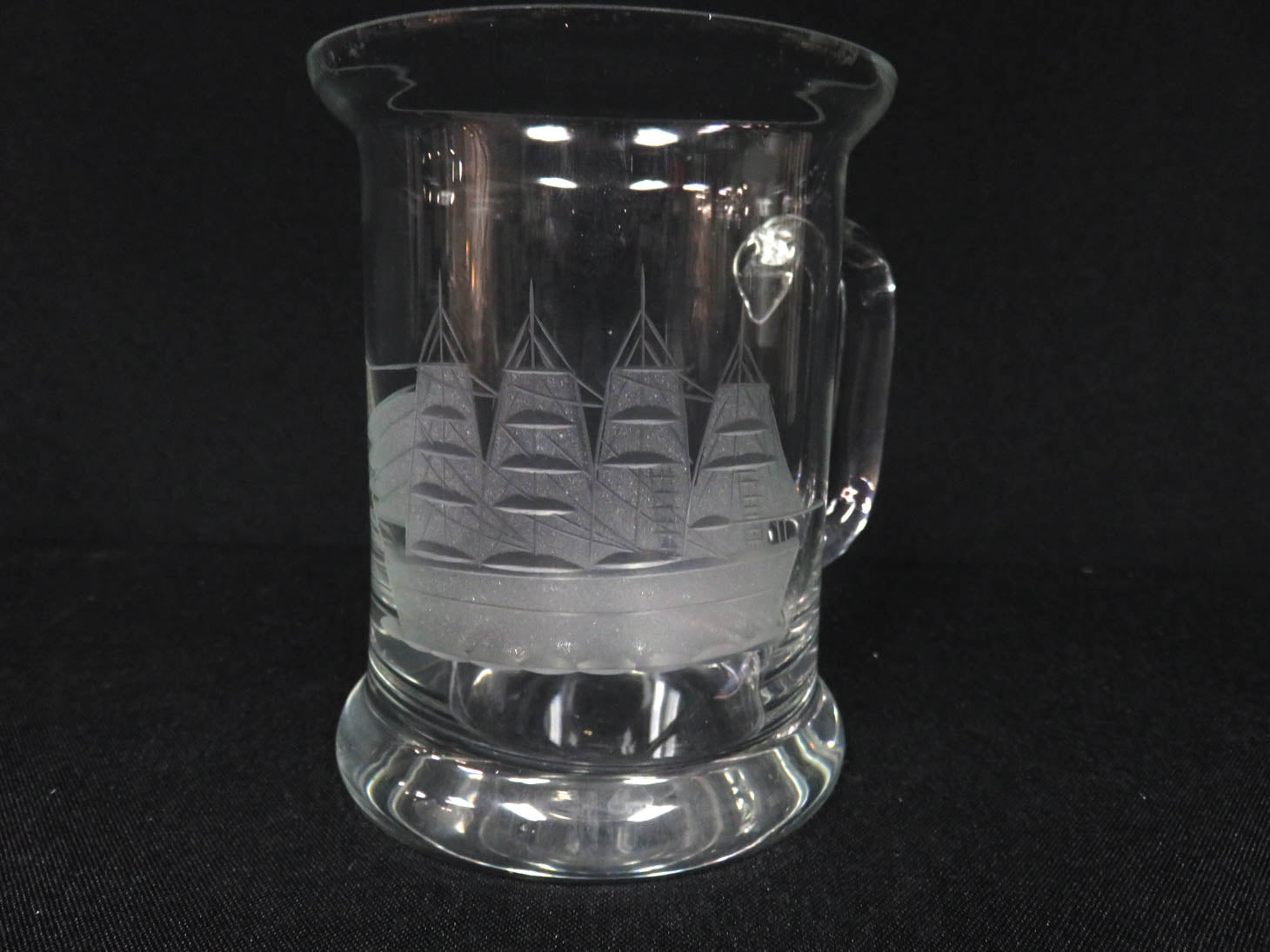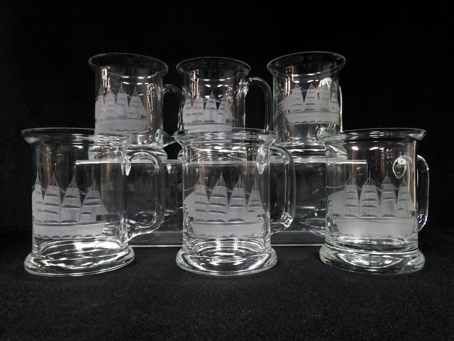Set of 6, clear with etched schooner, handled, flared rim