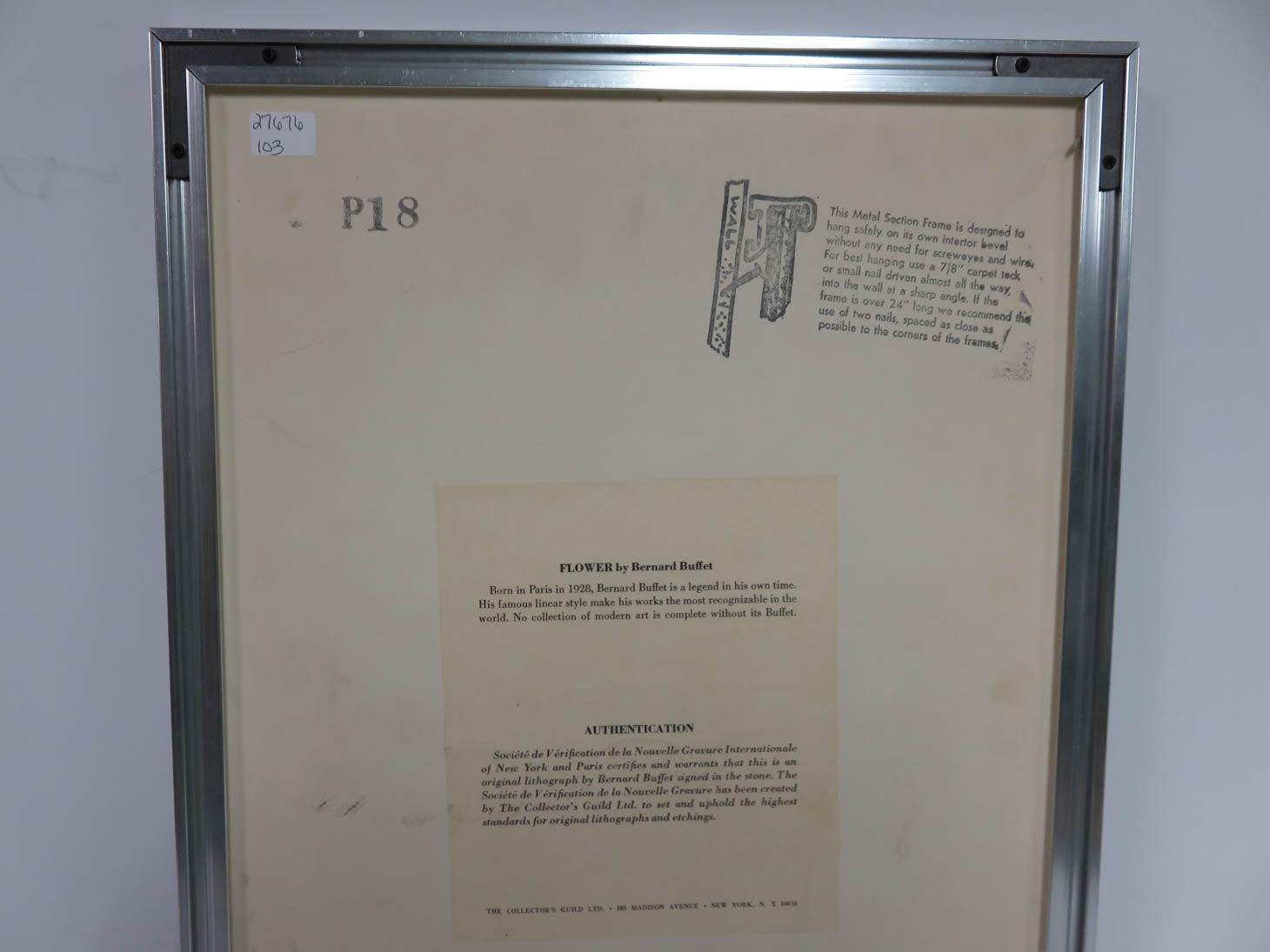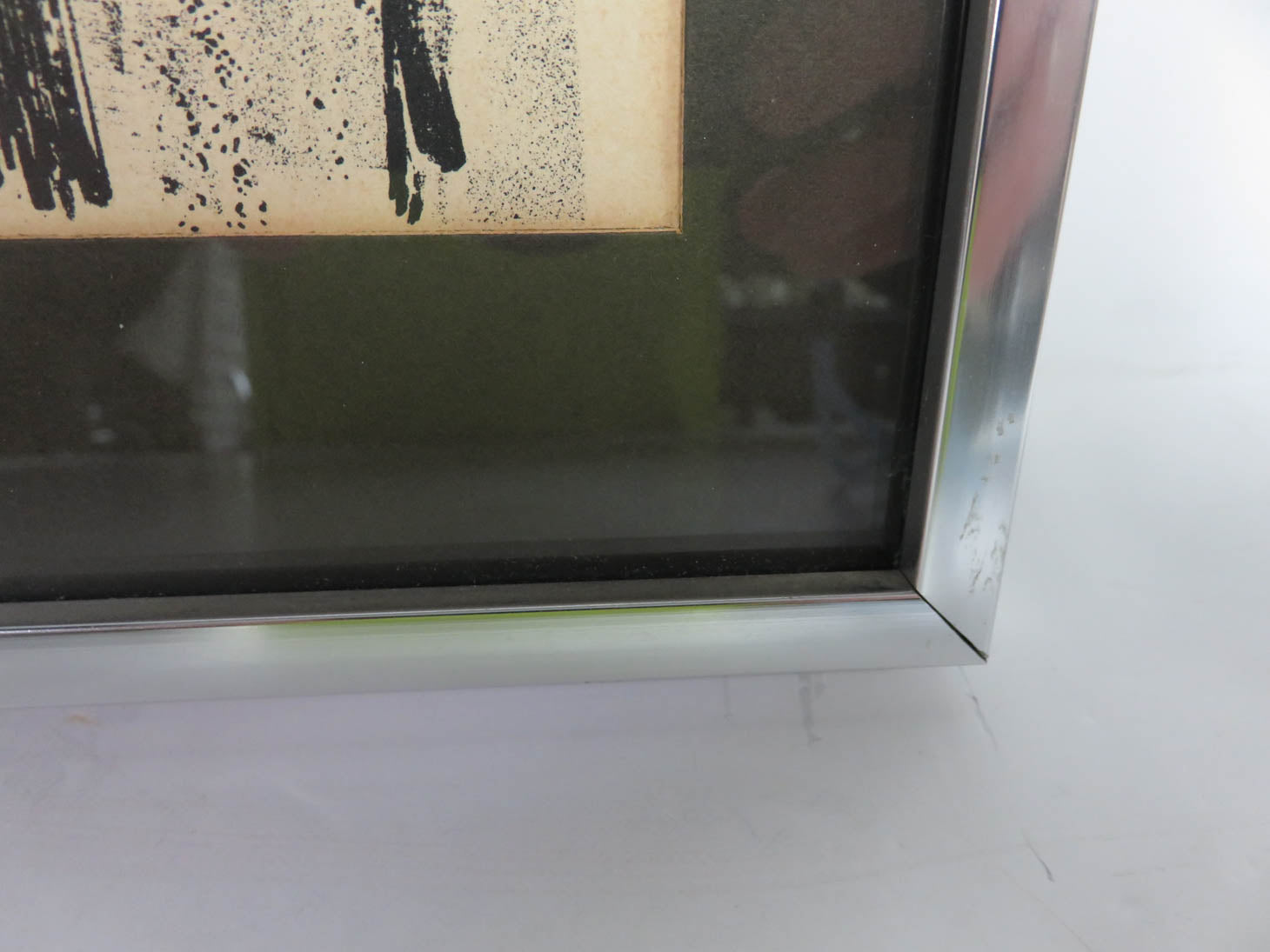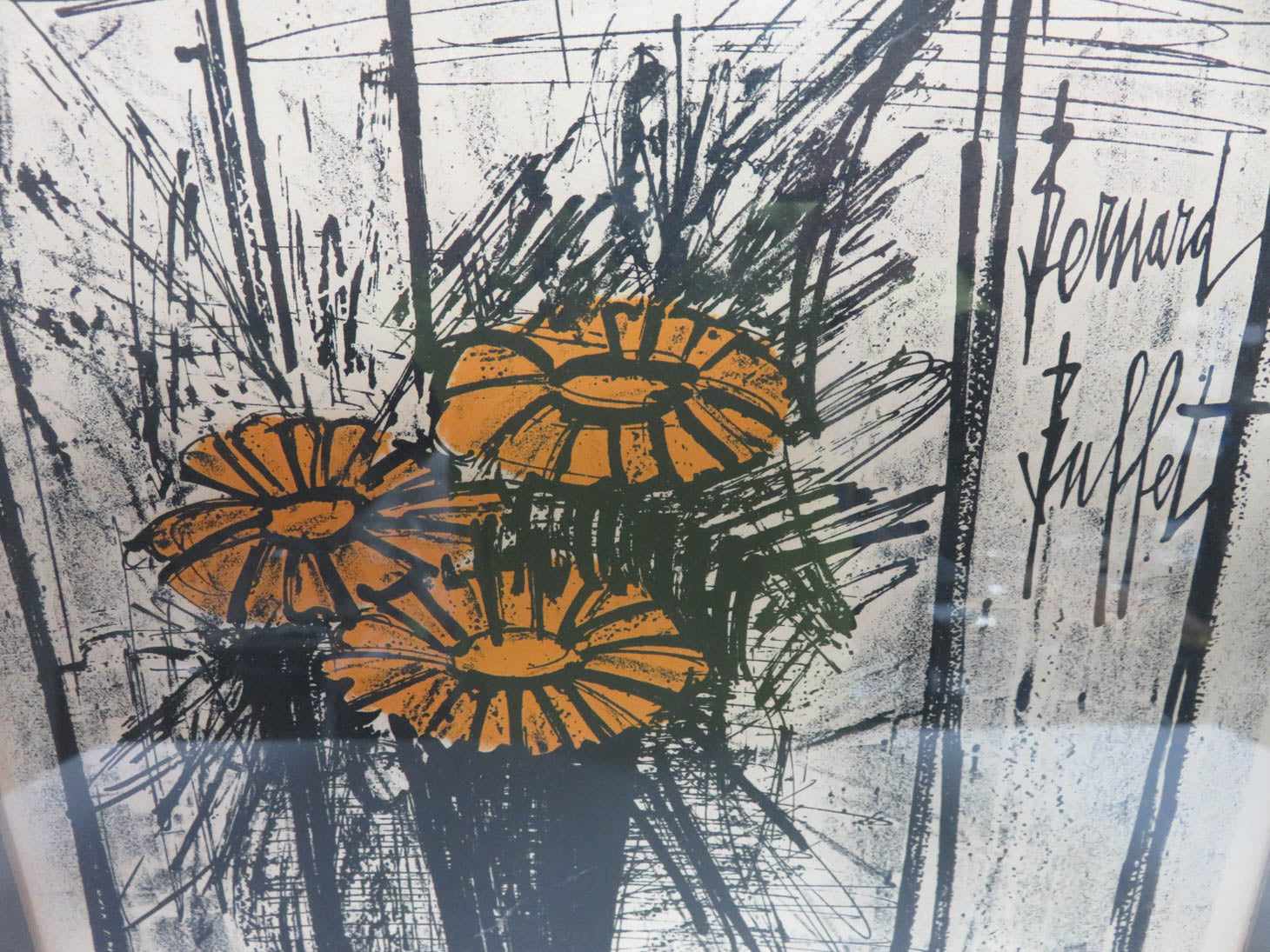 "Flower" by Bernard Buffet, orange daisies in black vase in silver metal frame