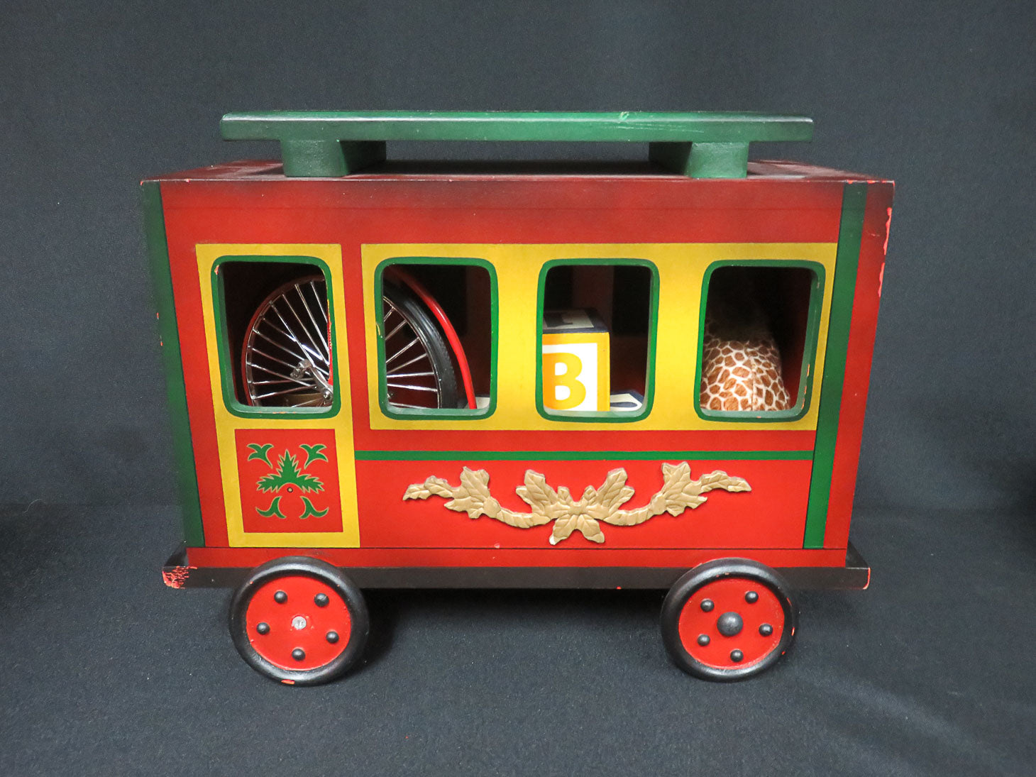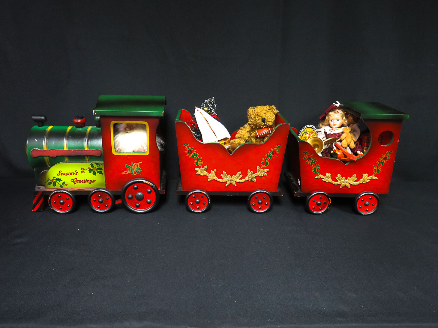 Four painted cars holding various toys with Santa driving engine. Some toys need some TLC and wear to paint.