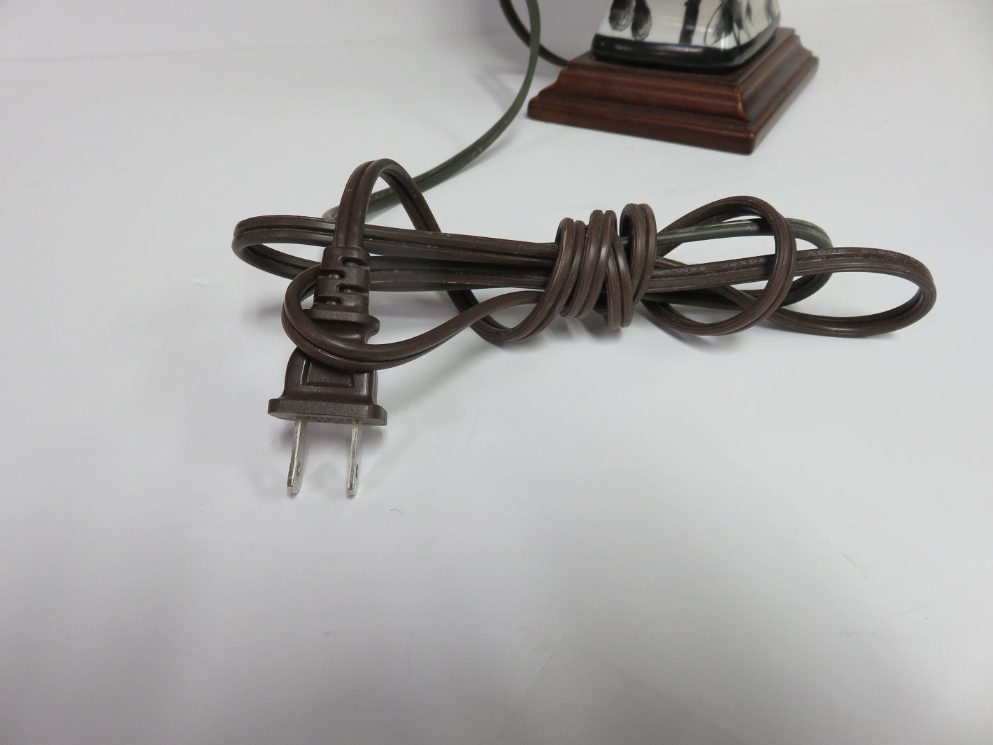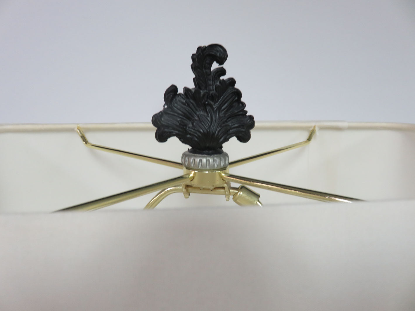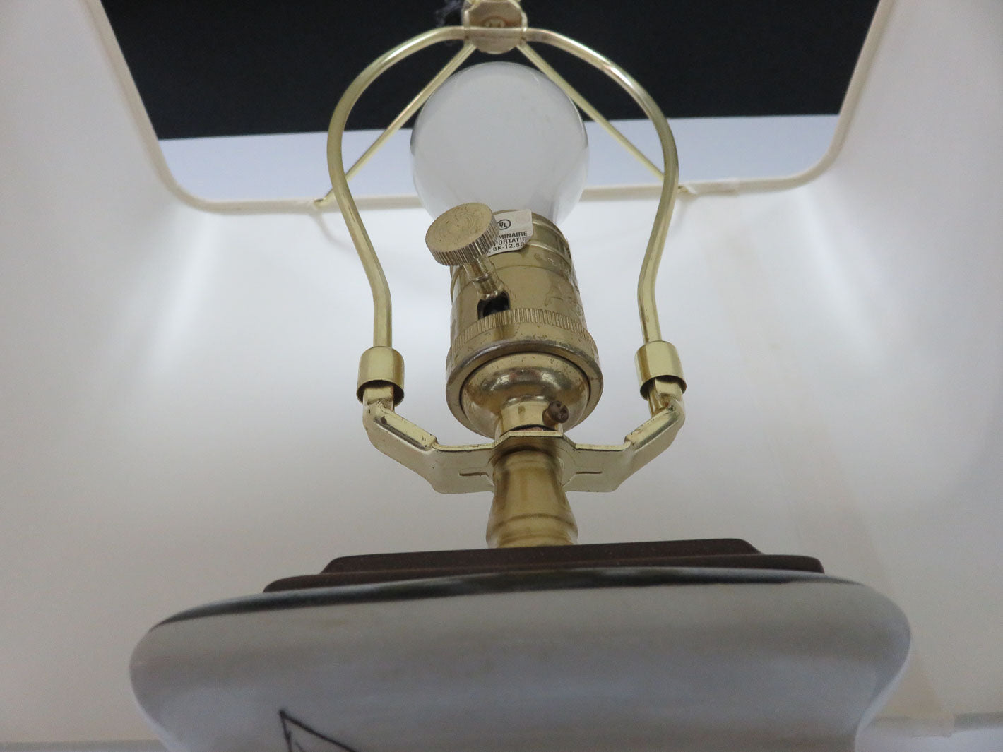 By Perfection Lamp Company, white ceramic with black peacocks and floral, on wood base, leaf finial, rectangular shade.