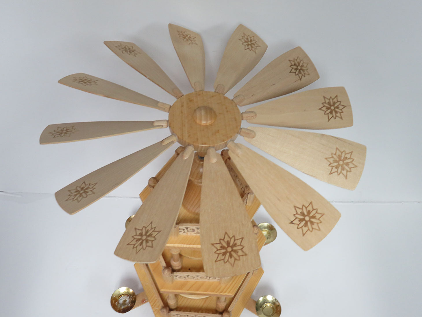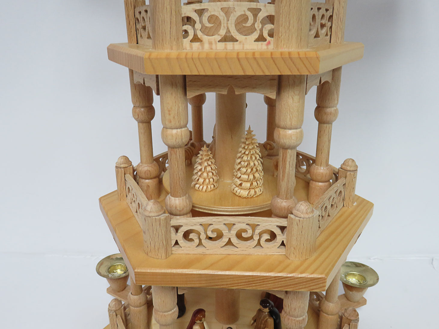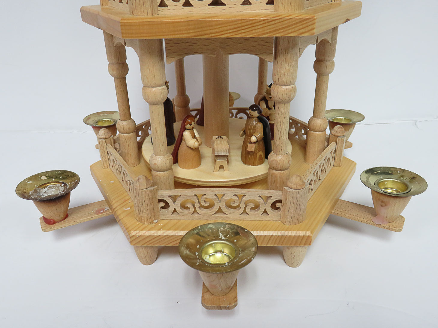 Item Number: 18665-62 Handmade in the Erzgebirge region of Germany, natural wood, two tiers, holds six candles, interiors rotate with lit candles. 12.5" x 16.5" H