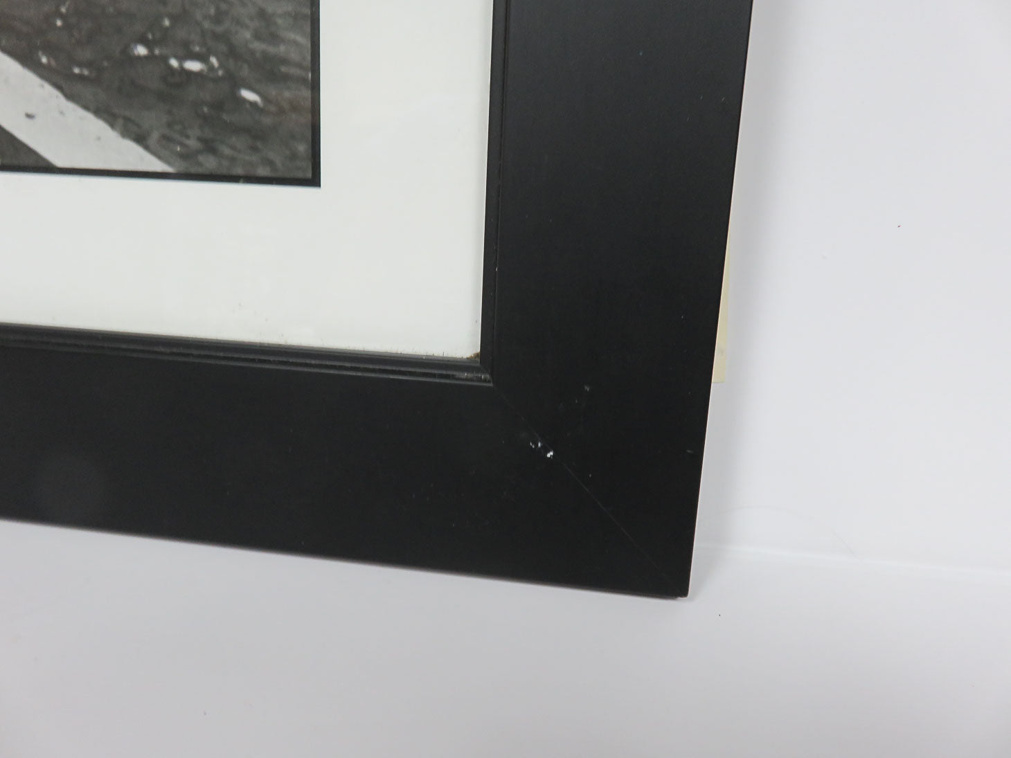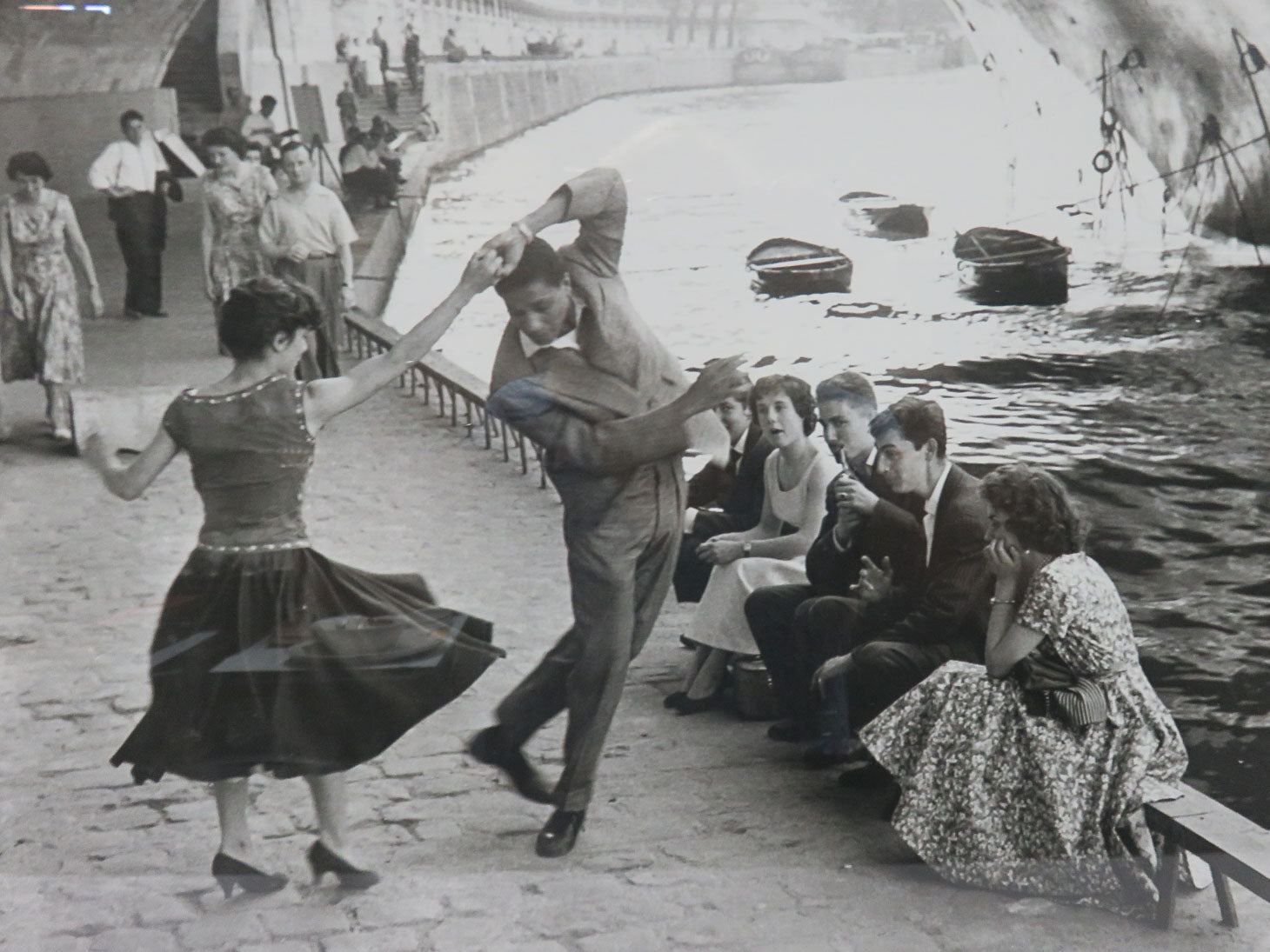 "Rock n' Roll in Paris, 1950" black and white depicting couple dancing along the river banks. In black frame