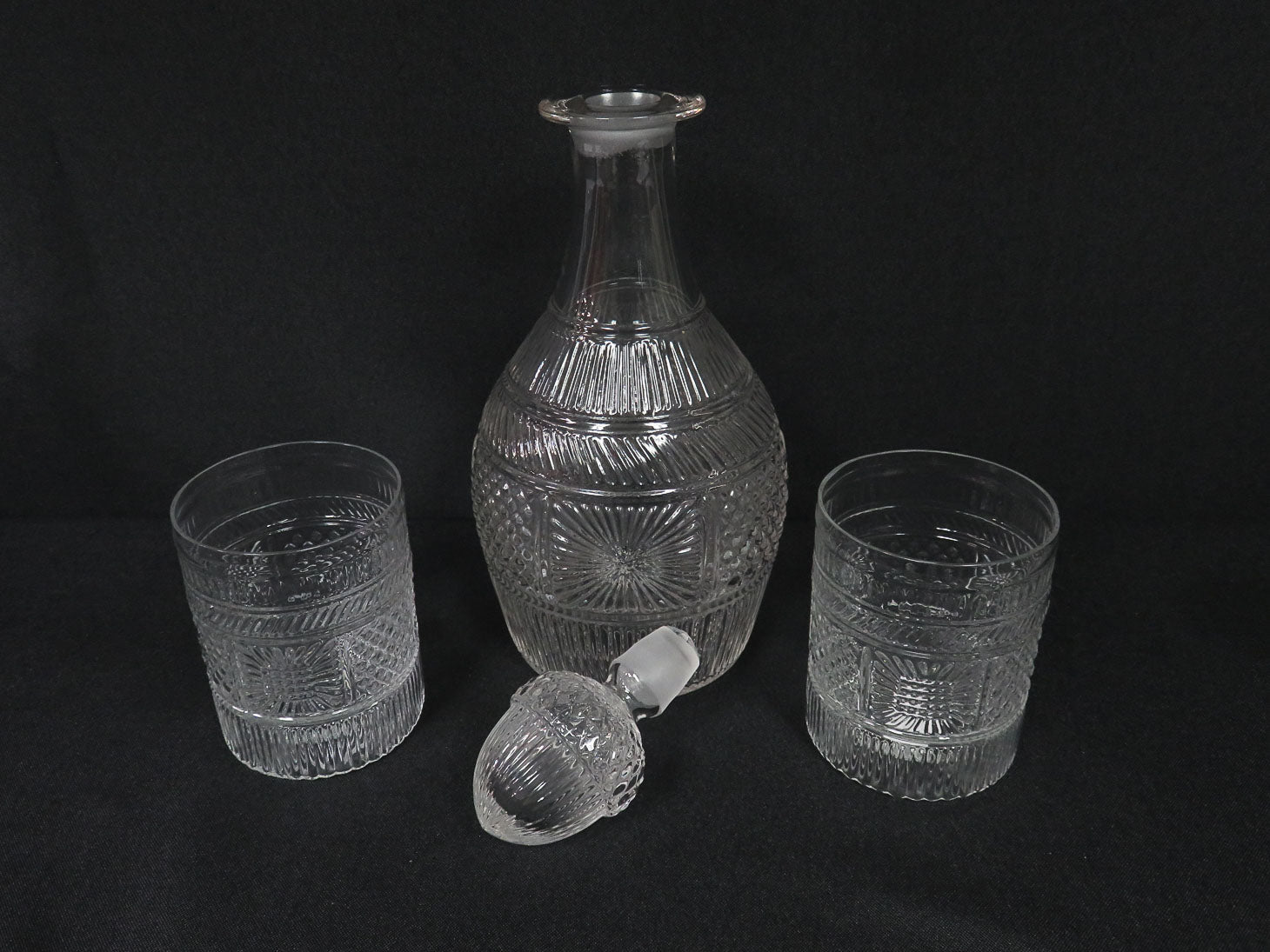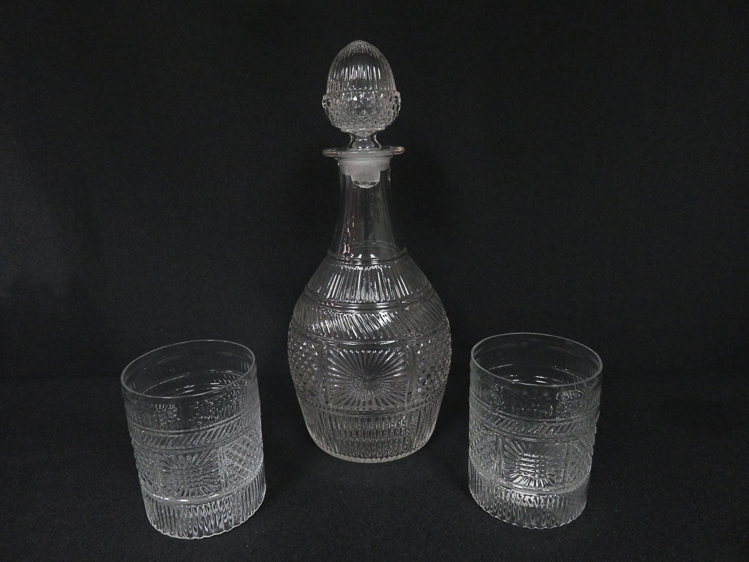 Item Number: 28813-9 Decanter and 2 glasses. Stopped has acorn shape. Metropolitan Museum of Art Boston. 10.5" H decanter, 3.5" H