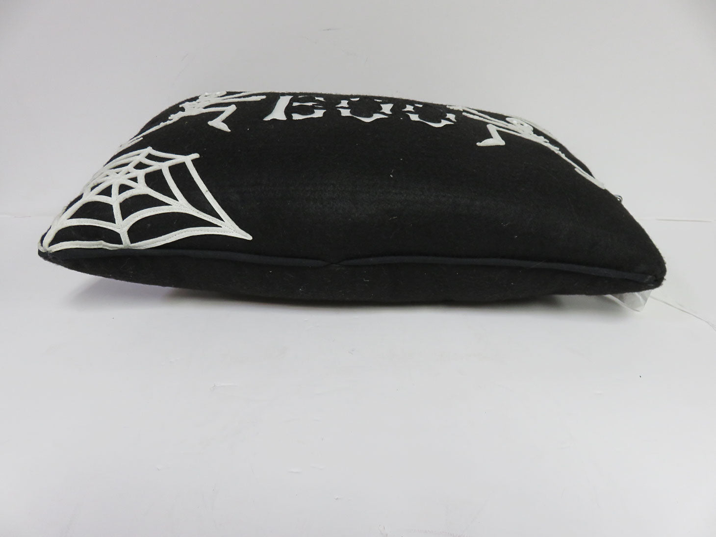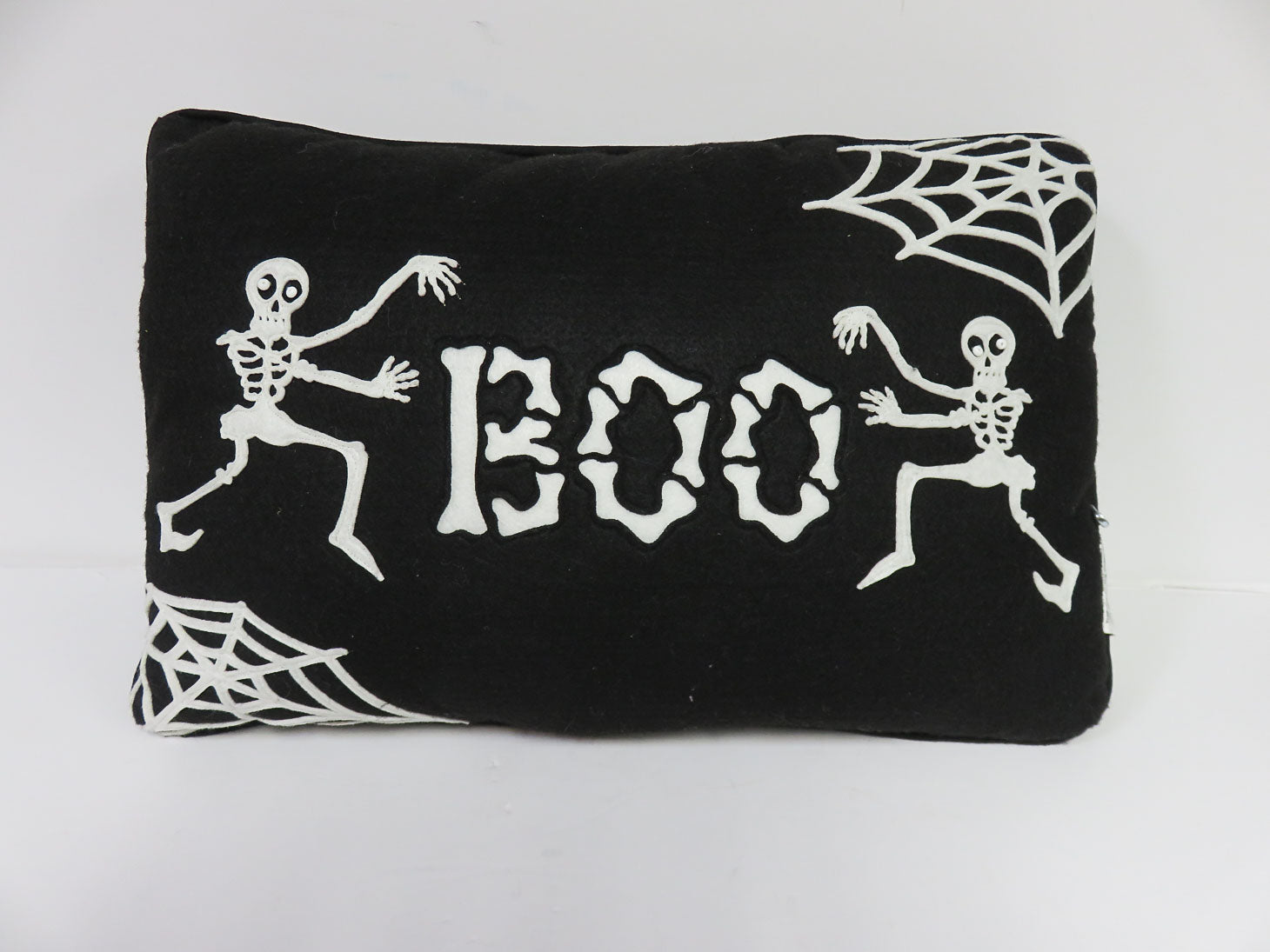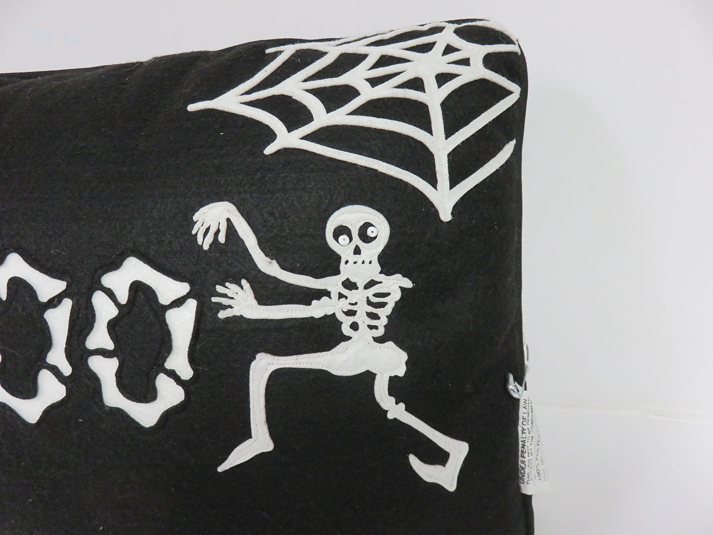 By "Bethany Lowe", rectangular, black, with white skeletons, web, and "Boo", ploy filled