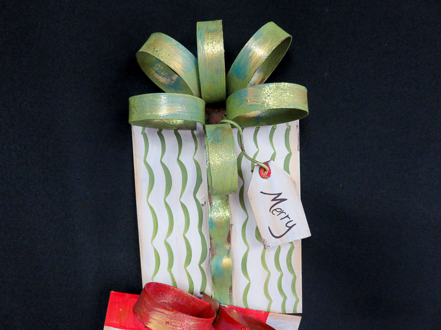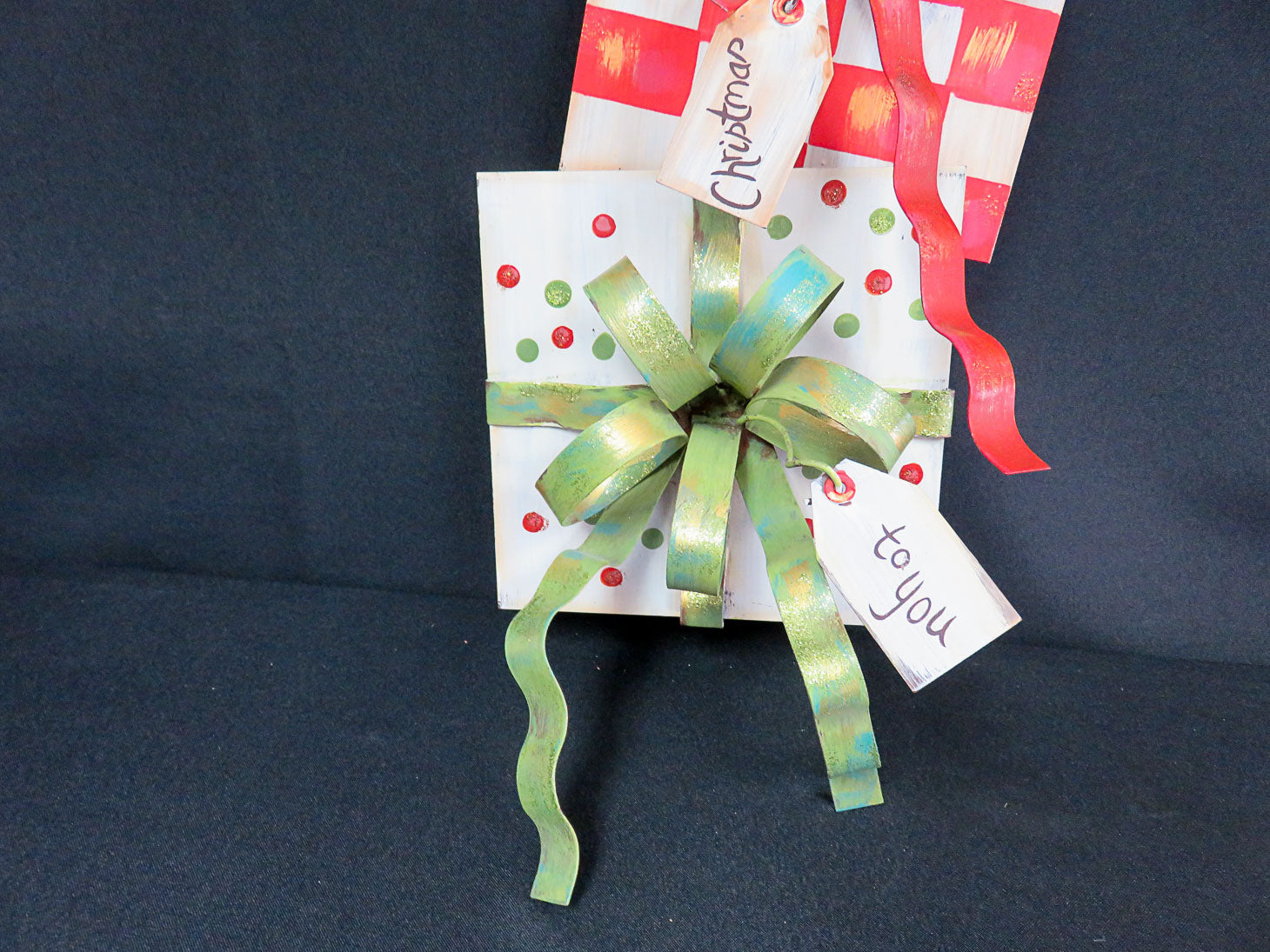 Three stacking presents with bows and gift tags, multi colored, "Merry Christmas To You"