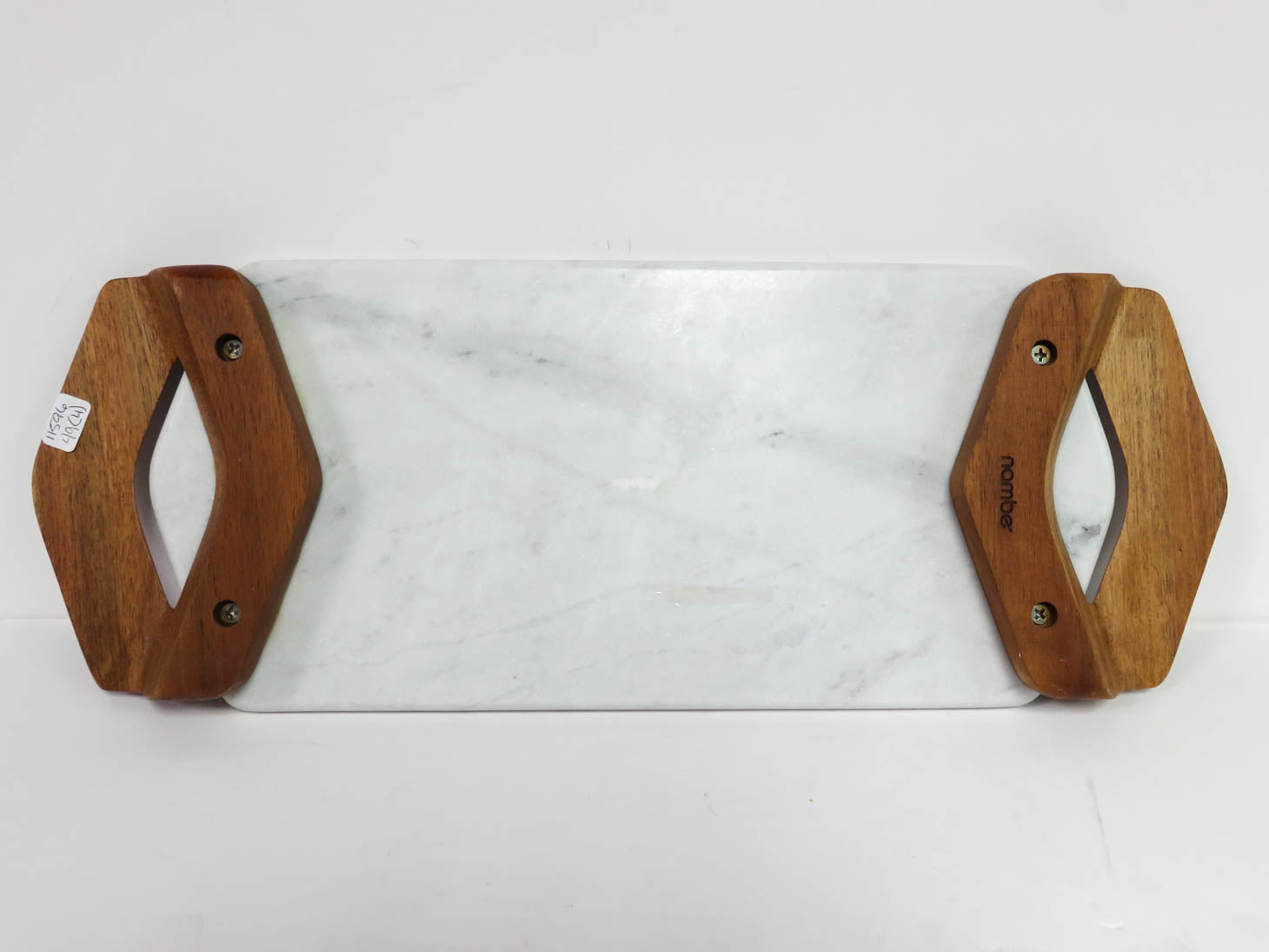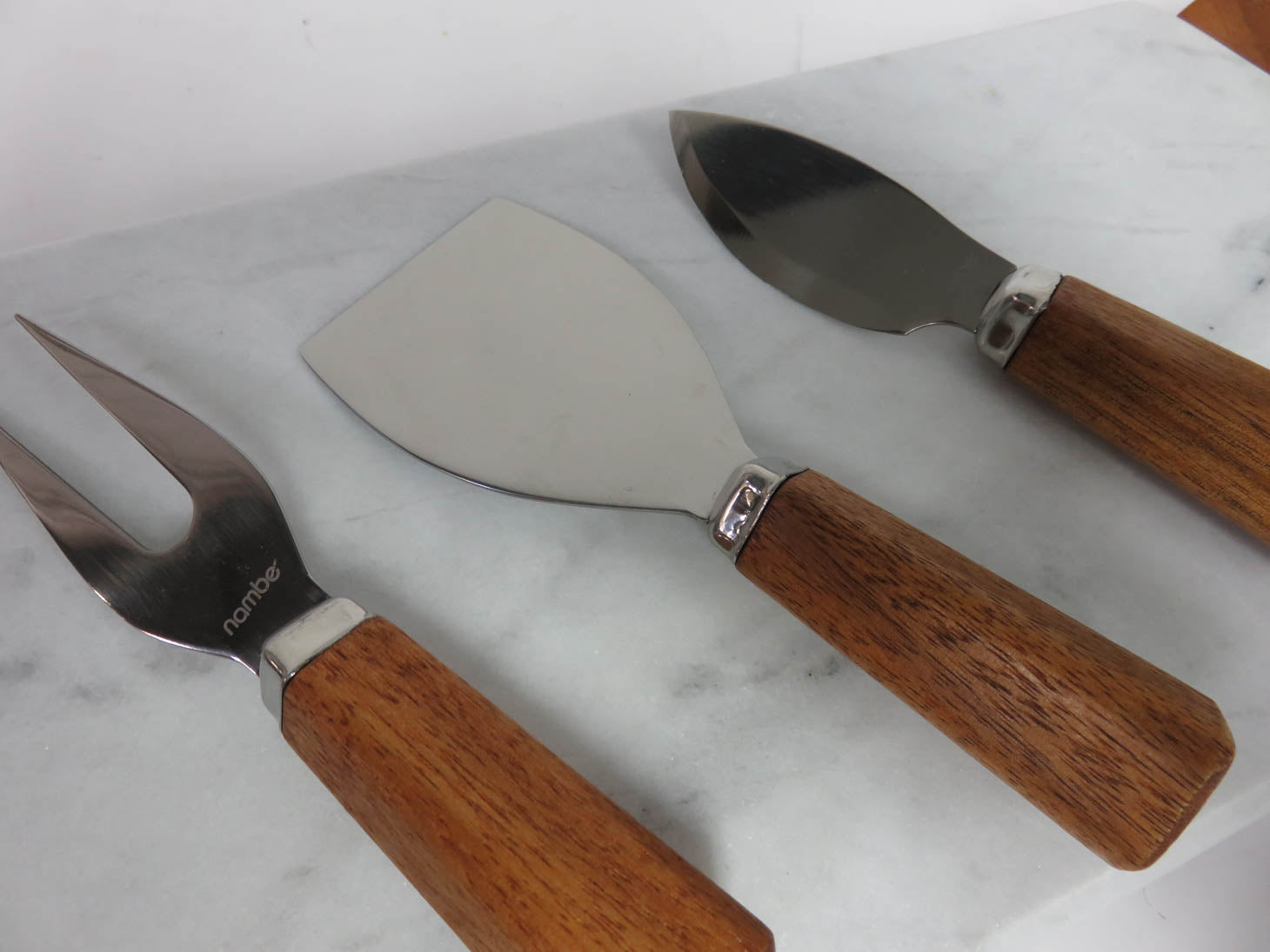 "Chevron Cheese Tray with Knives" white marble with brown wood feet, 3 knives, 4 pc total, Box in Office