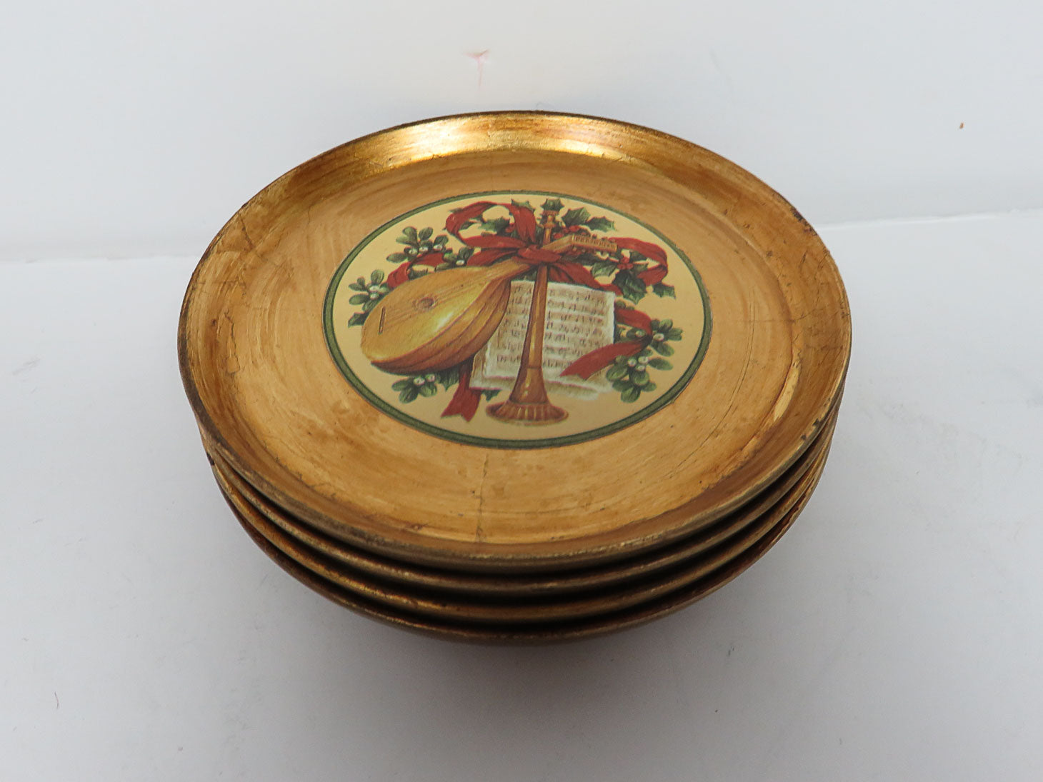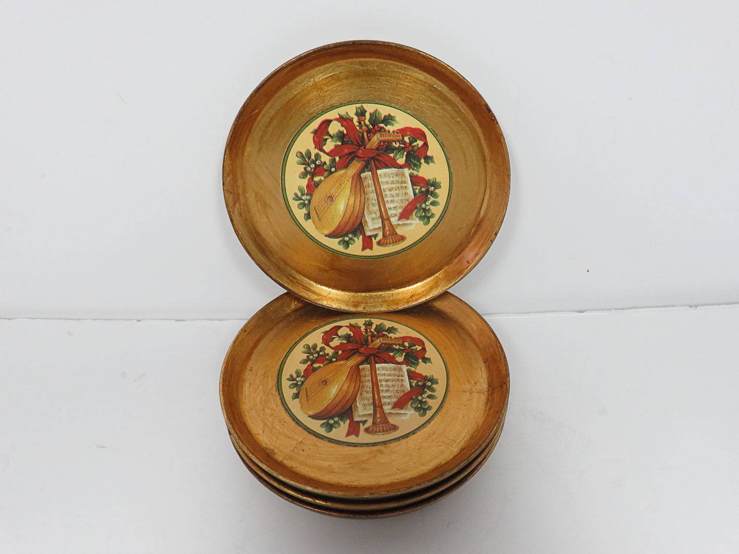 Set of 4, round, brushed gold, lute and holly berries with red ribbon