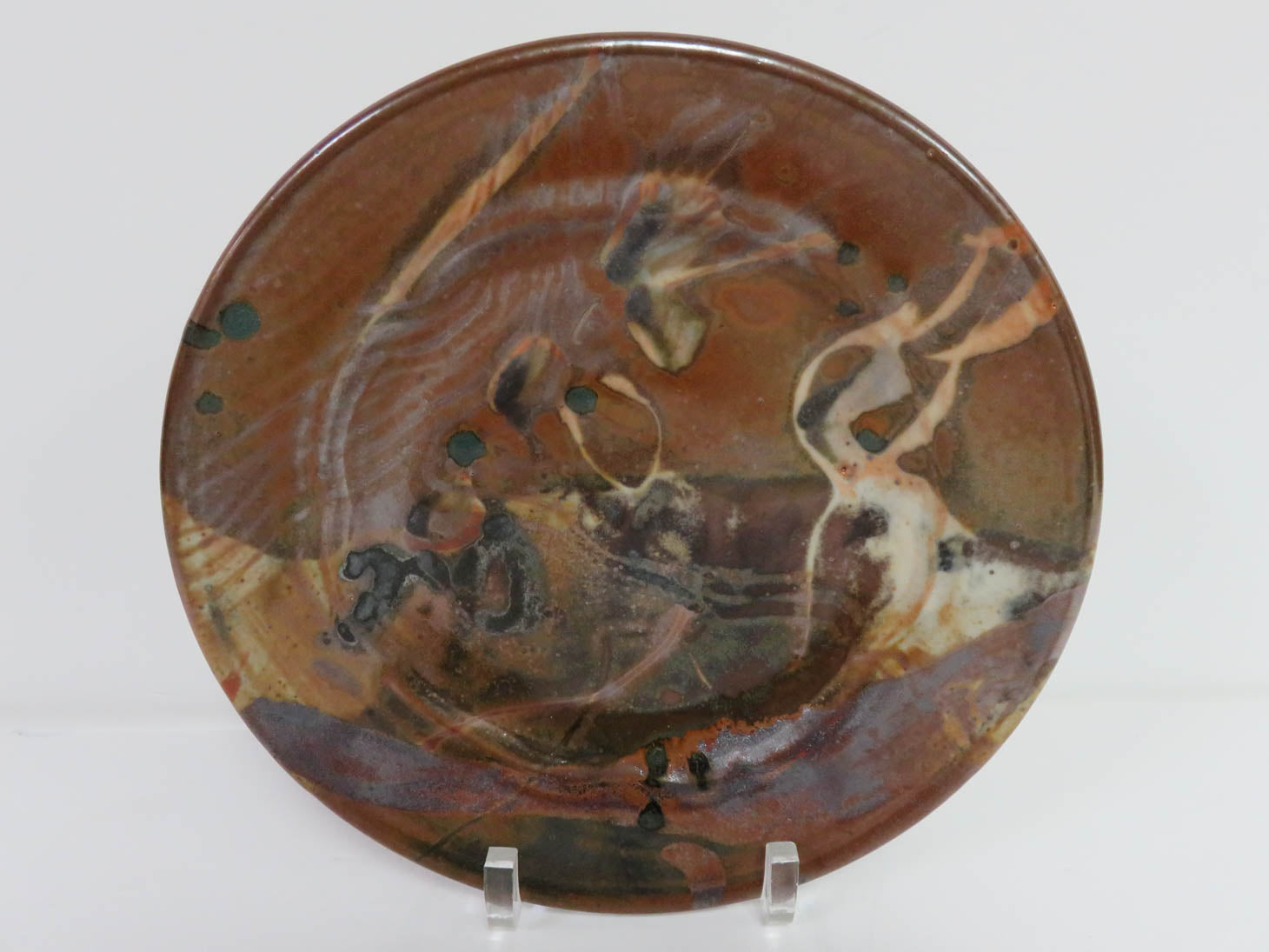 Plum Tree Pottery glazed stoneware in rust with earth tones, unique. American (1938-2017).