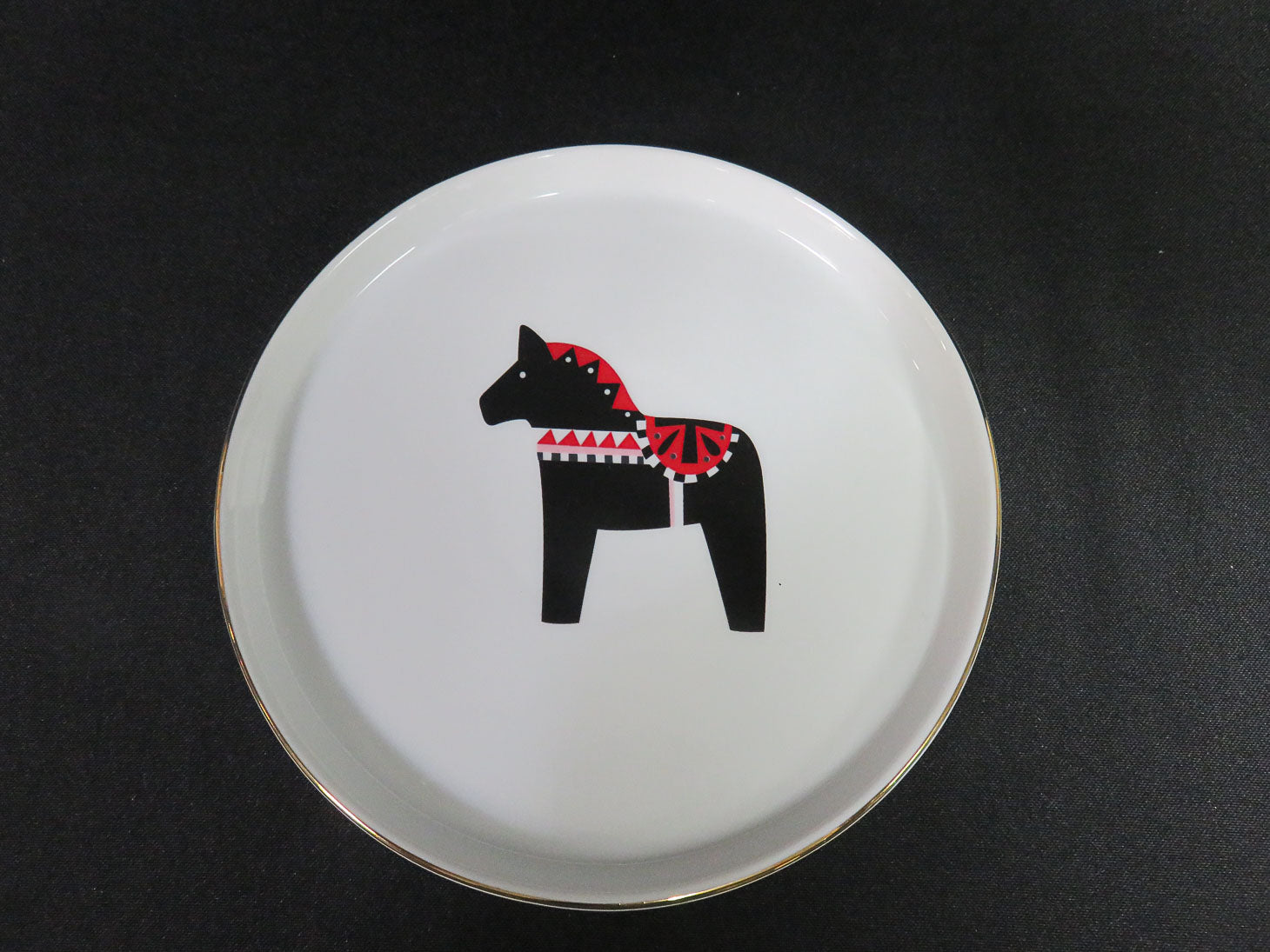 Item Number: 7738-90 Set of 4, white with various black, red & gold holiday decorations by Project 62. 7" D