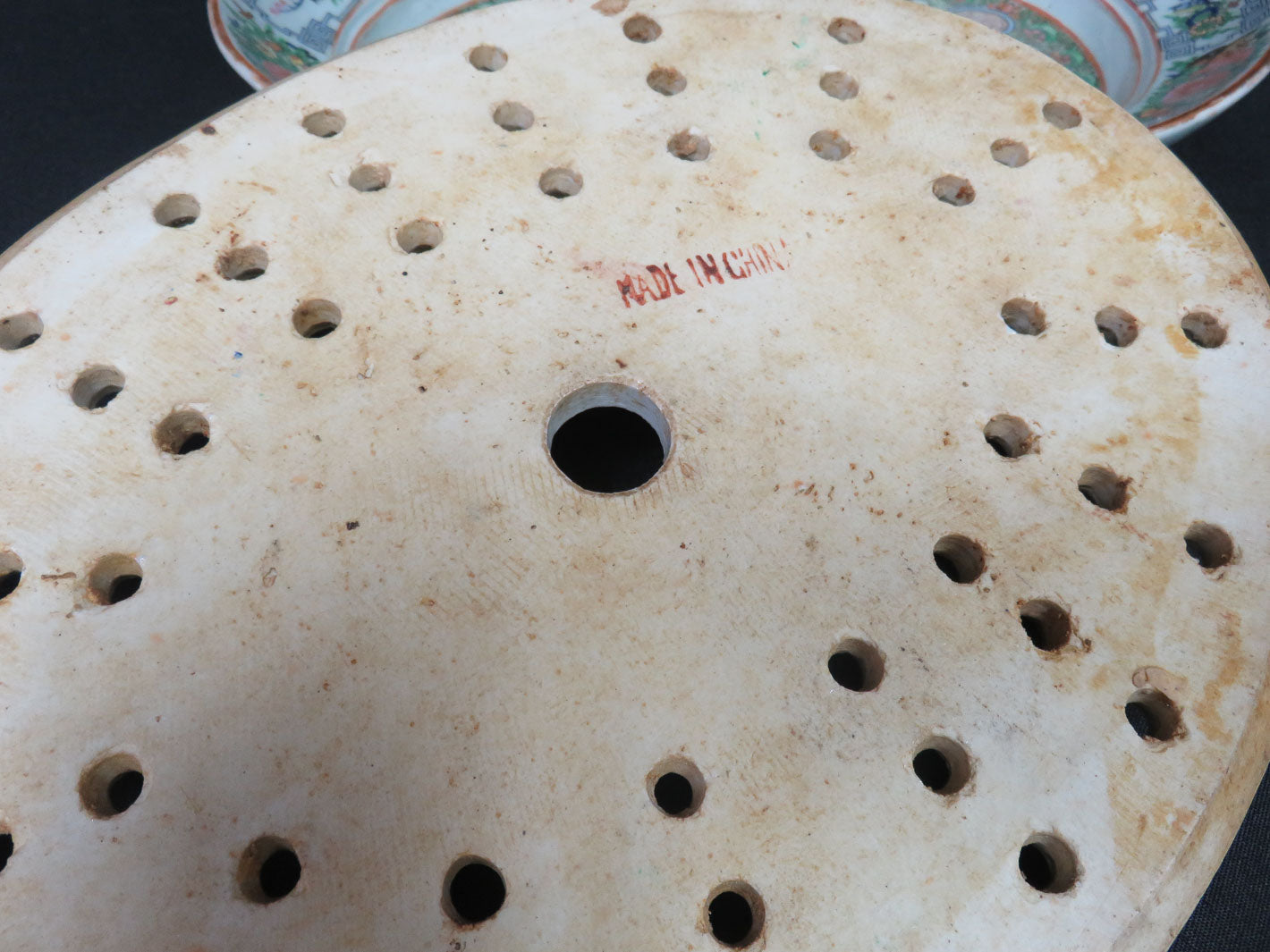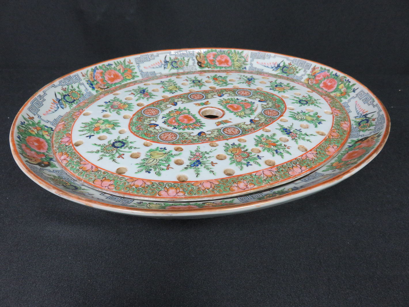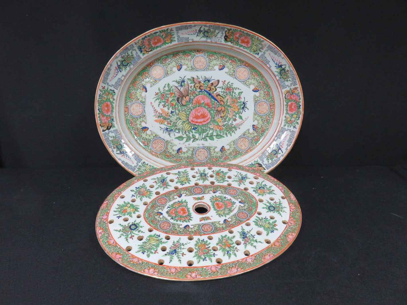 Item Number: 29856-6 Canton platter with matching mazarine (strainer), oval with green, blue and pink floral and butterfly design (2 pcs) 15.5" x 12.5"