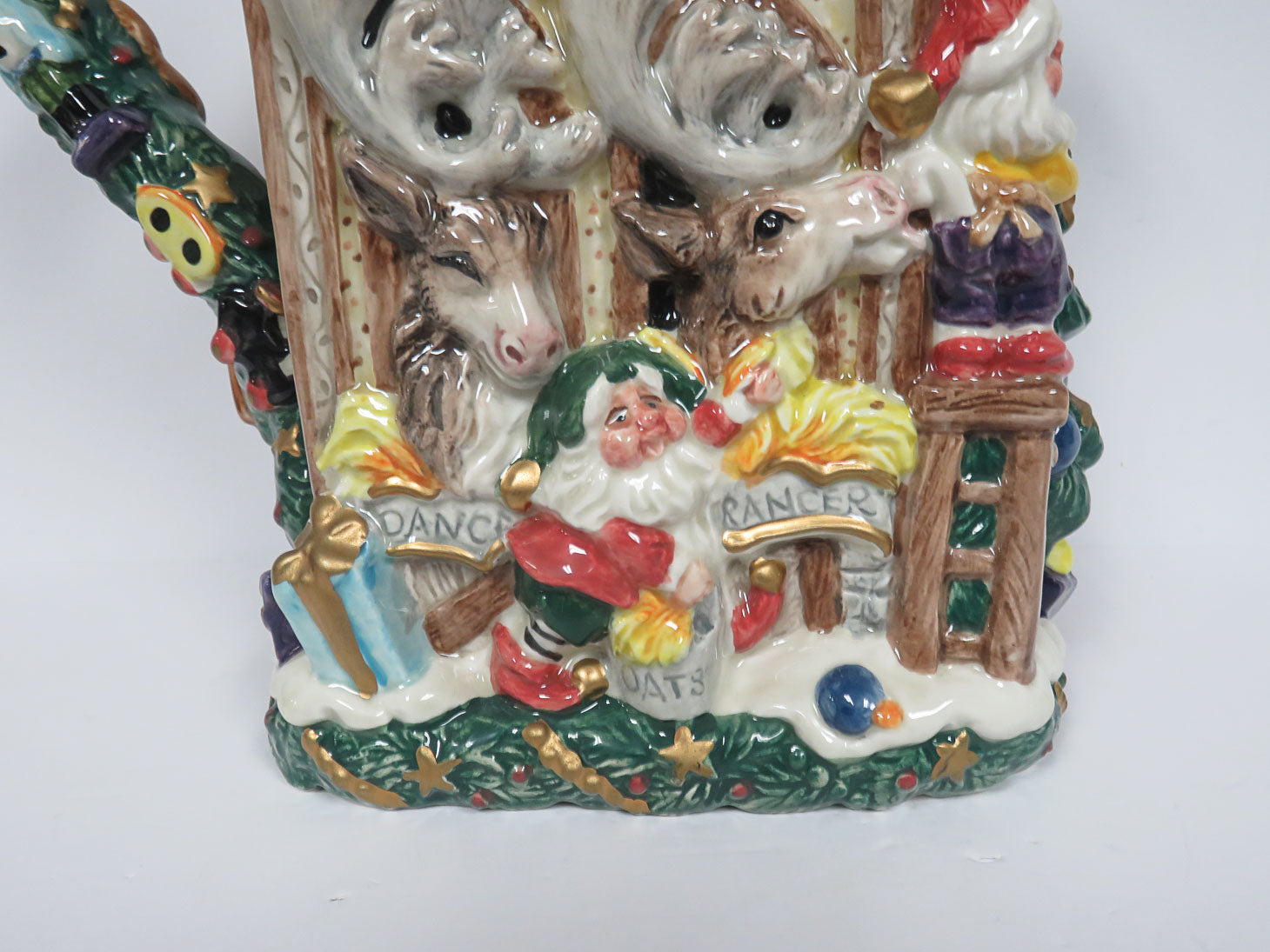Santa's workshop pitcher, hand painted featuring Santa, elves and toys.
