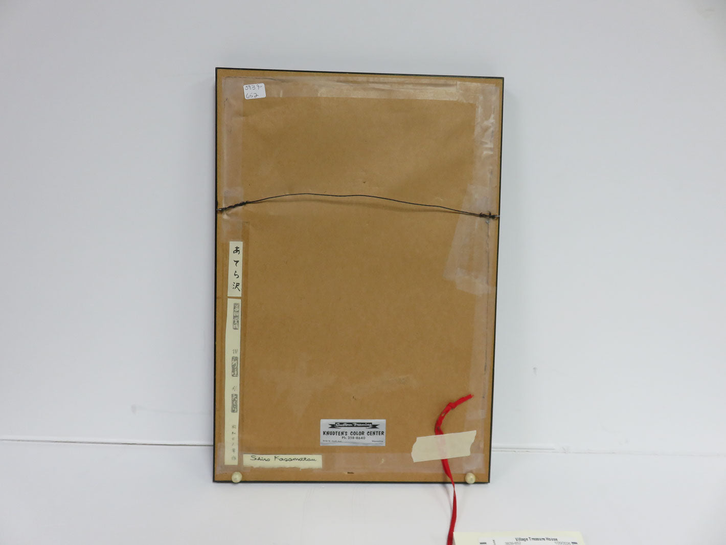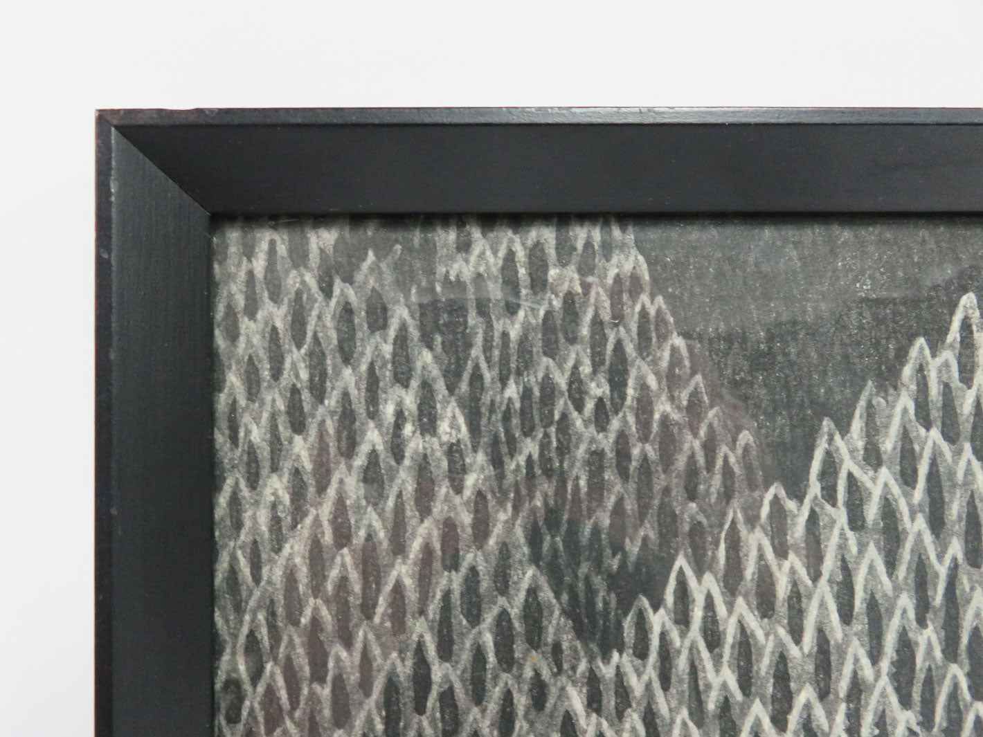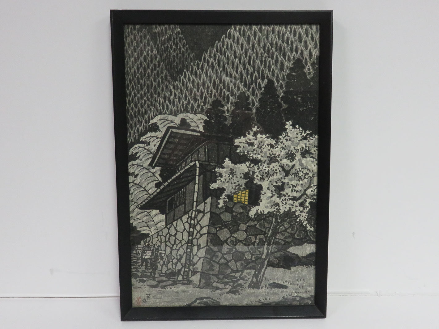 By Shiro Kasamatsu, "Mountain Scene" farmers carrying wood in black frame. Black & white with signature yellow window.