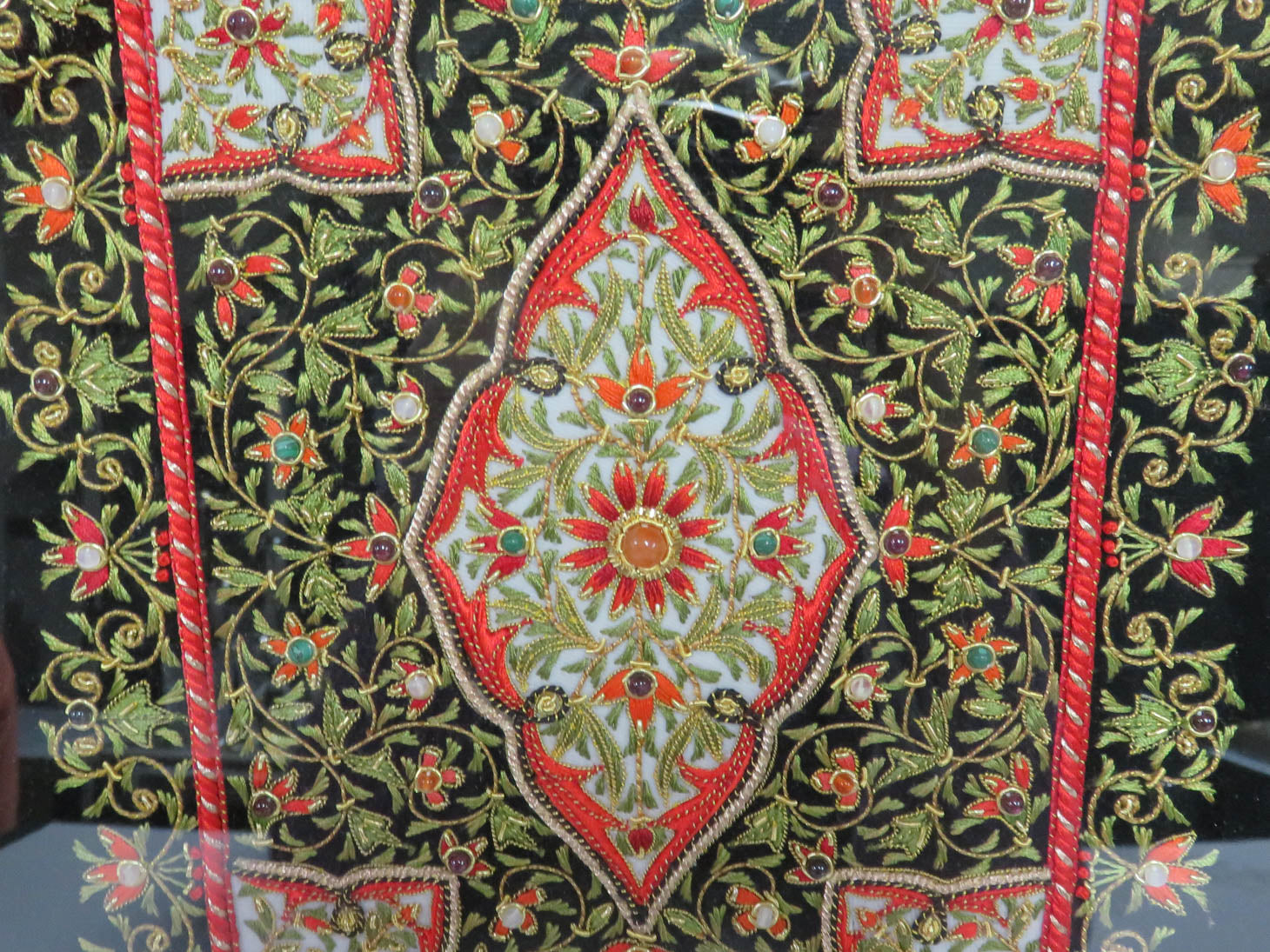 Intricately beaded Persian design with gold thread, gem stones and fringe