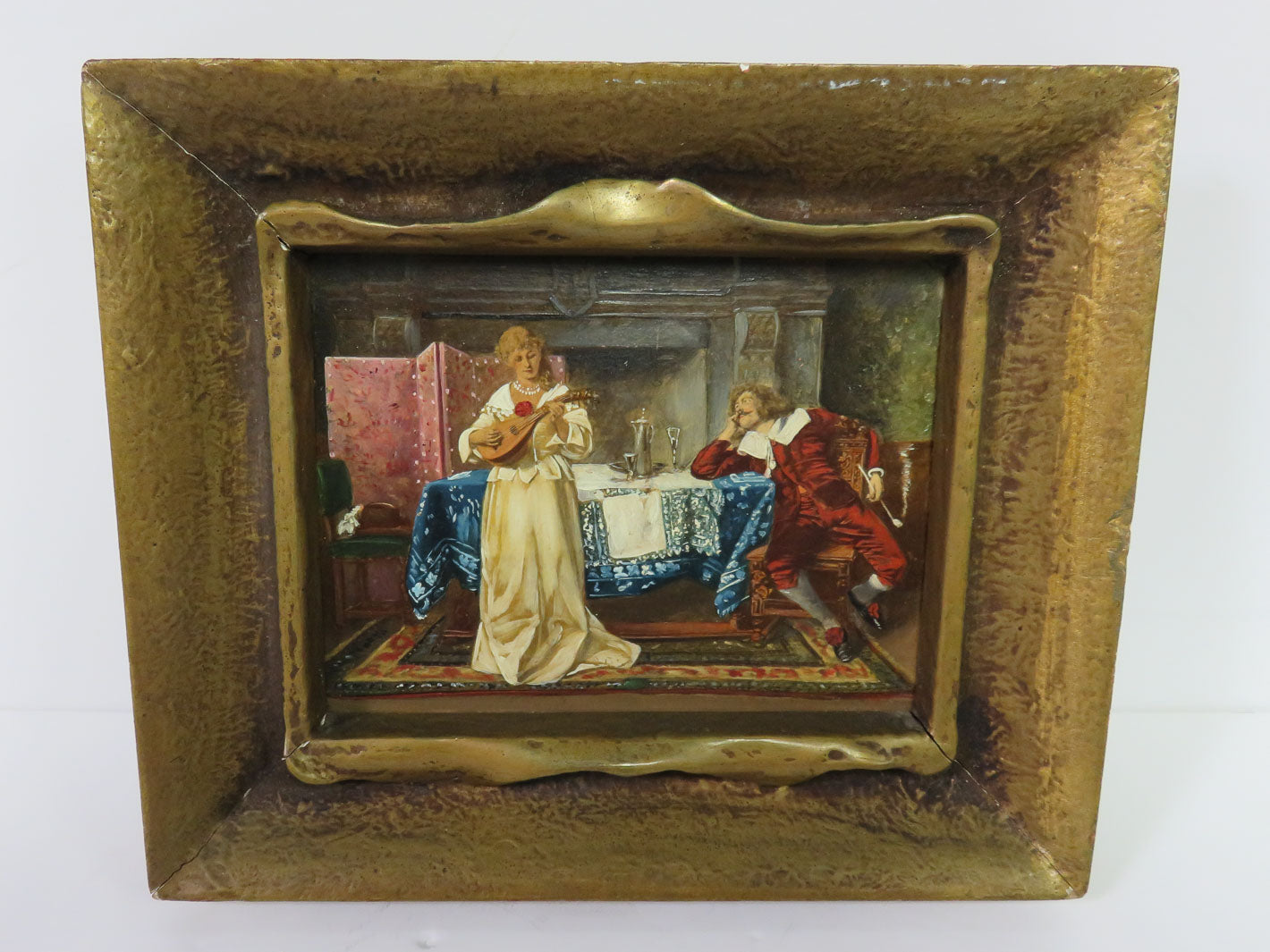 Original oil on wood, "Nach Tisch", man watching woman play mandolin, gold frame