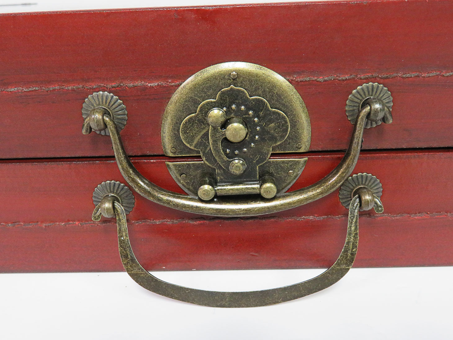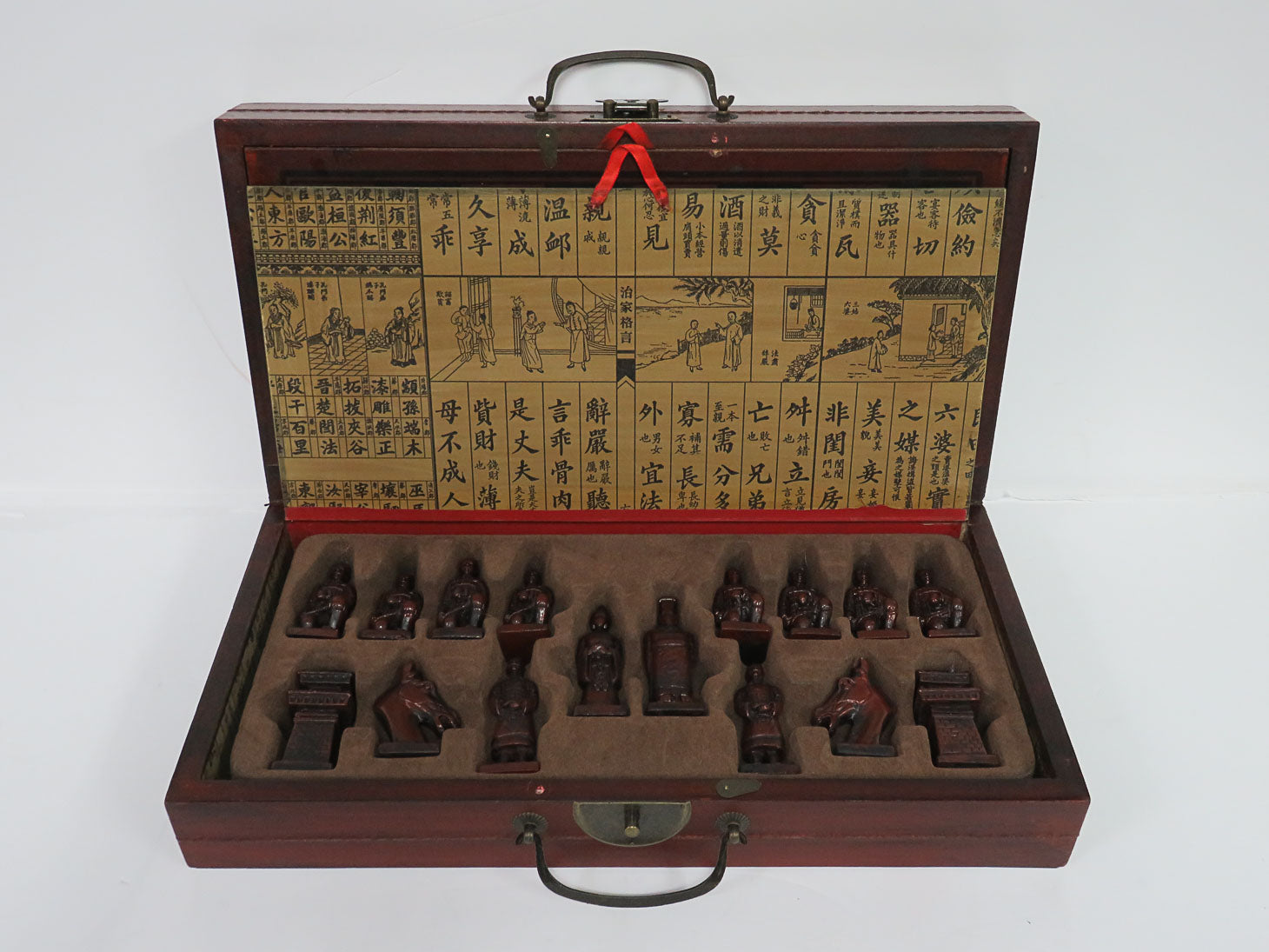 Item Number: 28877-31 Asian inspired chess set in hinged wood box with carved pieces and metal handle. 32 chess pieces and box. open: 17.25" x 16.5" x 2" closed: 18.5" x 8.25" x 4"