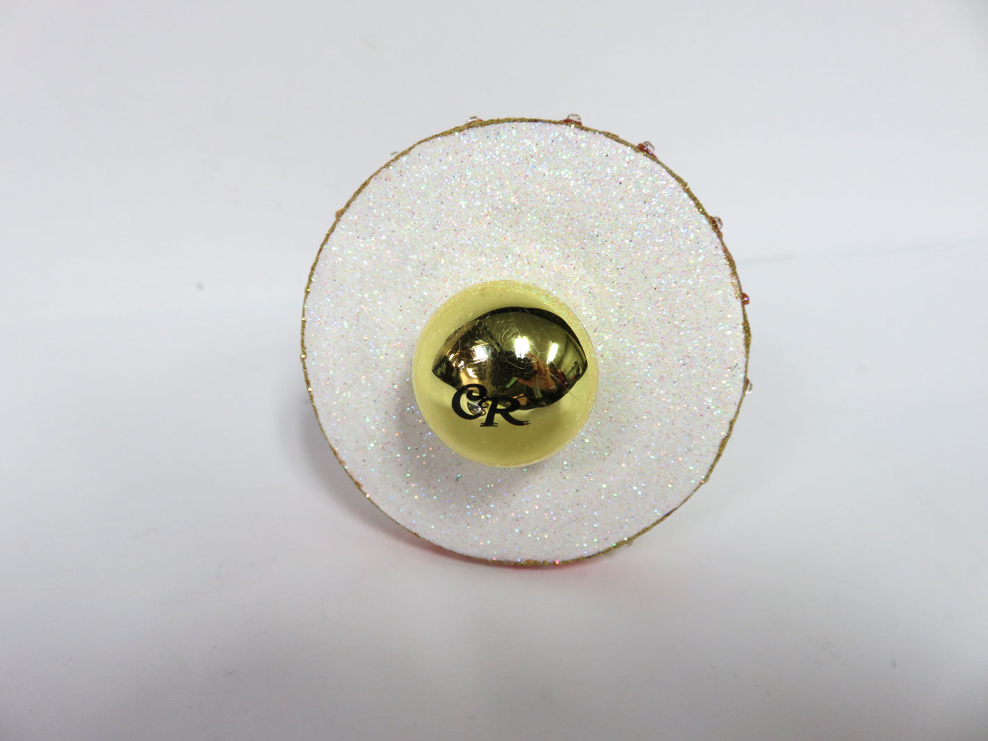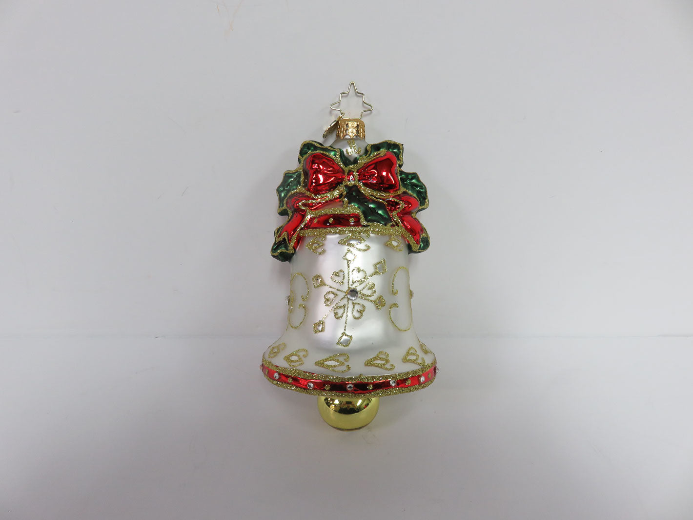 "Bow and Bell Golden Melodies" glamour ornament, white with gold scrolling, gold and green bows 6.5" H