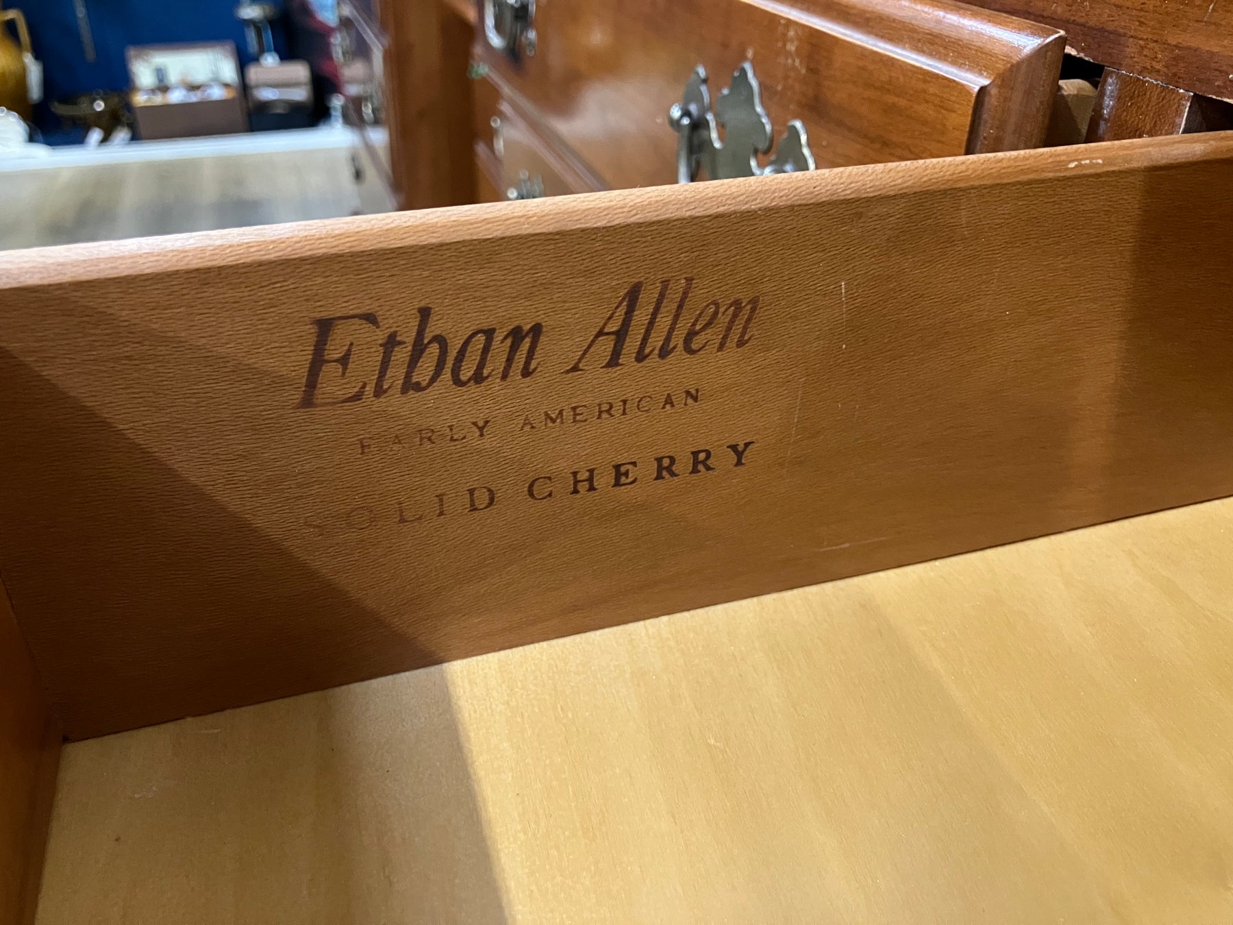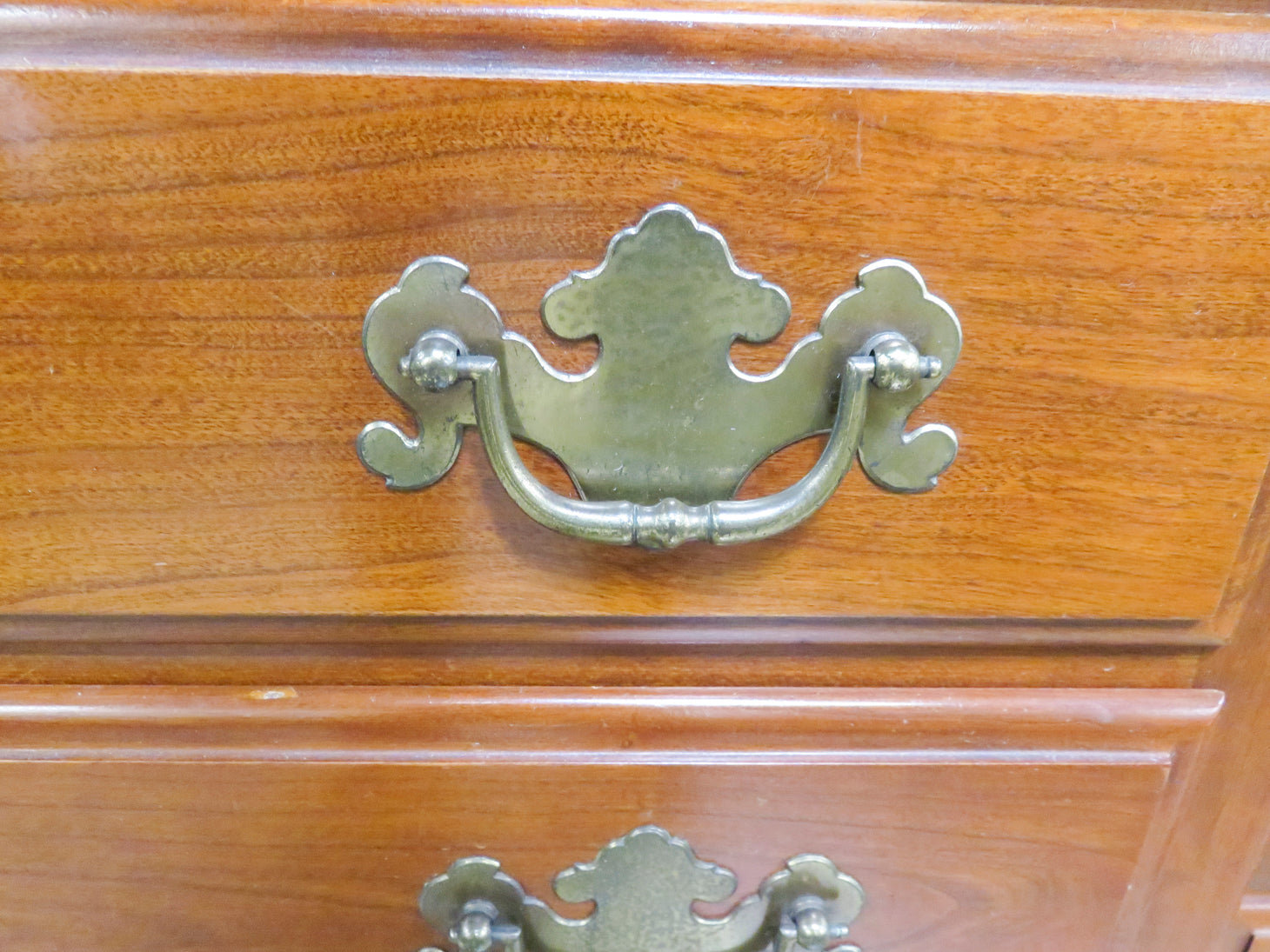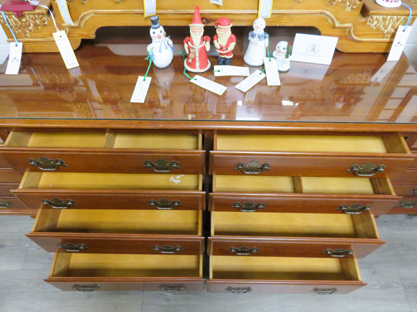 Early American, eight drawers with traditional brass hardware. Protective glass top included. Glass not attached.
