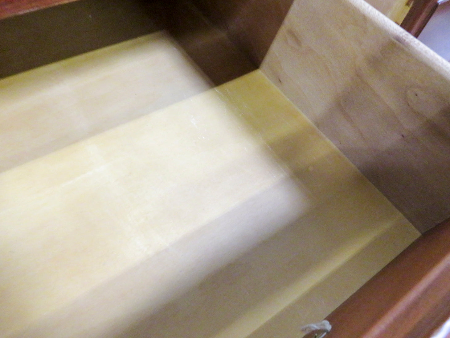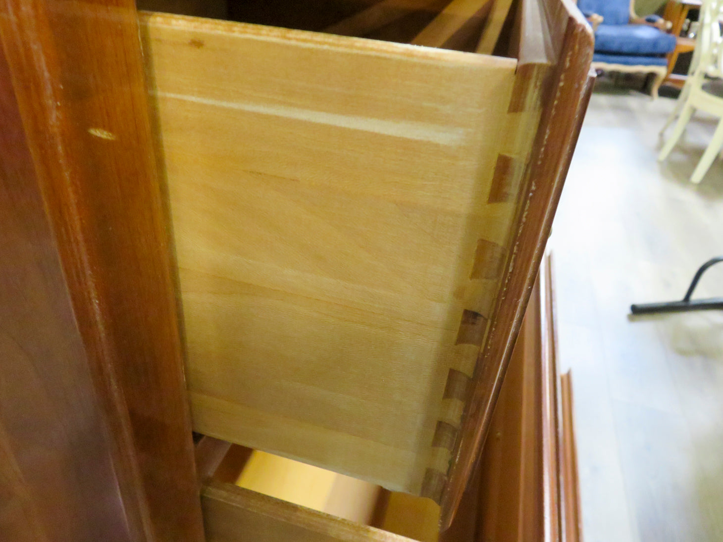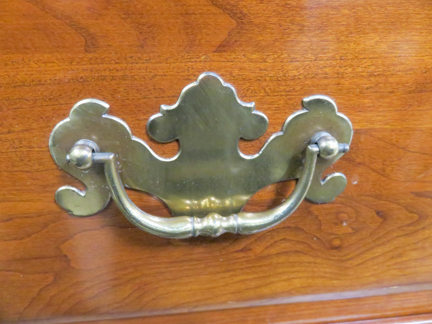 Early American, the six drawers have dovetail details with traditional brass hardware. Protective glass not attached.