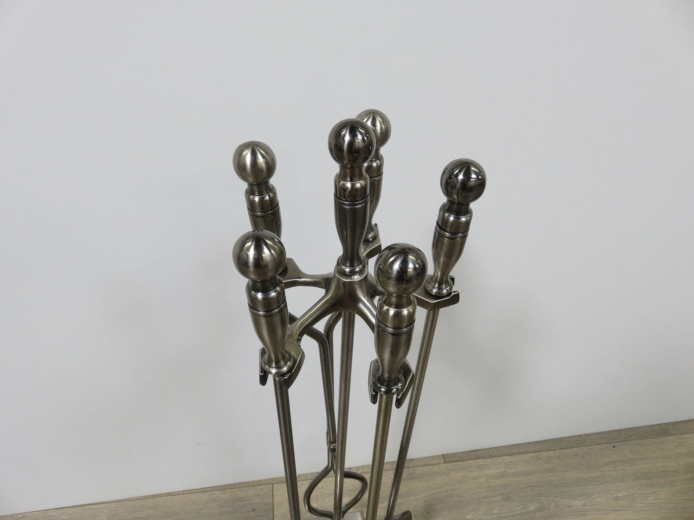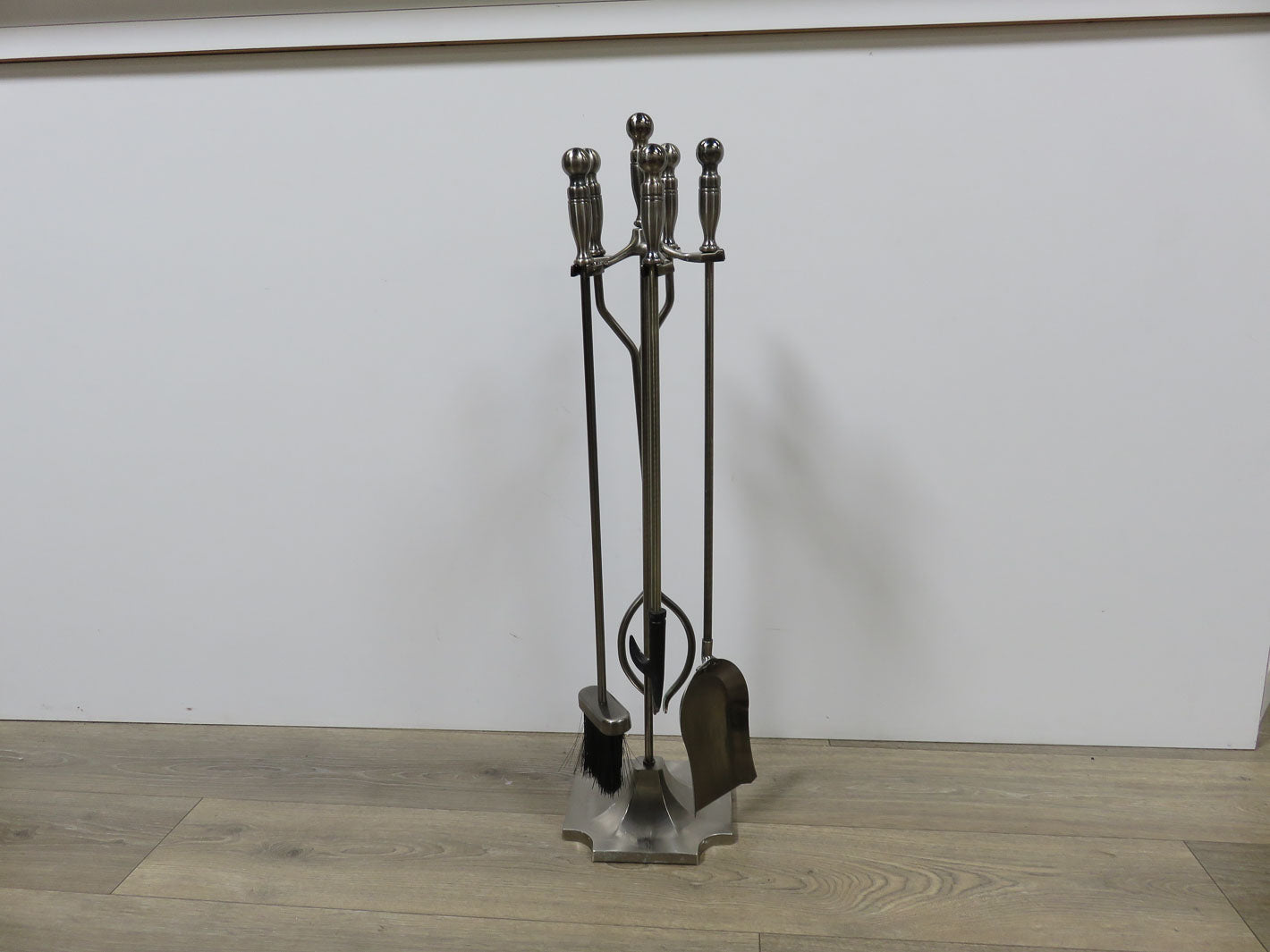 Brushesd pewtertone stand with 4 tools, some spots on base